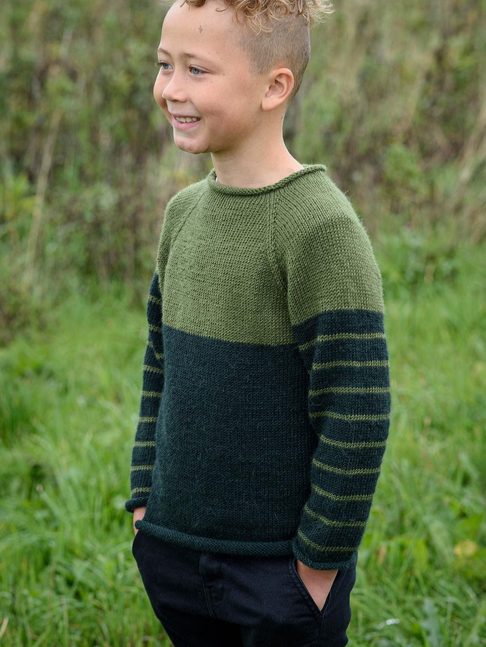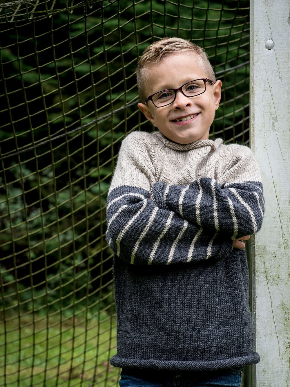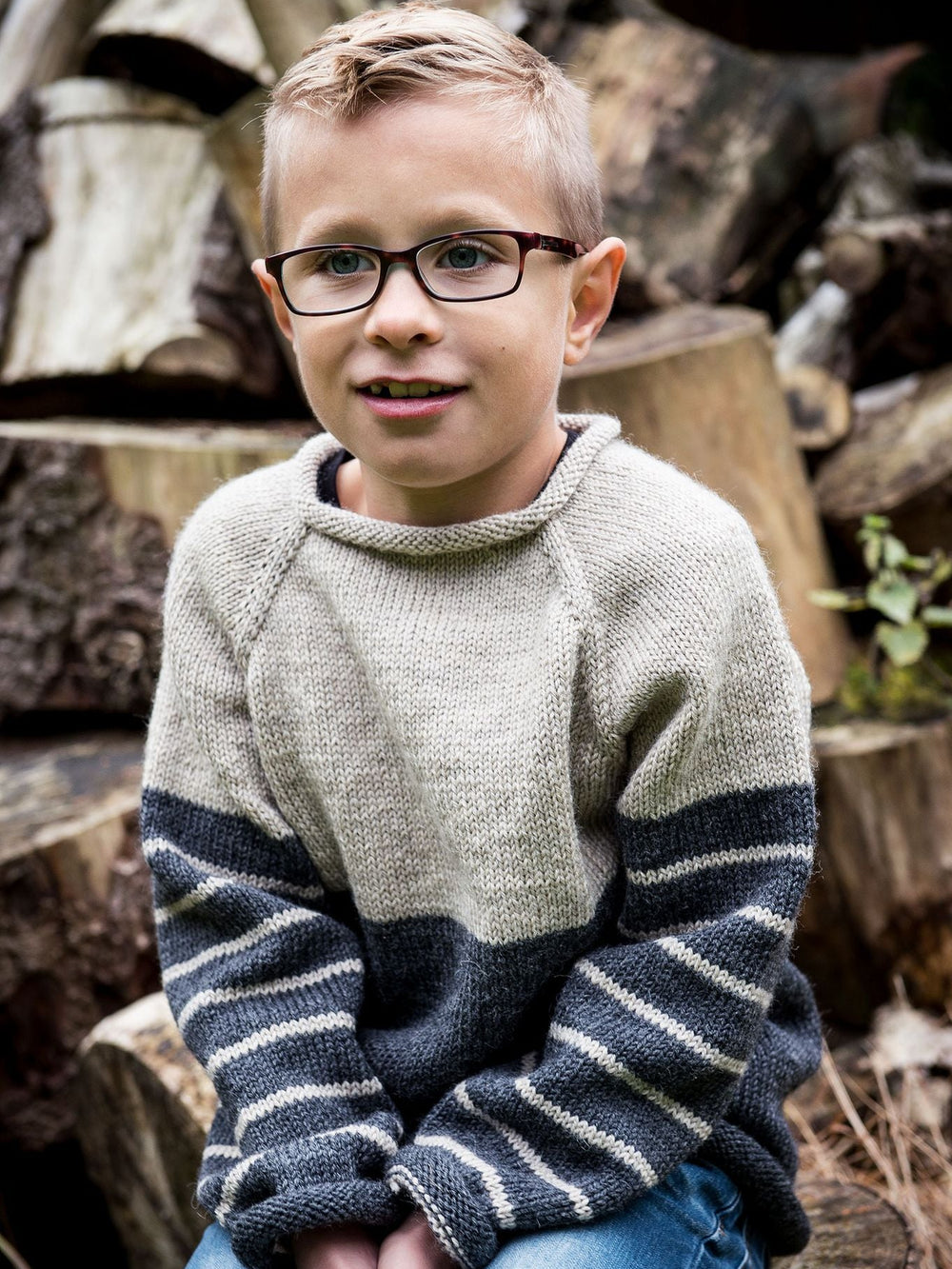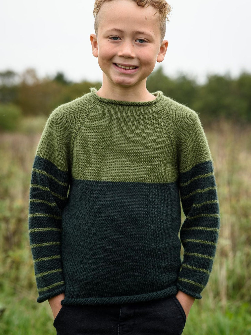 Den to-farvede sweater er helt perfekt til barnet, som gerne vil have fart over feltet. Med sin store komfort er sweateren perfekt til et aktivt barn, hvor bevægelsesfriheden er altafgørende. Sweateren er strikket med en smuk balance mellem to farver. Bærestykkets farve bruges således til at skabe tynde striber på sweaterens ærmer, så sweateren får et gennemført helhedsindtryk. Derudover har sweateren også fine rullekanter, som går igen i halsåbning, ærmegab og bund.