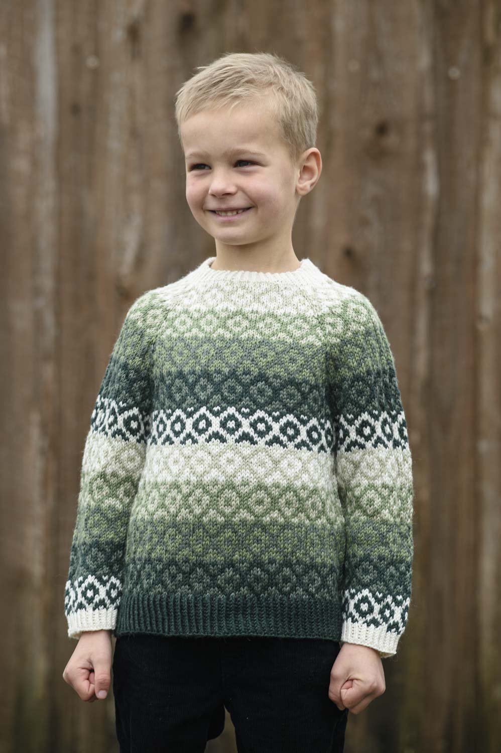 Firkantet farveleg strikkes oppefra og ned med vendepinde i halskanten og raglanudtagninger i bærestykket, og sweateren er derfor næsten monteringsfri.