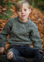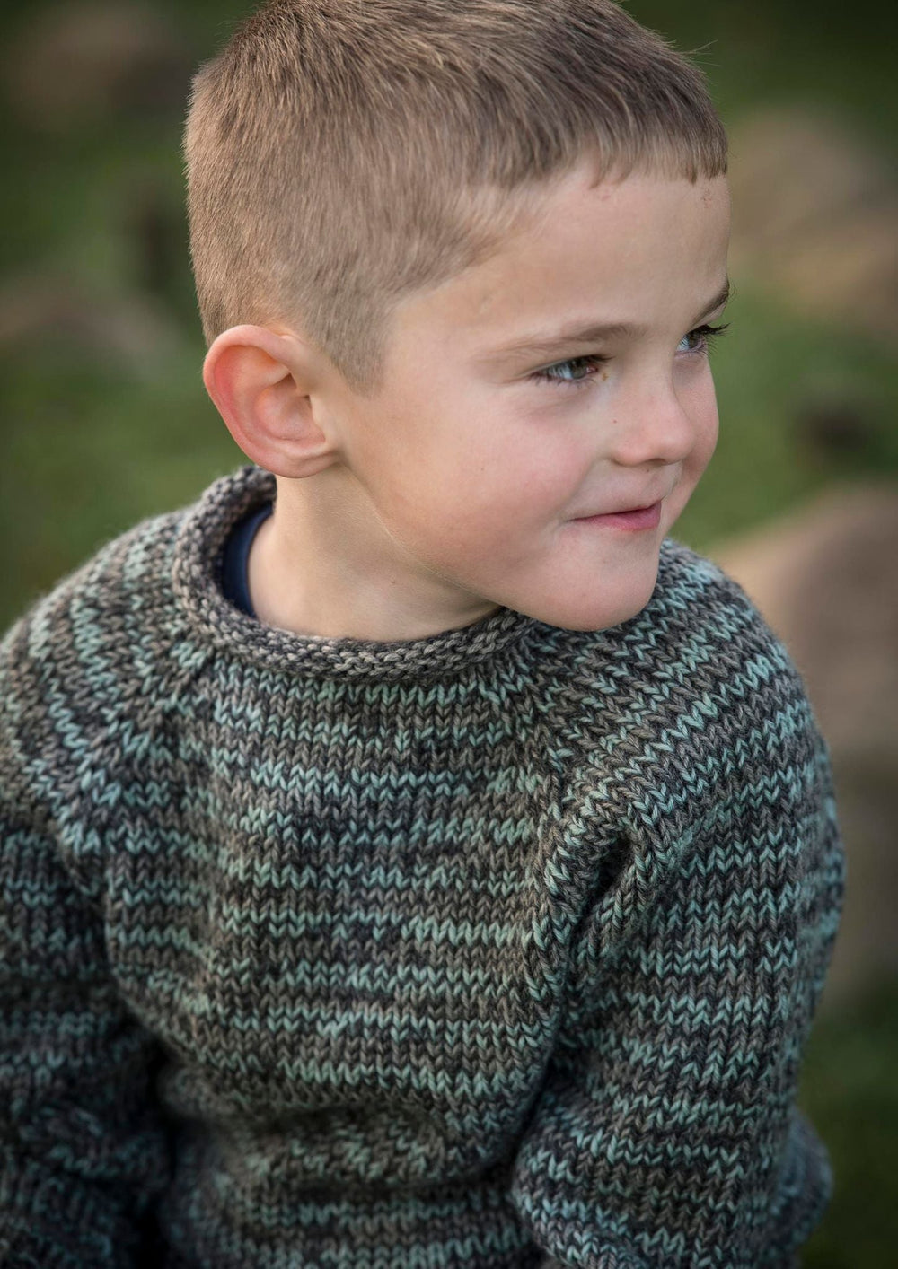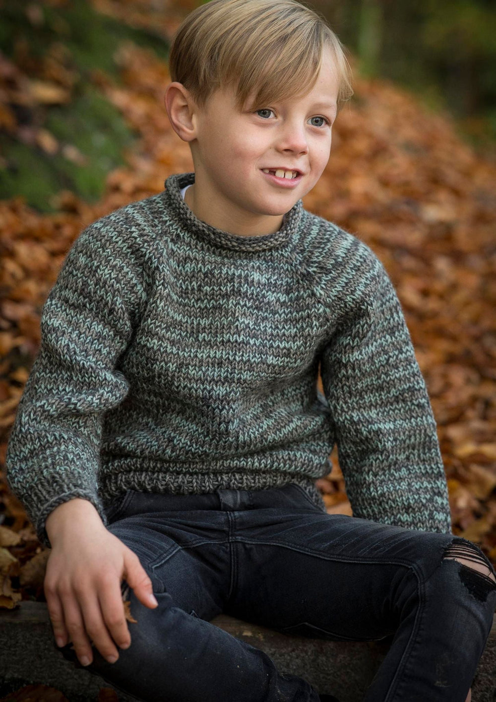 Sej drengesweater, som strikkes oppefra og ned med dobbelttråd i to forskellige kvaliteter. Samtidig strikkes trøjen i striber, da du skal skifte mellem to farver af det tyndeste garn, så det bliver en flot meleret trøje, som du ender op med.