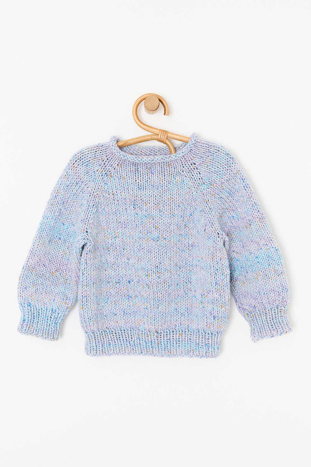 Tidløs, komfortabel og lun raglansweater til børn, som er simpel i sin konstruktion. Den strikkes i glatstrik oppefra og ned med rullekant i halsen samt ribkanter.