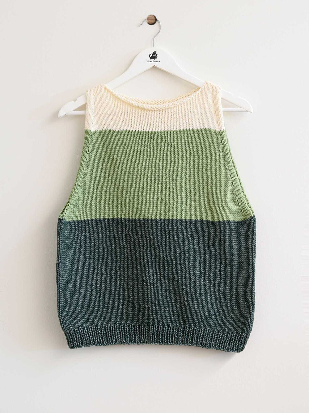 Enkel og ærmeløs top i et løst design - strikket i vores Mayflower Rimini, som er karakteriseret ved at være et meget blødt og fyldigt garn, der stadig er åndbart.