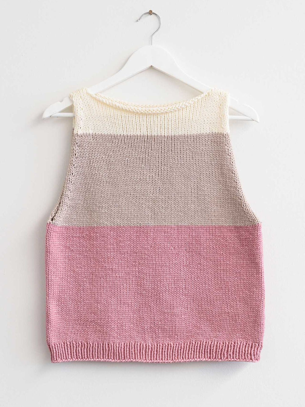 Det hvide indre og det farvede ydre giver Rimini en unik farvesammensætning og et smukt, meleret udtryk, når du strikker. Jo mørkere garn, du vælger, jo bedre fremstår farveforskellen. Den lyserøde udgave er strikket i hhv. nr. 1 (fløde), nr. 2 (lys sand) og nr. 10 (lys rosa), ligesom du også kan lave en skøn top, hvis du kun vælge at bruge én farve.
