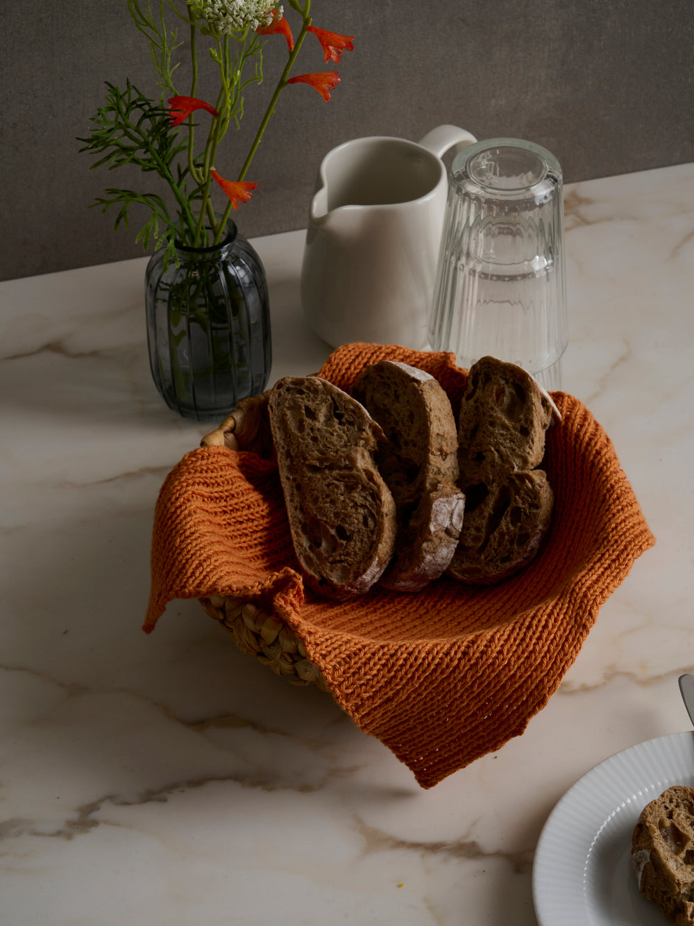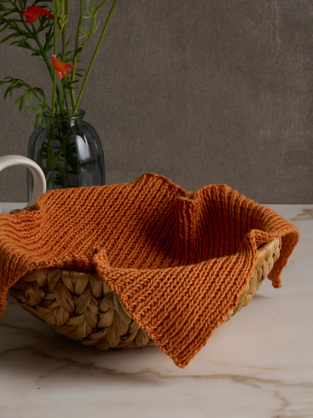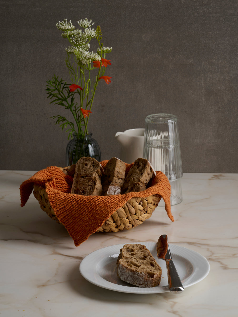 En ribstrikket brødserviet, som passer til en brødkurv. Den firkantede serviet strikkes frem og tilbage i ribstrik og er et meget enkelt projekt at give sig i kast med.
