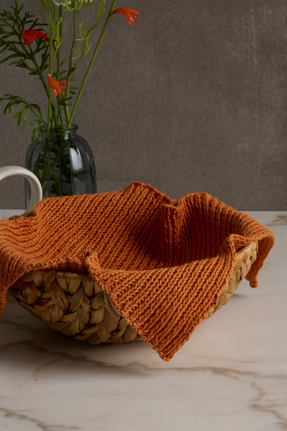 En ribstrikket brødserviet, som passer til en brødkurv. Den firkantede serviet strikkes frem og tilbage i ribstrik og er et meget enkelt projekt at give sig i kast med.