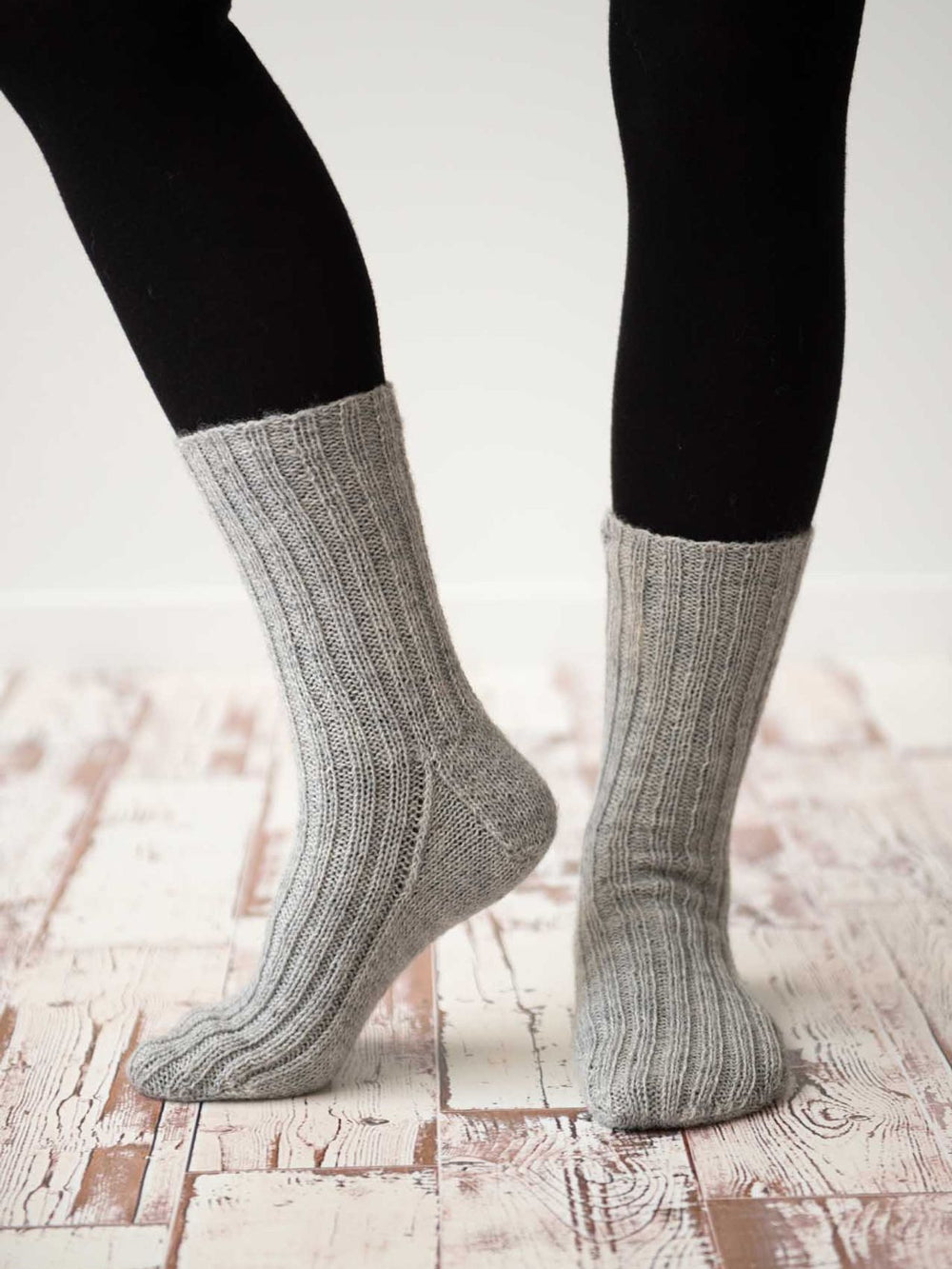 Lækre og varme strømper i ribstrik og med kilehæl i det skønne strømpegarn Mayflower 1 Class. Ribben på skaftet og ovenpå foden giver strømper en flot karakter og er et mønster, der er nemt for alle at strikke, når man kommer ind i rytmen.