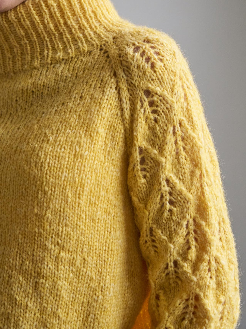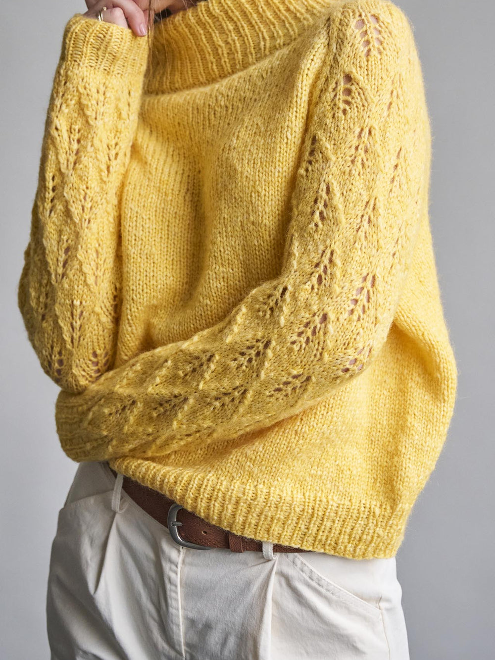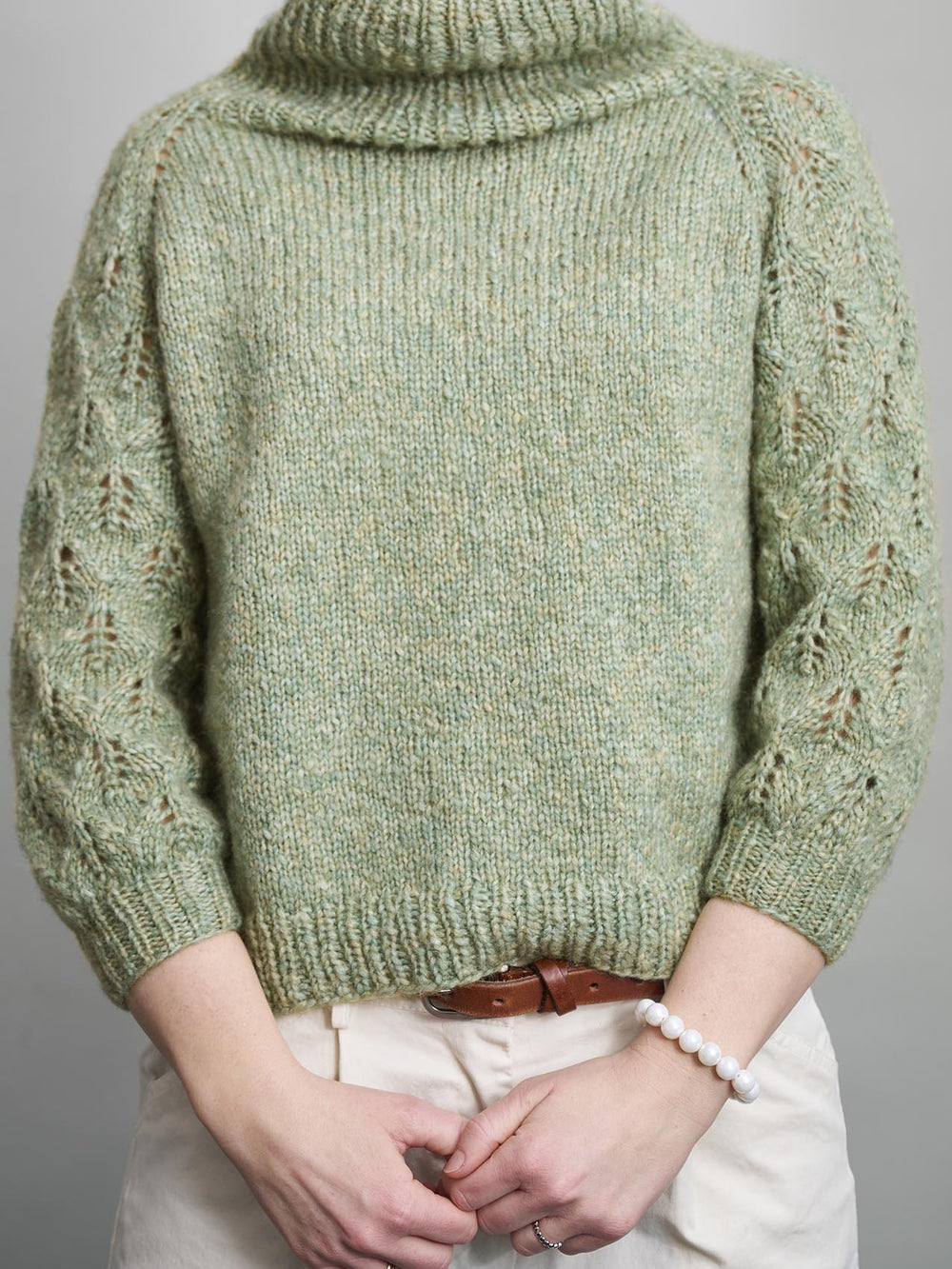 Sweateren strikkes top-down. Blusens for- og bagstykke strikkes i glatstrik, mens ærmerne strikkes i et elegant bladmønster. Den store halskrave falder smukt ned og former halsudskæringen helt af sig selv.