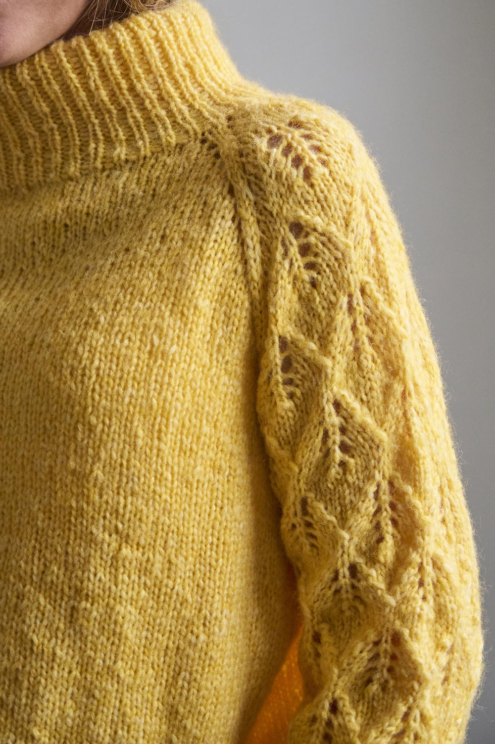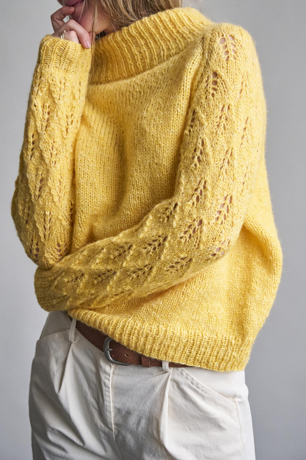 Sweateren strikkes top-down. Blusens for- og bagstykke strikkes i glatstrik, mens ærmerne strikkes i et elegant bladmønster. Den store halskrave falder smukt ned og former halsudskæringen helt af sig selv.