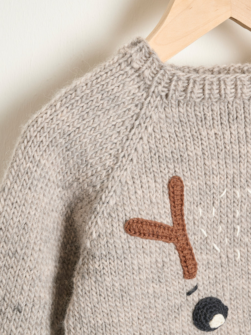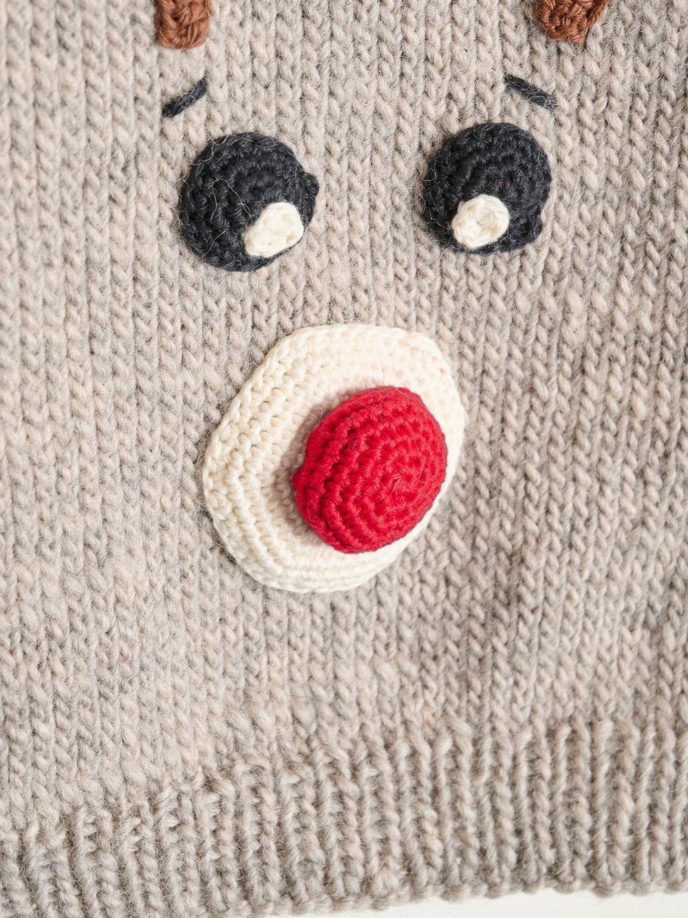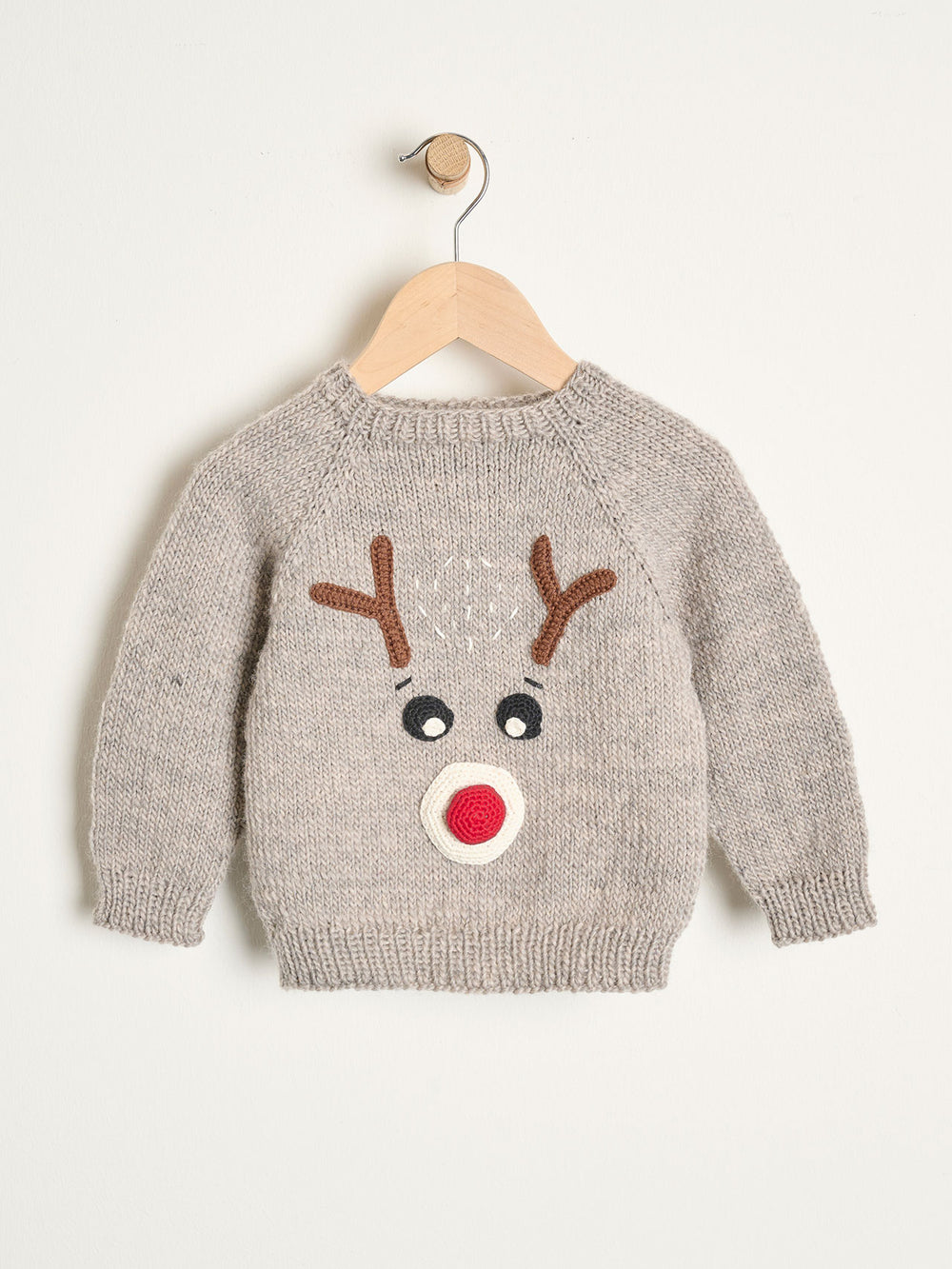 Den søde børnesweater med Rudolf på maven er næsten ikke til at stå for. Sweateren strikkes oppefra og ned med raglanudtagninger. Til sidst hækles næse, øjne og gevir, som sys på fronten af sweateren.