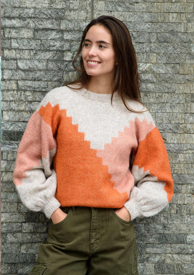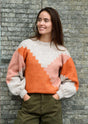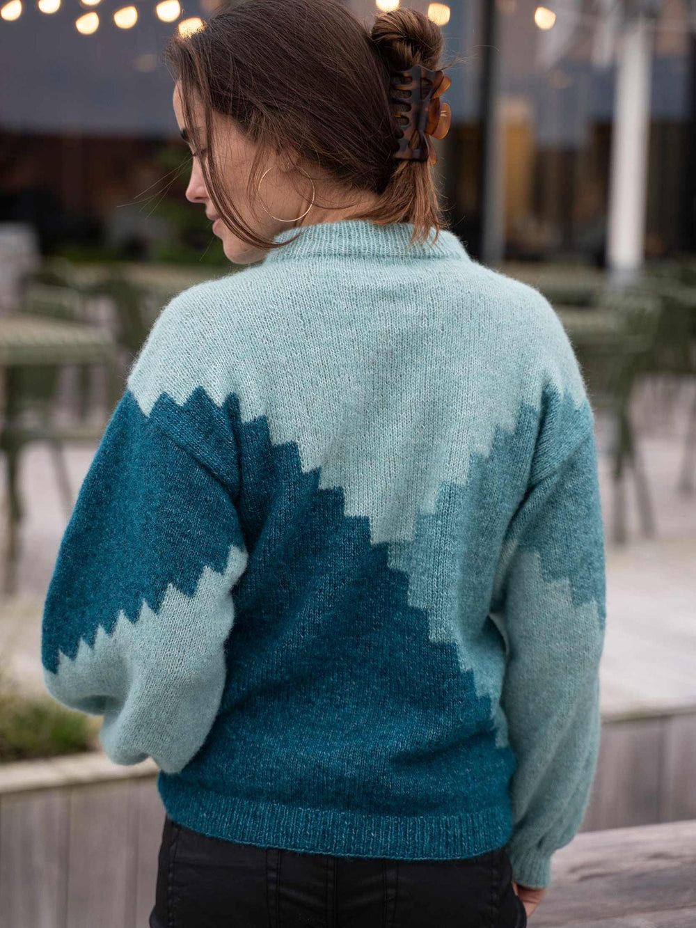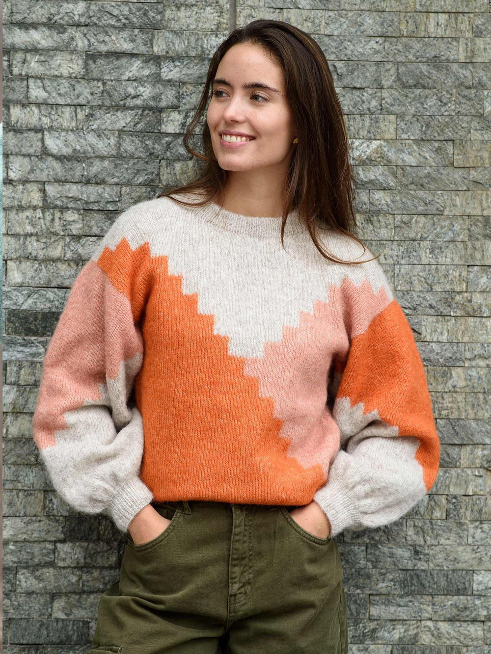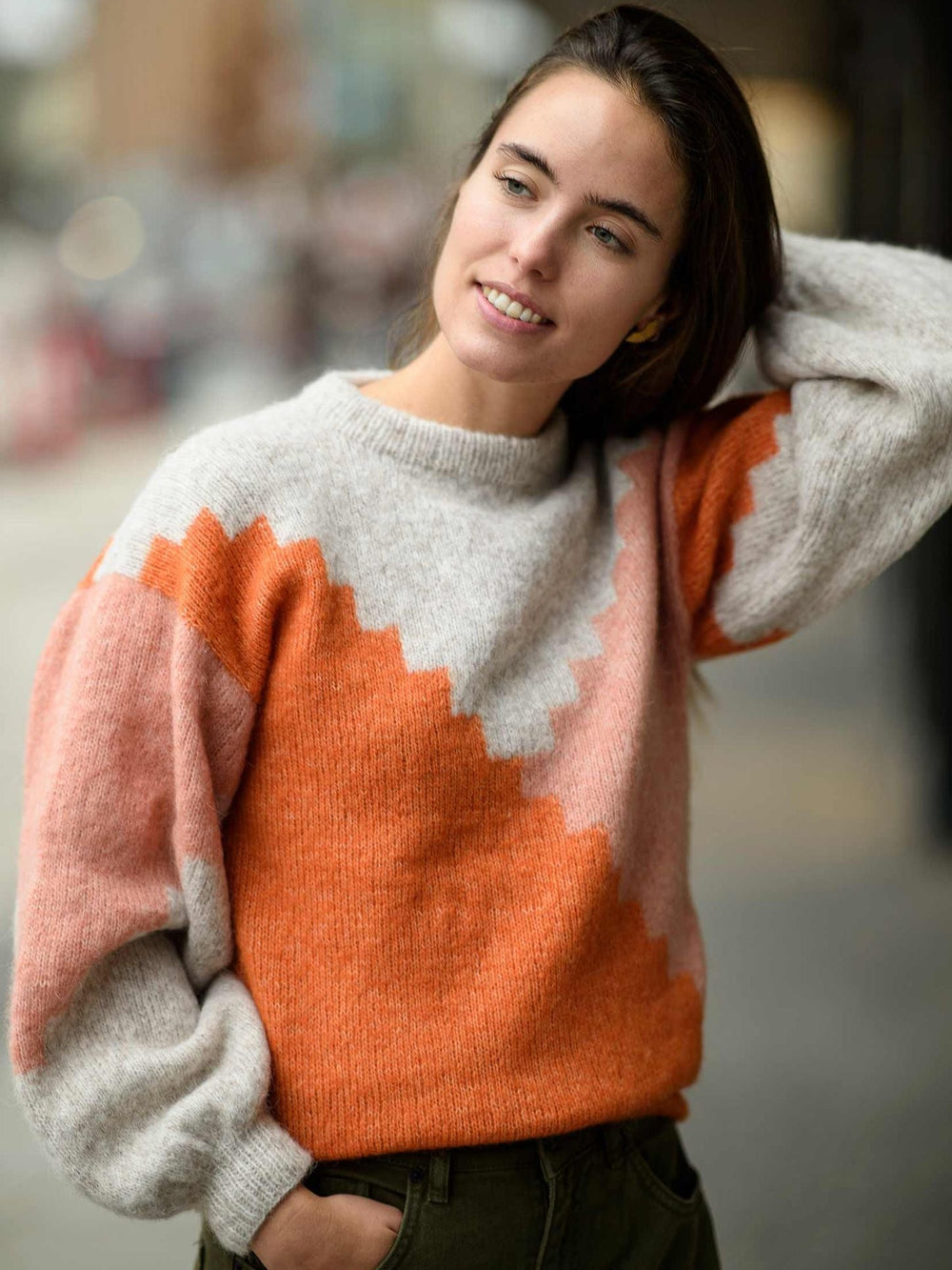 Sandra sweateren er et mesterværk, når det kommer til farver. De geometriske farveblokke skaber det flotteste farvespil, når sweateren strikkes med tre forskellige farver, og resultatet er fænomenalt.