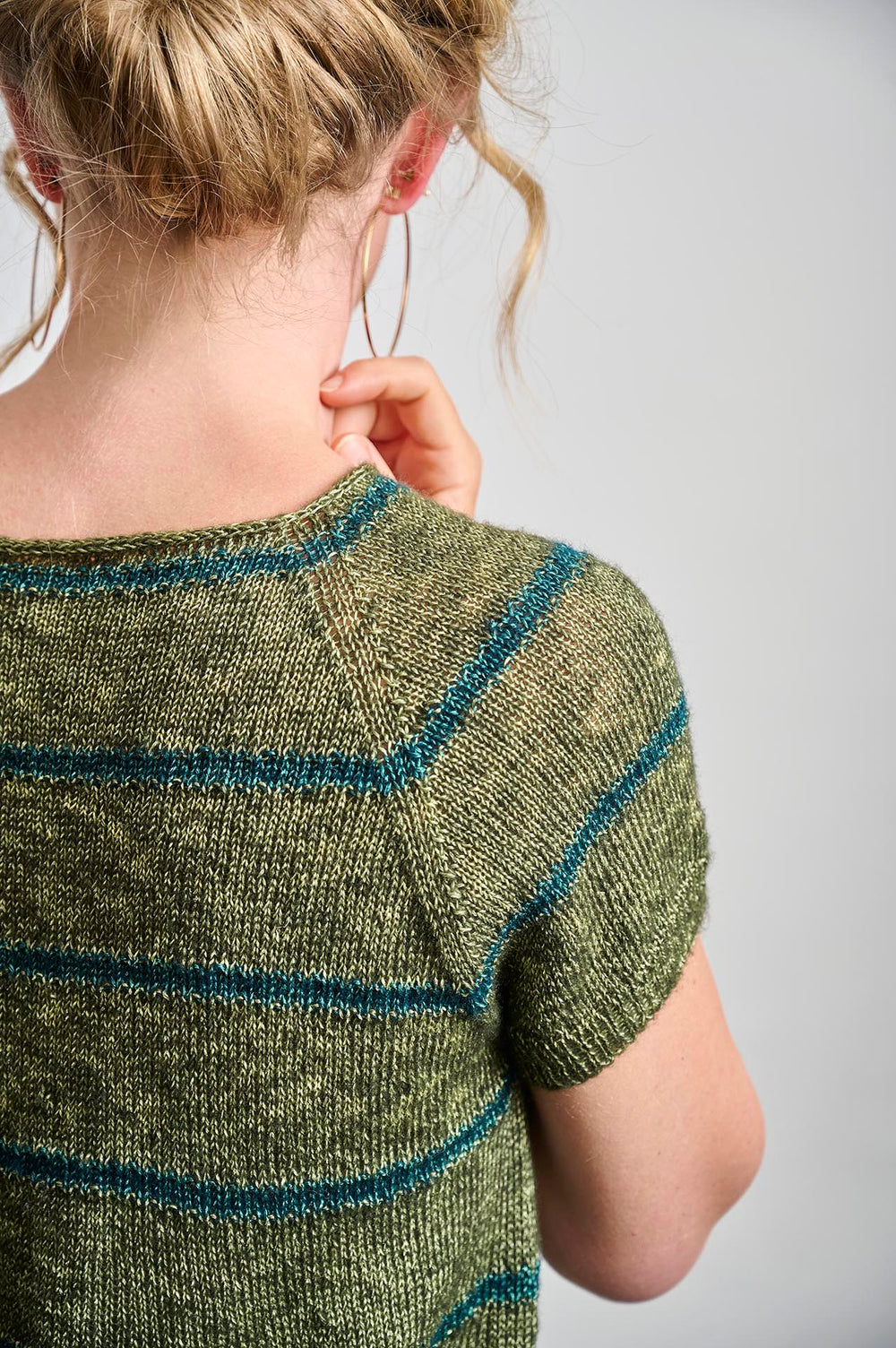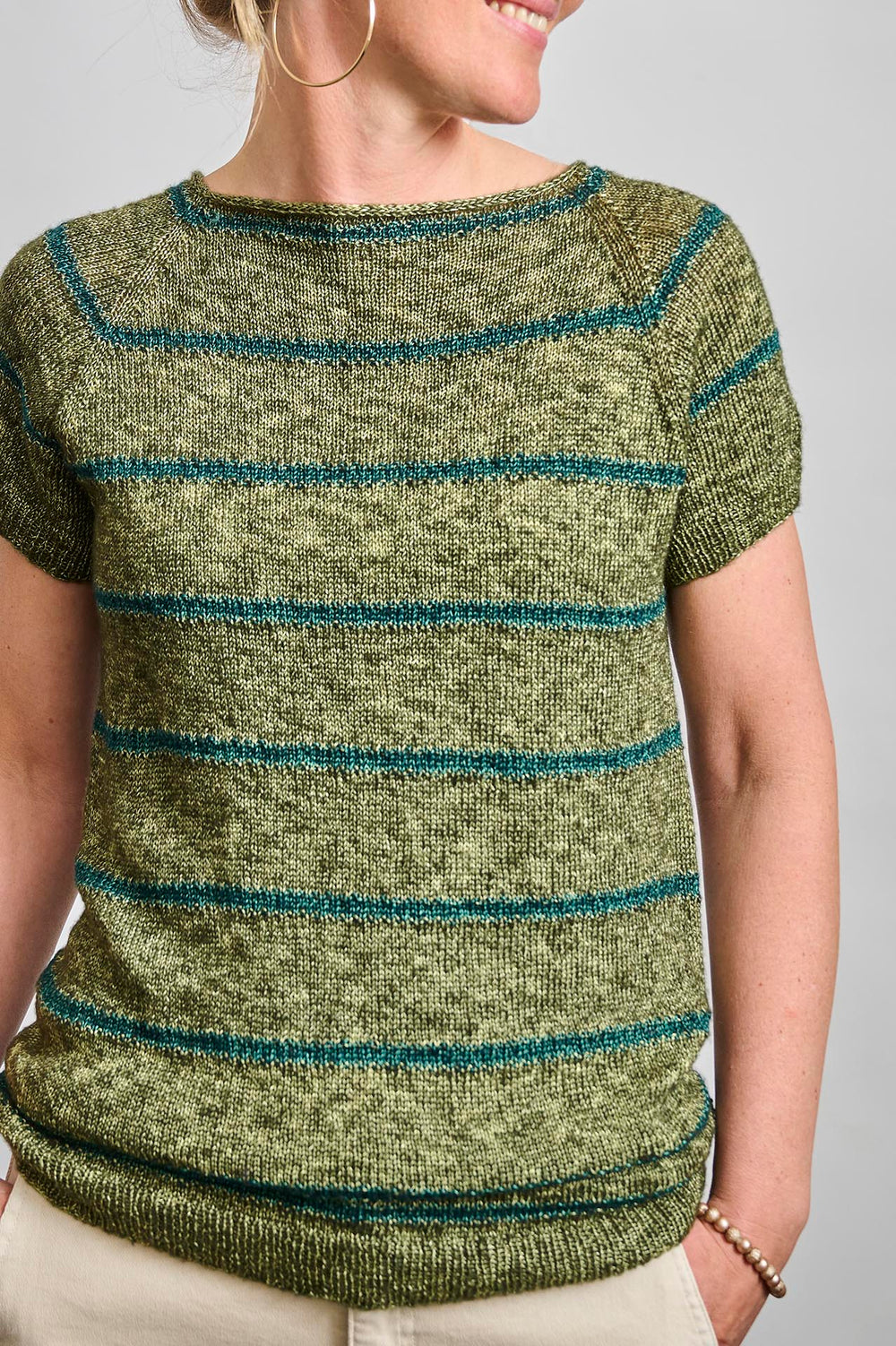 Sanne tee er en lækker t-shirt, som har et diskret strukturmønster i striberne. T-shirten strikkes nedefra og op på pind 3 mm.