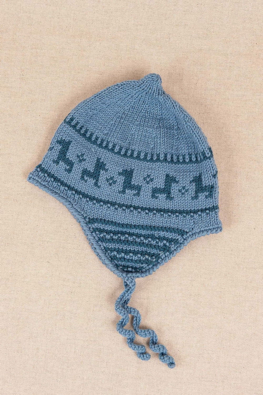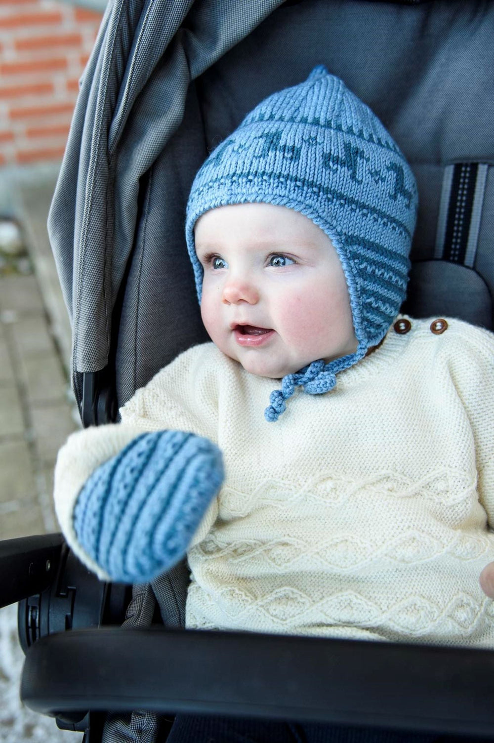 Sød hue i flot mønster med øreklappper, som holder ørerne varme og beskyttede. Mønstret er Peru strik og er baseret på et tidligere Mayflower-design, der har nummer 114-8. Denne model adskiller sig ved at være strikket i et andet garn end den oprindelige opskrift.