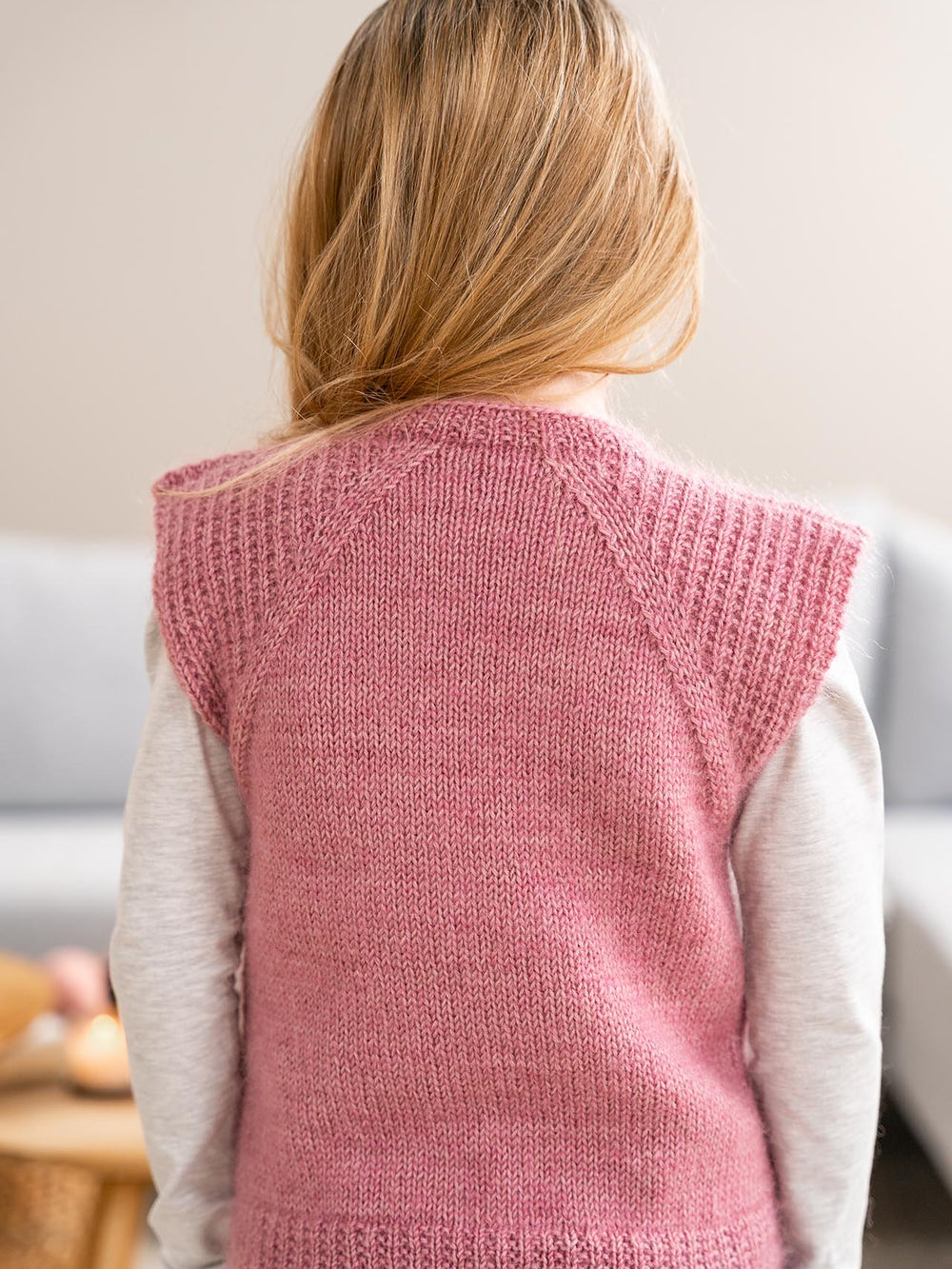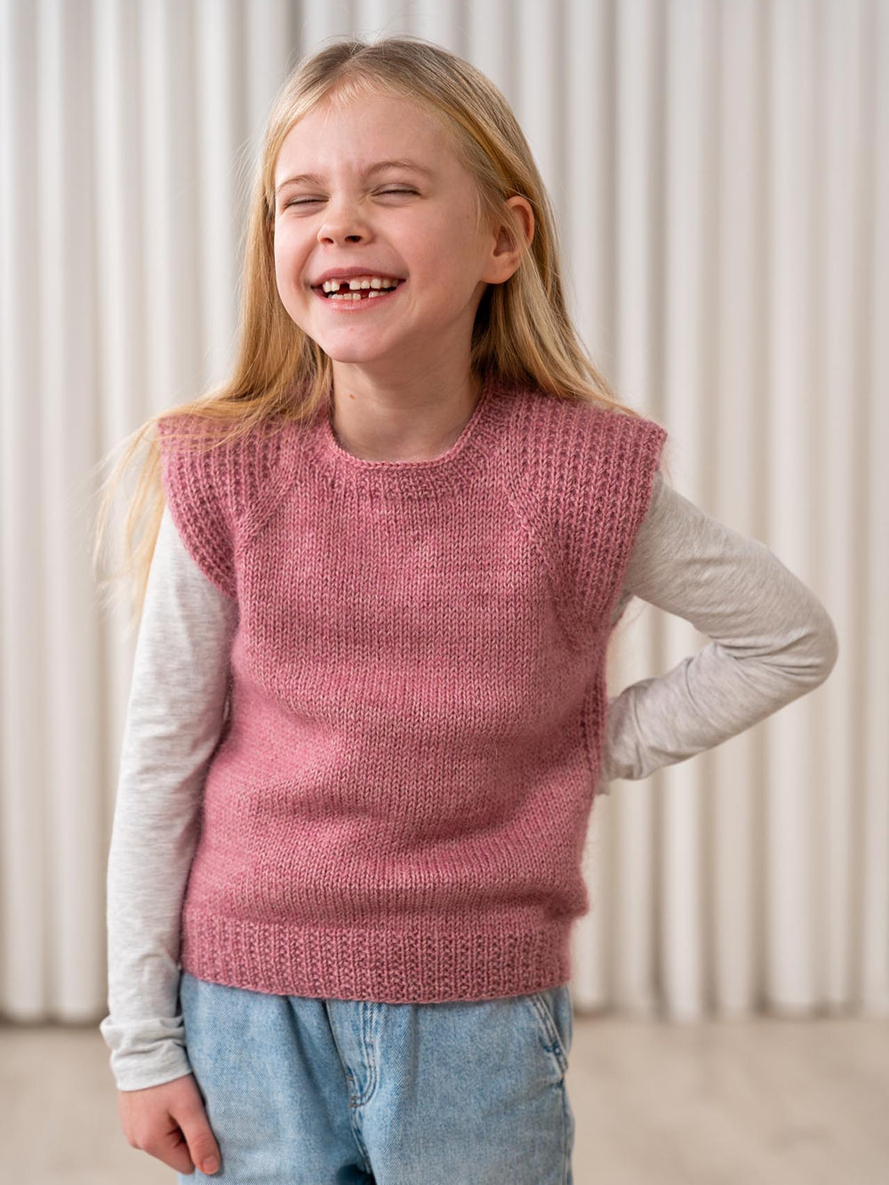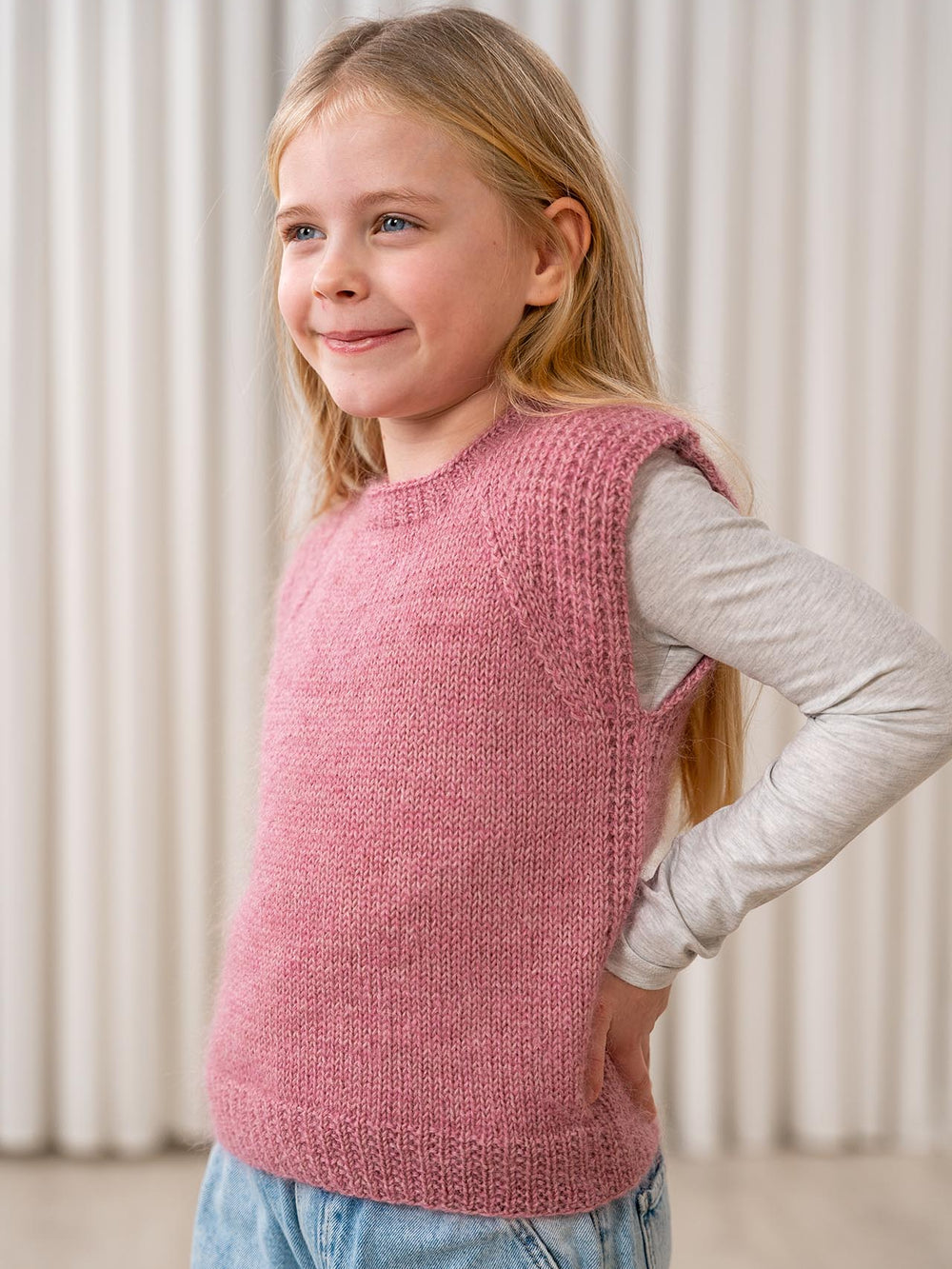 Vesten kan laves i str. 2-12 år og skal vaskes i hånden med uldvaskemiddel.
