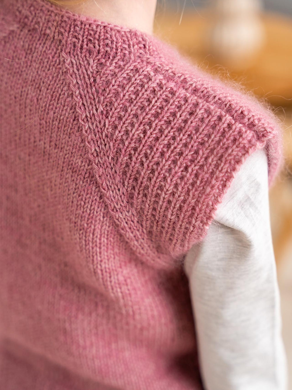 Siggi vest junior har fylde og struktur med fine detaljer og et flot farvespil i de to forskellige tråde garn. Siggi vesten strikkes nedefra og op i ribmønster og glatstrik.