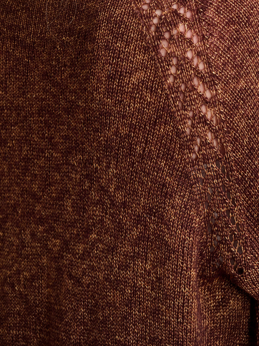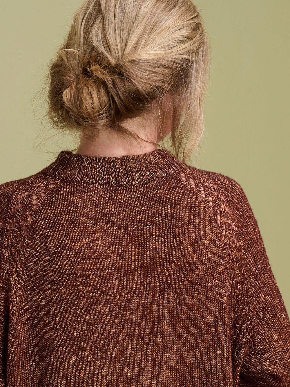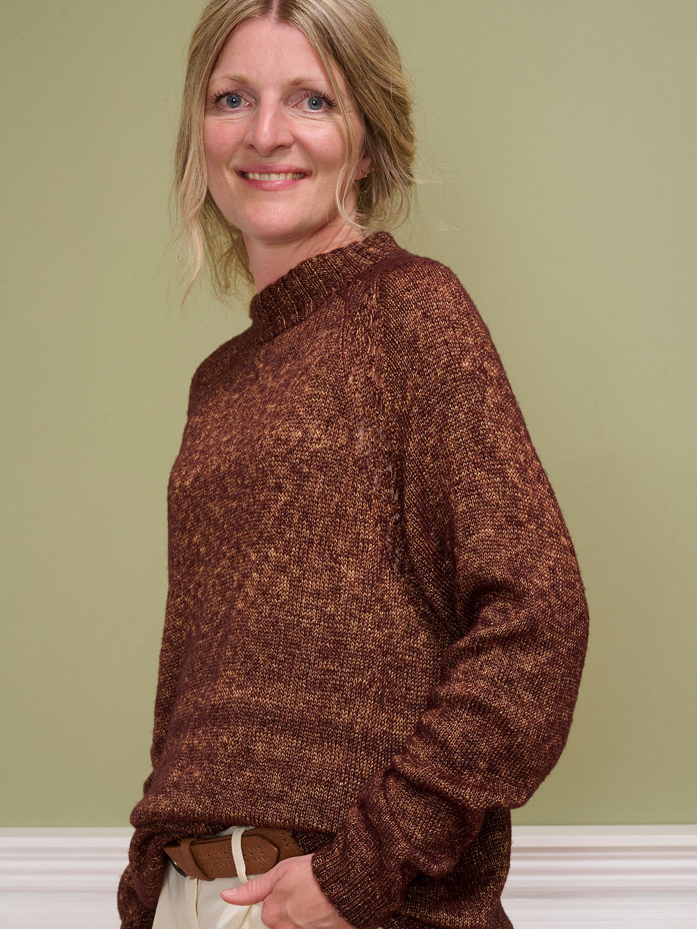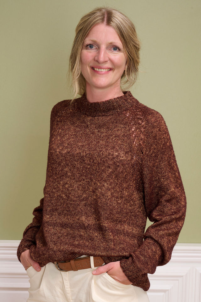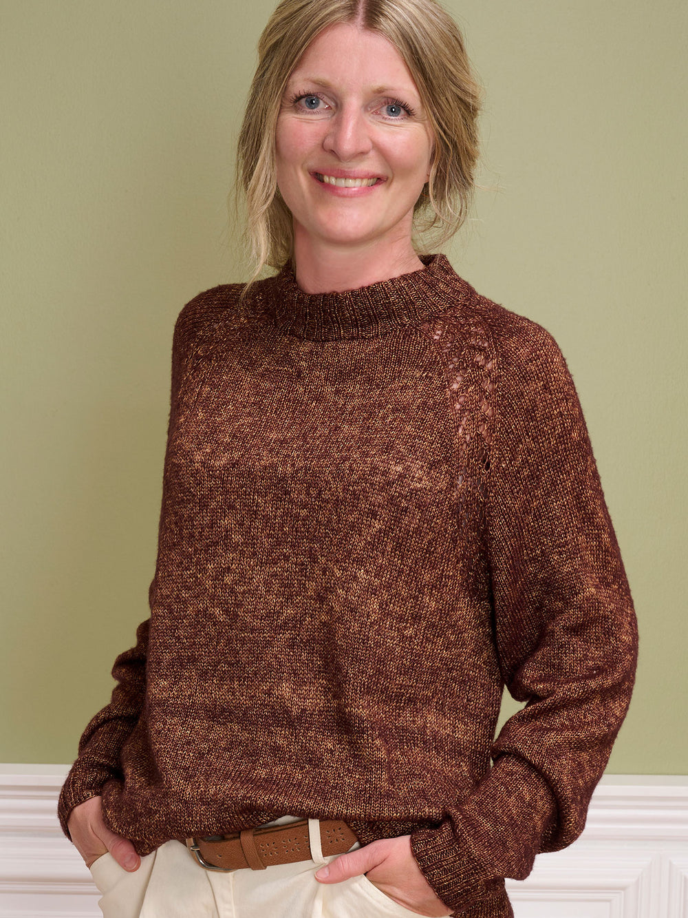 Sweateren strikkes nedefra og op på rundpind, hvorefter arb deles til ryg og forstykke i ærmegabene. Ærmerne strikkes hver for sig nedefra og op.