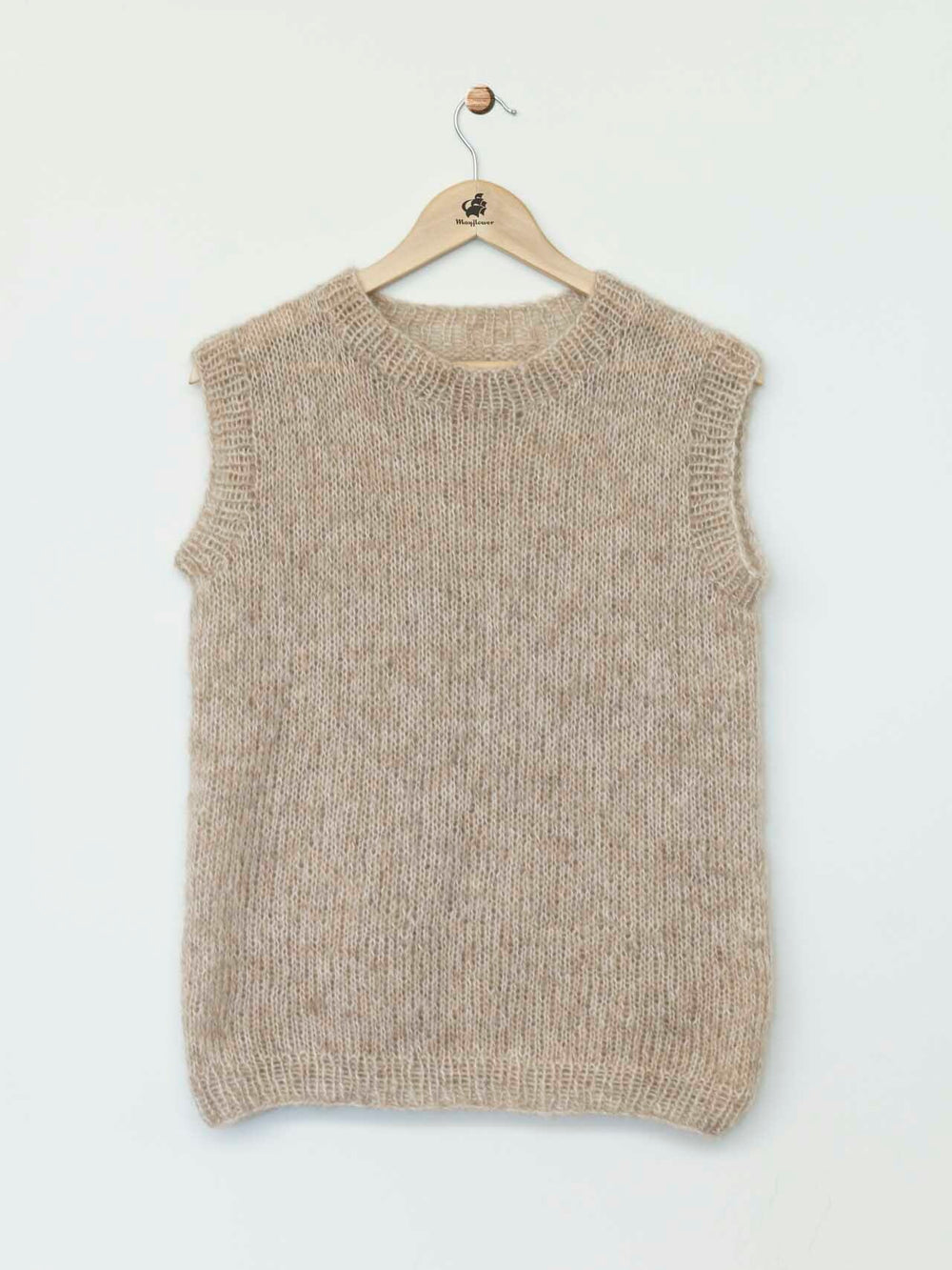 Vesten har en helt fantastisk let og luftig struktur, da den strikkes i Mayflower Elba. Elba er helt enormt blødt, og blødheden bliver endnu bedre, da vesten strikkes med hele 3 tråde, hvilket giver en vidunderlig struktur.