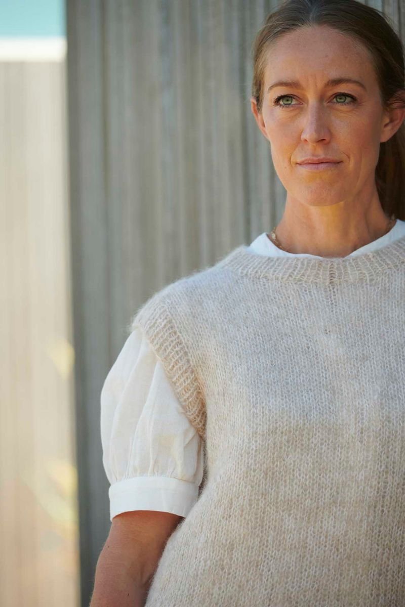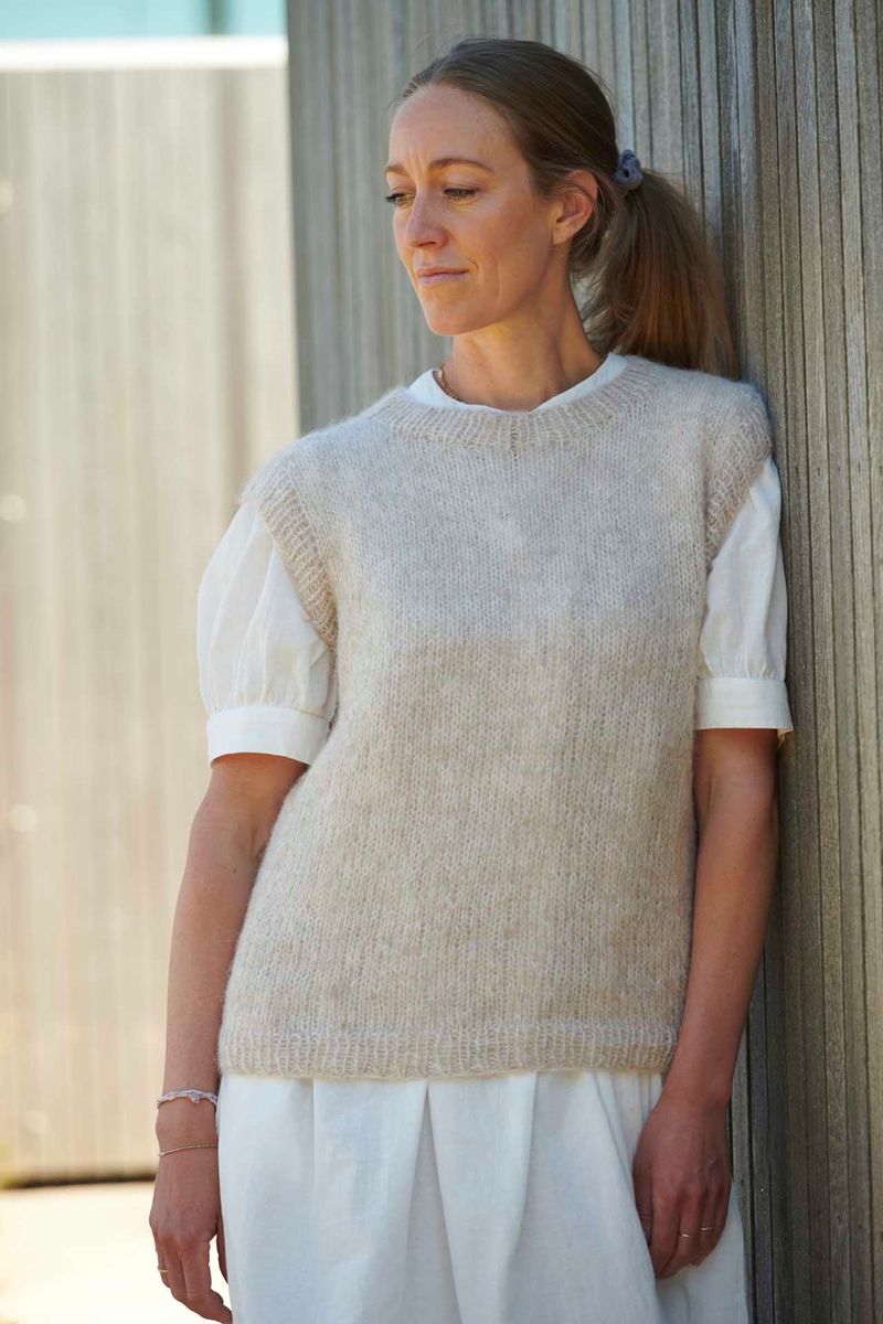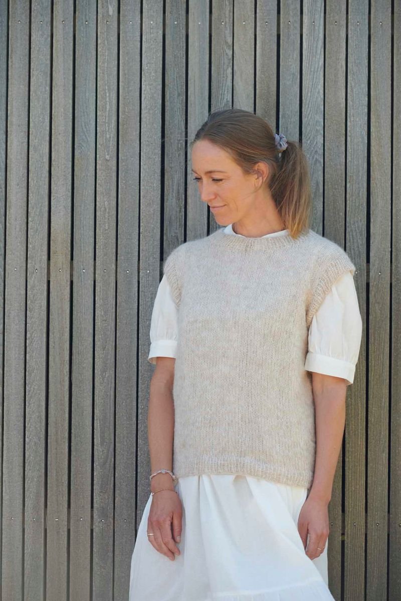Vesten findes også i en udgave, hvor den strikkes i tre tråde Super Kid Silk. Find opskriften på den her.