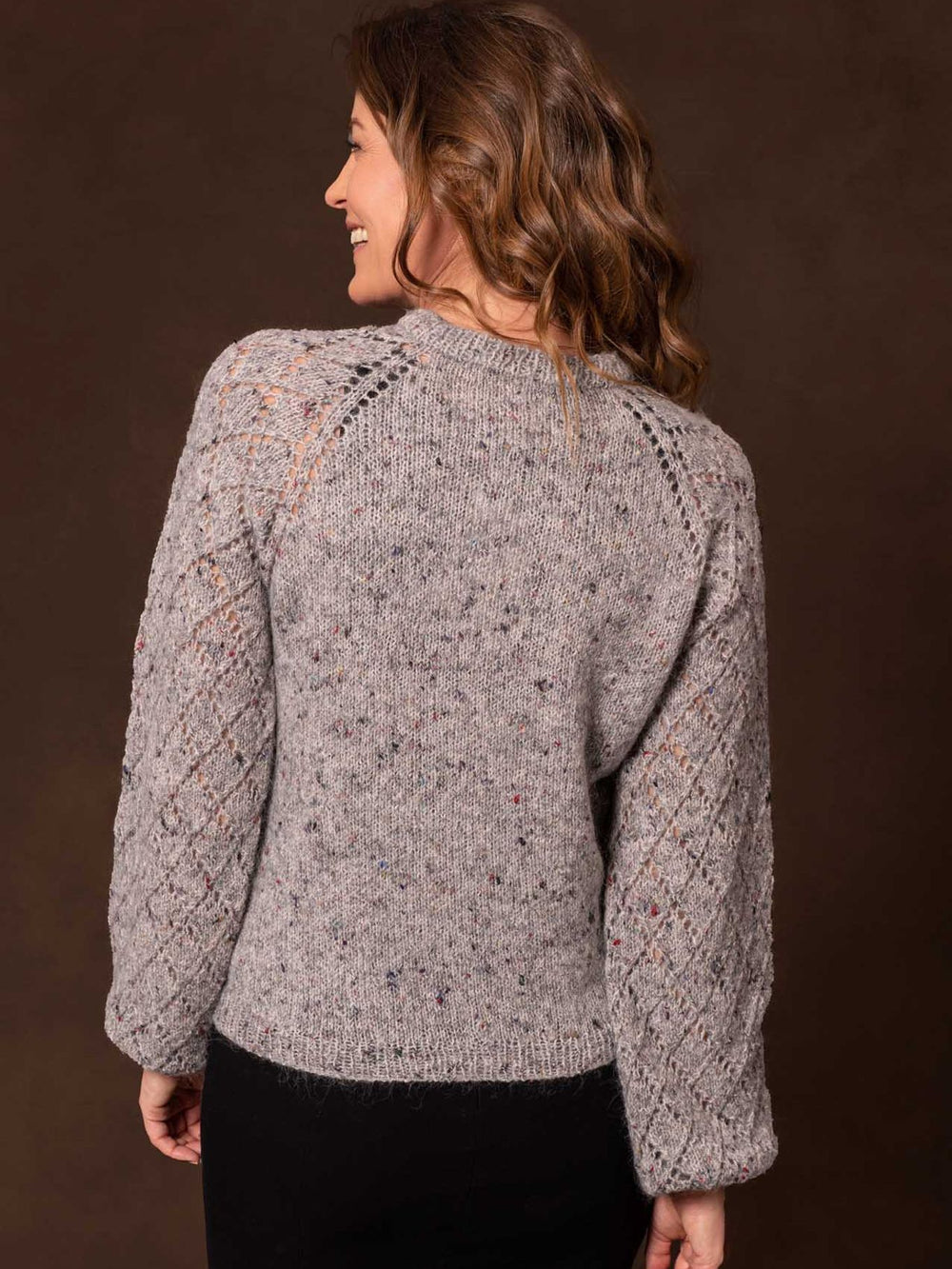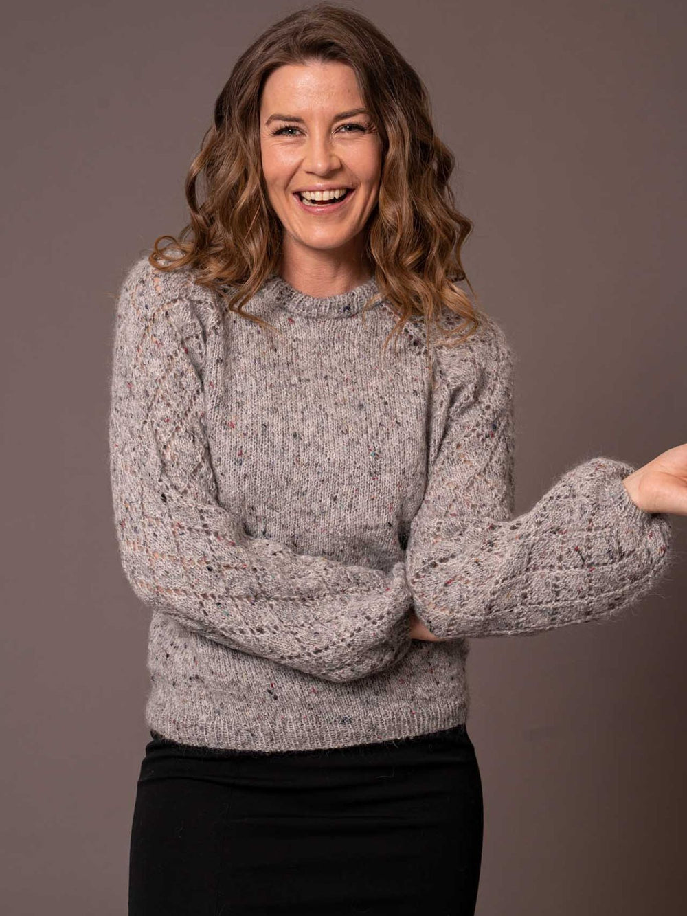 Skagen trøjen er strikket oppefra og ned med raglanudtagninger. Der er strikket vendemasker i nakken for at forme trøjen og give en god pasform. Trøjens helt perfekte detalje er dog de smukke ærmer, der strikkes med et hulmønster i harlekin-tern.
