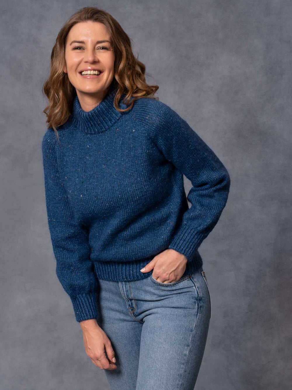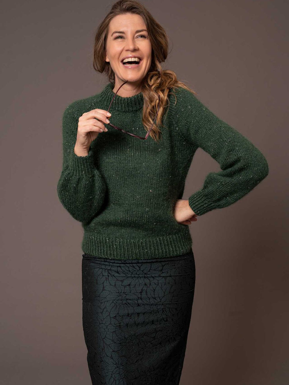 Sweateren er strikket i én tråd Easy Care Classic Tweed og én tråd Super Kid Silk, som tilsammen giver masser af volumen, så du kan lave en dejlig tyk, sweater.