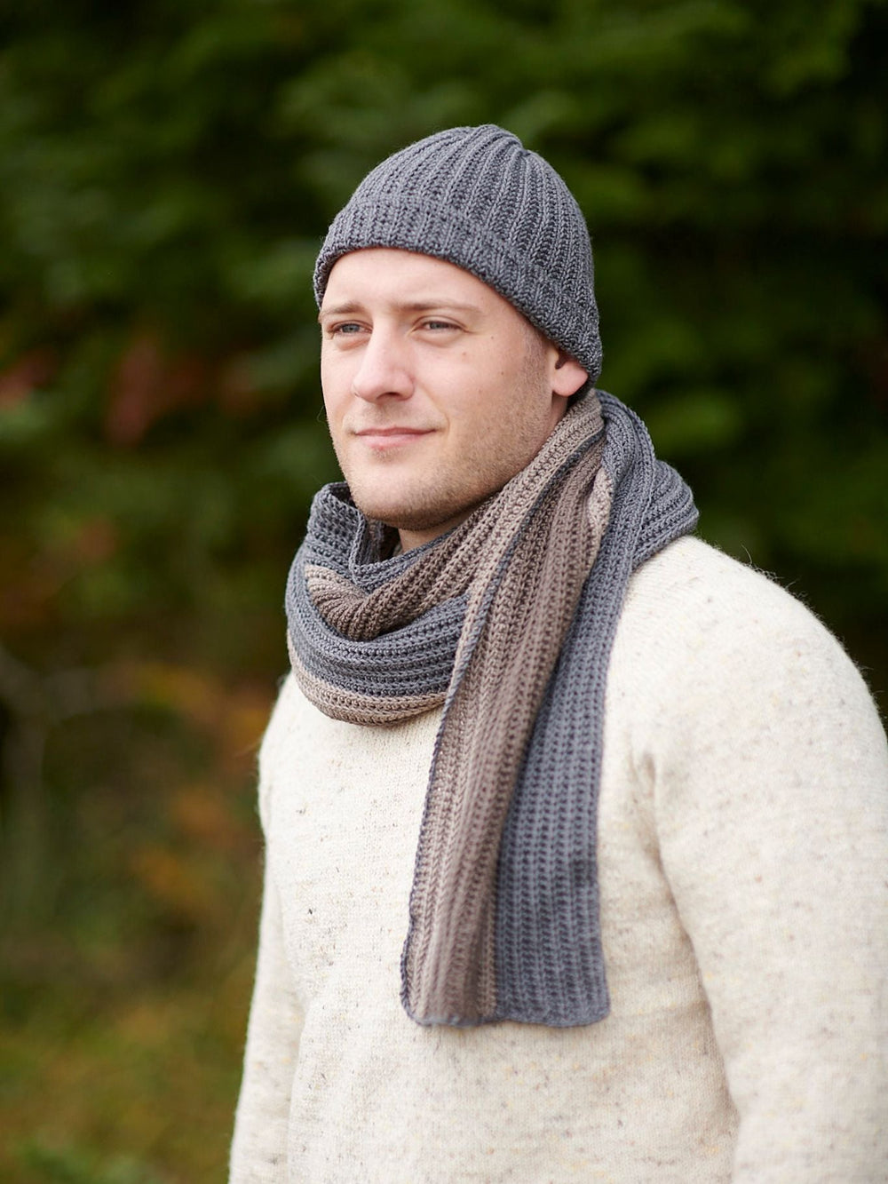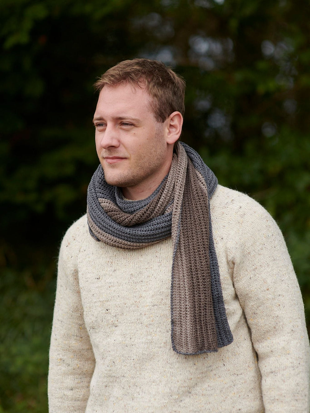 Skovhugger Scarf er et klassisk og enkelt design med ribmønster. Tørklædet er stribet, men kan også fint laves i én farve alt efter eget ønske.
