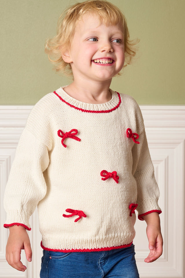 Sløjfebluse junior strikkes i bomuldsblandingen Mayflower Alliance, hvilket giver en blød bluse, som kan bruges hele året rundt - også som juletrøje.