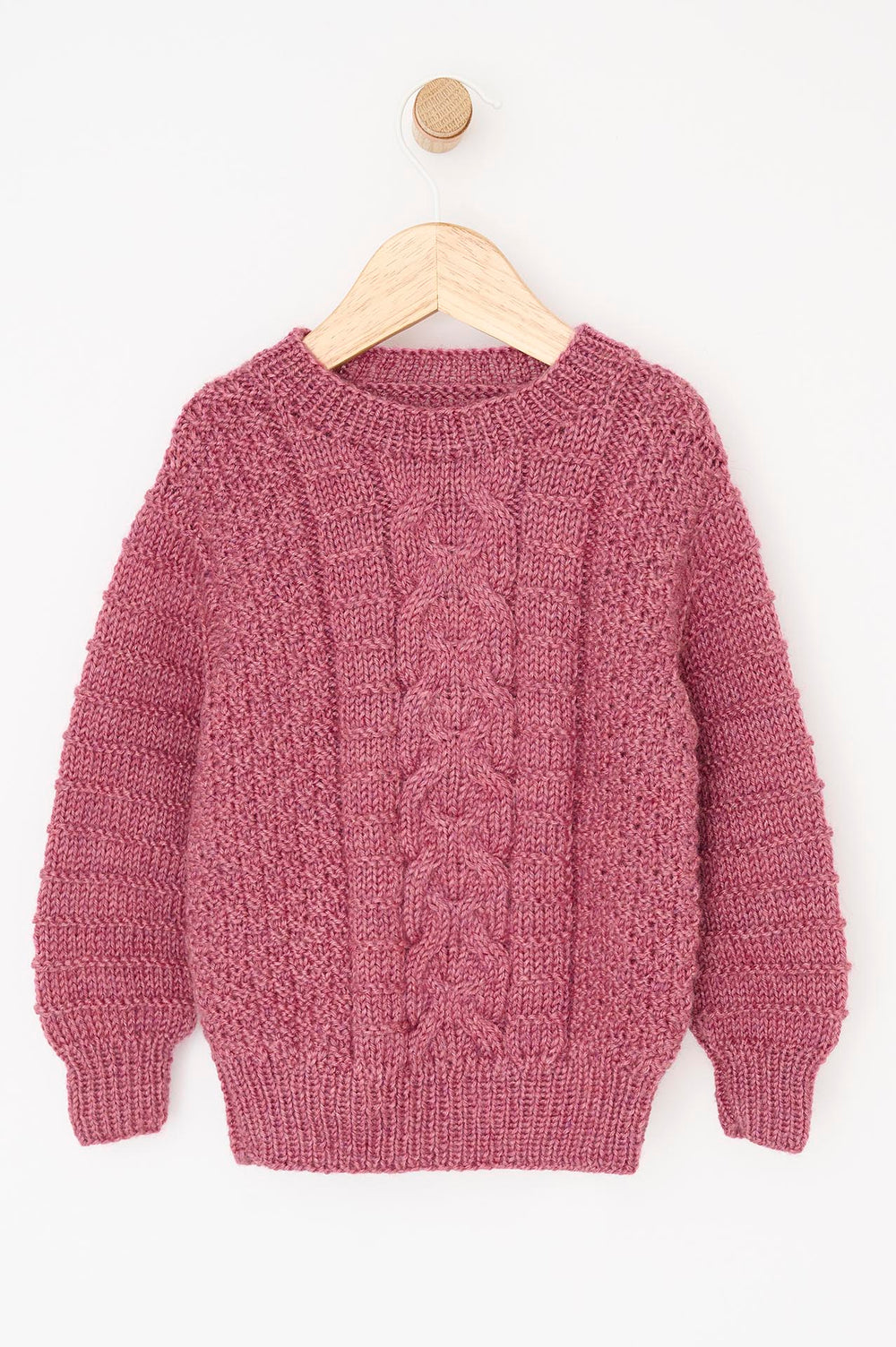 Lun sweater til børn i alderen 2-10 år, som er strikket med snoninger og forskellige strukturmønstre efter diagram. Trøjen strikkes nedefra og op i fire dele: ryg, forstykke og to ærmer, som monteres til sidst, hvorefter der samles masker op til halsens ribkant.