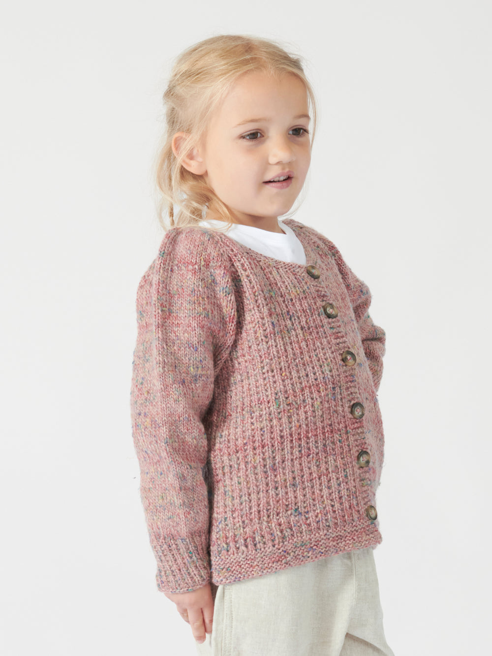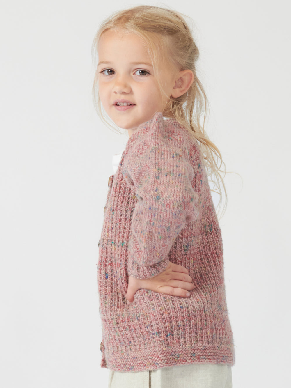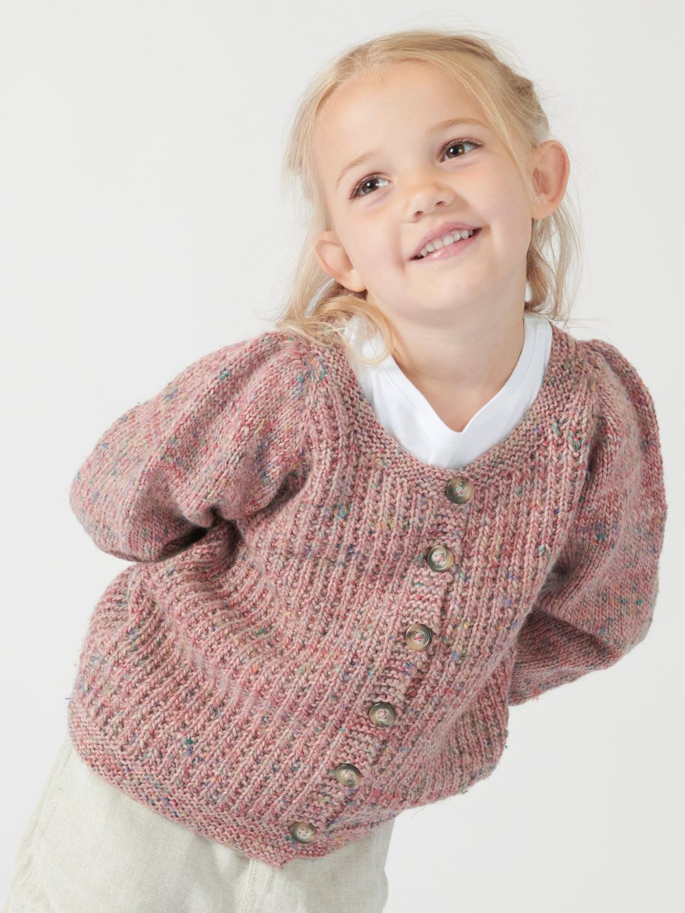 Soleima cardigan junior er en cute og elegant cardigan med pufeffekt i skuldrene og et flot strukturmønster fremkaldt af ret- og vrangmasker. Den strikkes oppefra og ned og monteres med knapper til sidst.