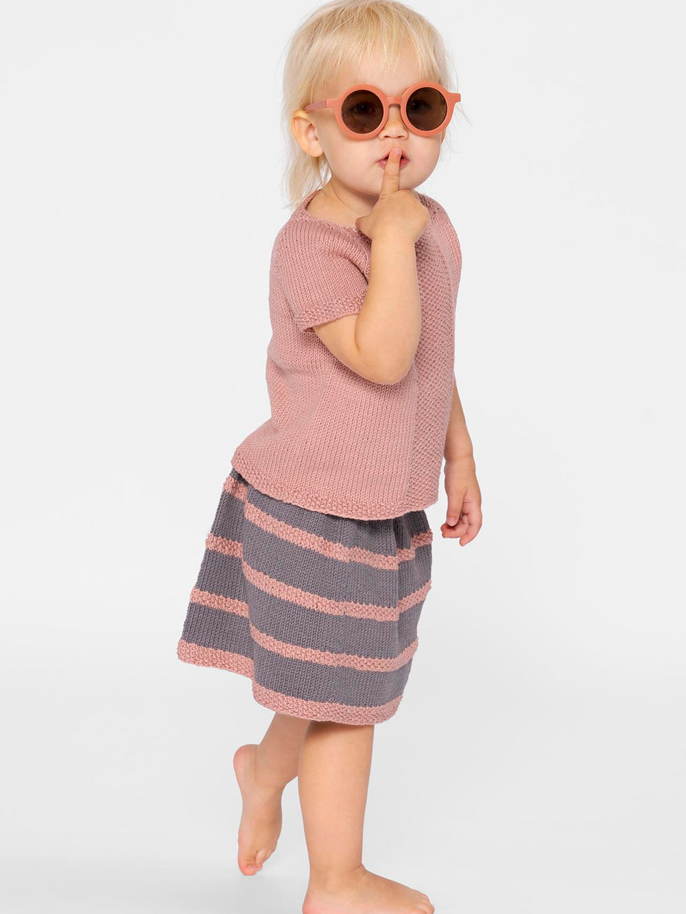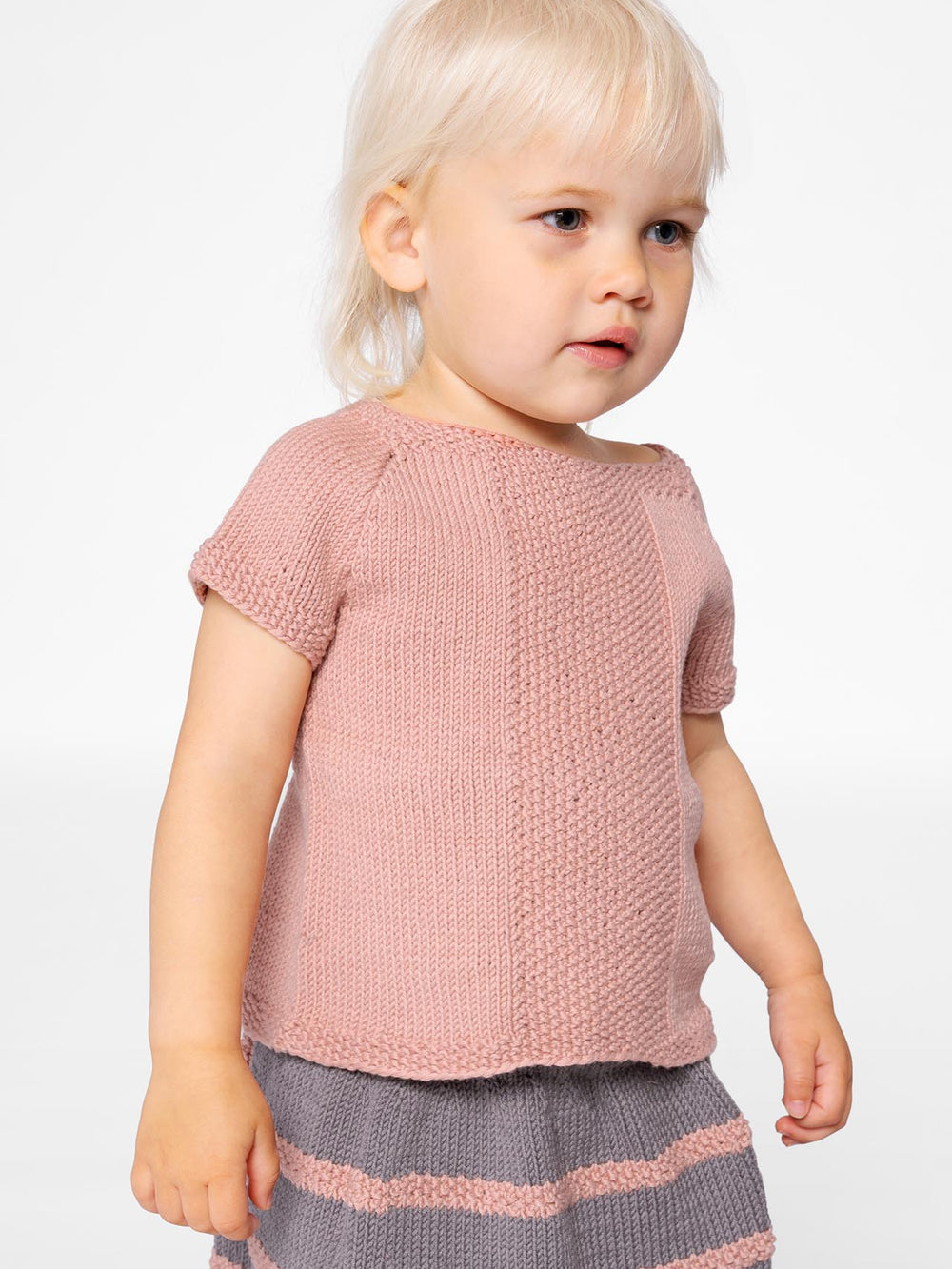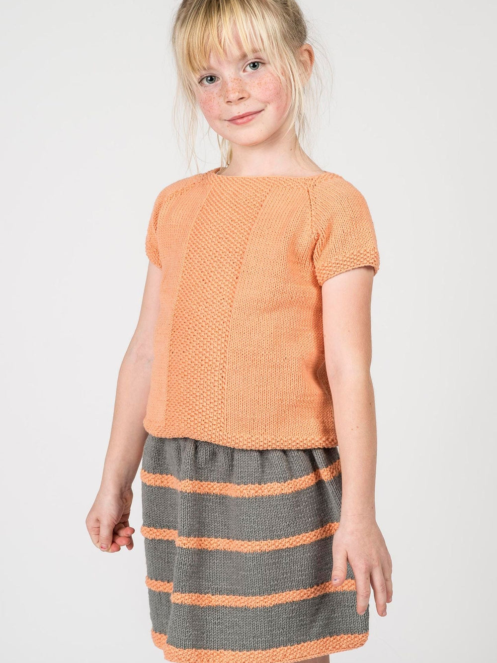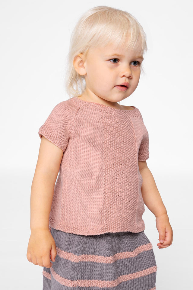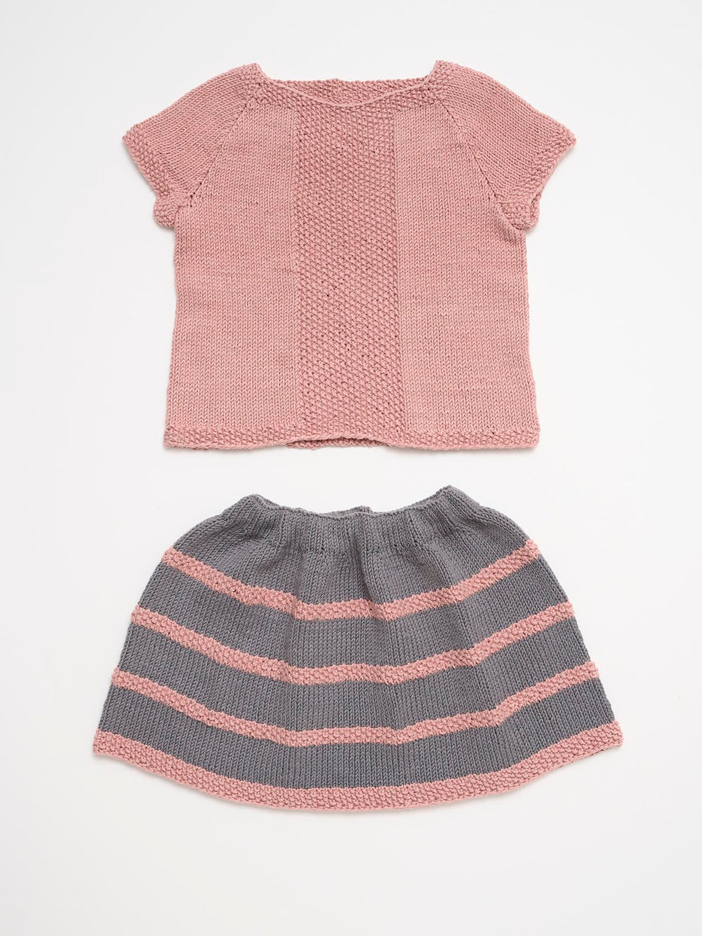 Top og nederdel er begge strikket i glatstrik med perlestrik som kontrast i toppens midterstykke, nederdelens striber og trøjens kanter.