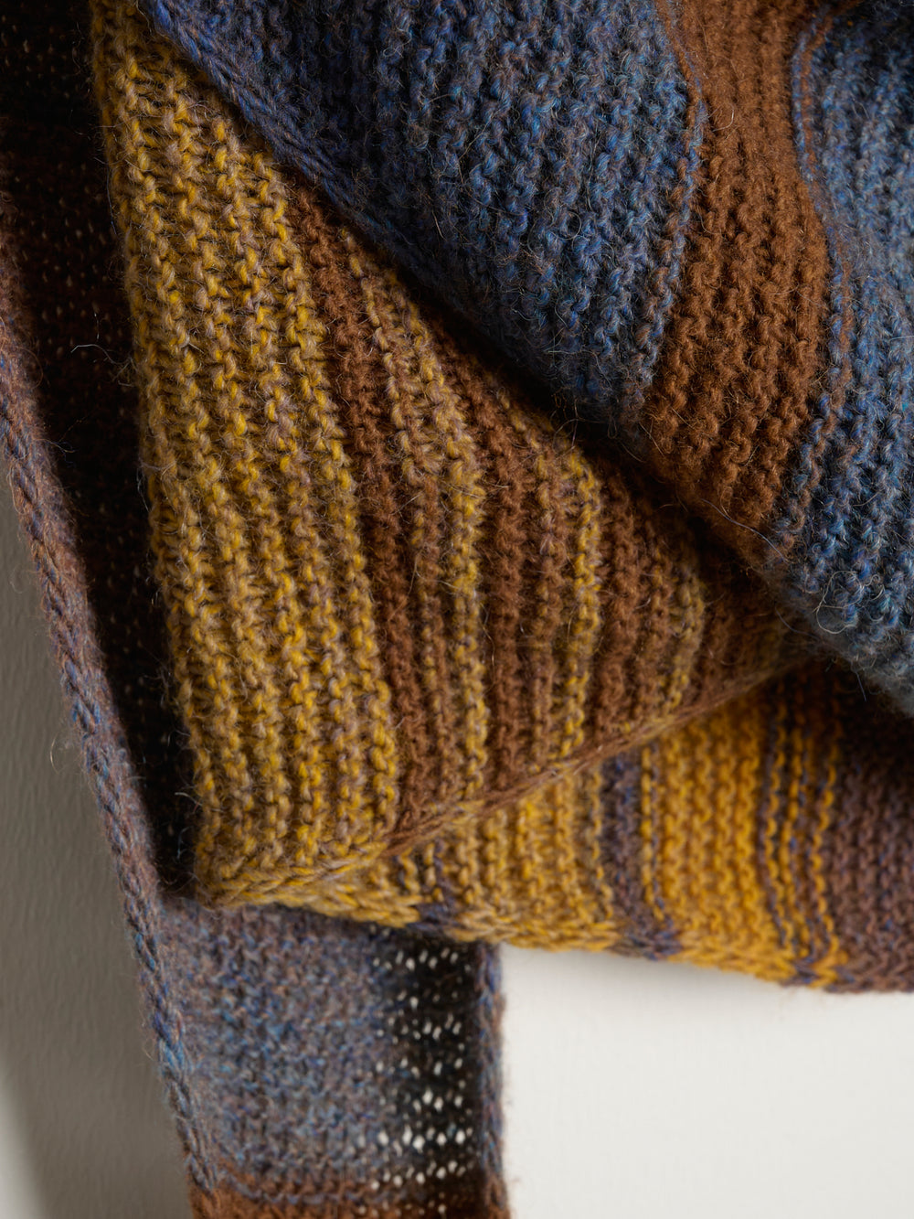 Sophie shawlkan strikkes i flere forskellige garnkvaliteter, og hér er det strikket i alpakablandingen Mayflower Taormina, som har et løbende farveskifte. Resultatet er derfor et virkelig blødt og farverigt sjal, som føles lækkert om halsen.