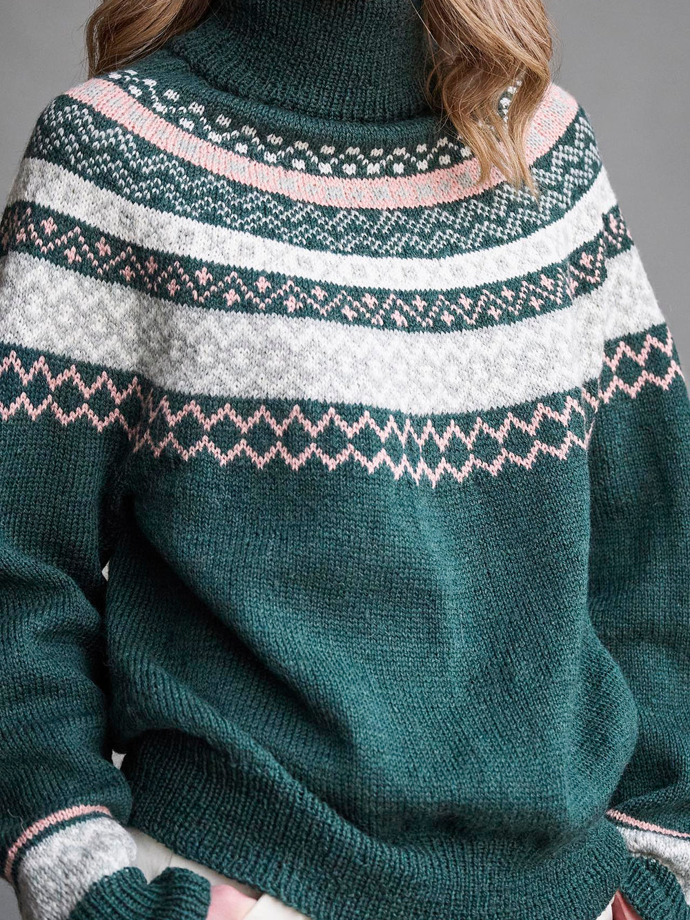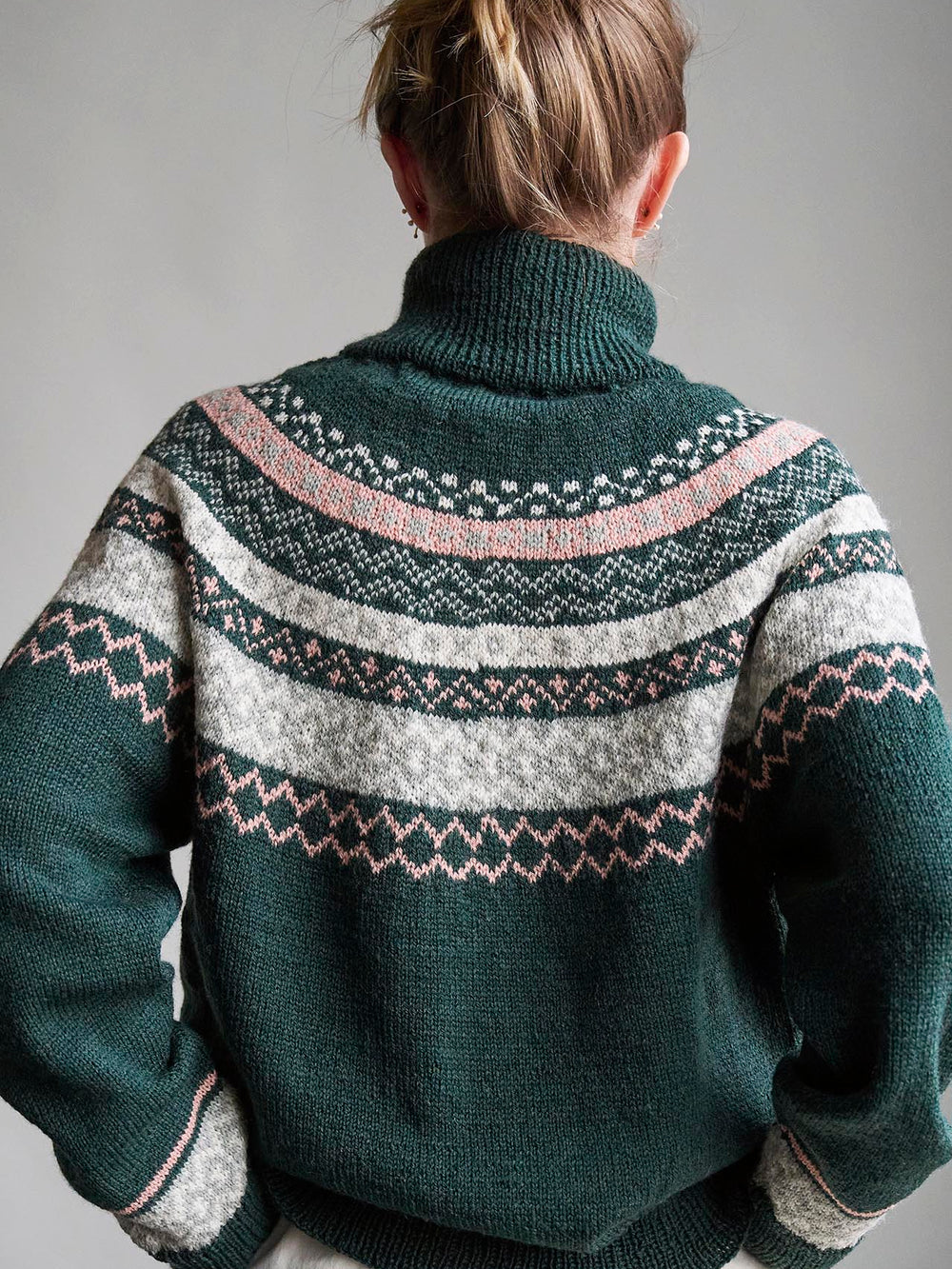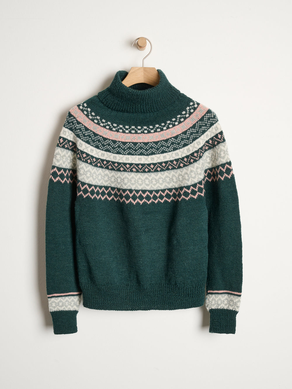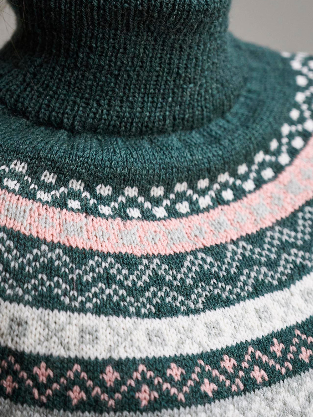 Stina sweateren strikkes oppefra og ned med fire forskellige farver og efter flere forskellige diagrammer. Men arbejdet er det hele værd, da resultatet er virkelig flot. Sweateren strikkes i glatstrik og har en høj, ombukket halskrave.