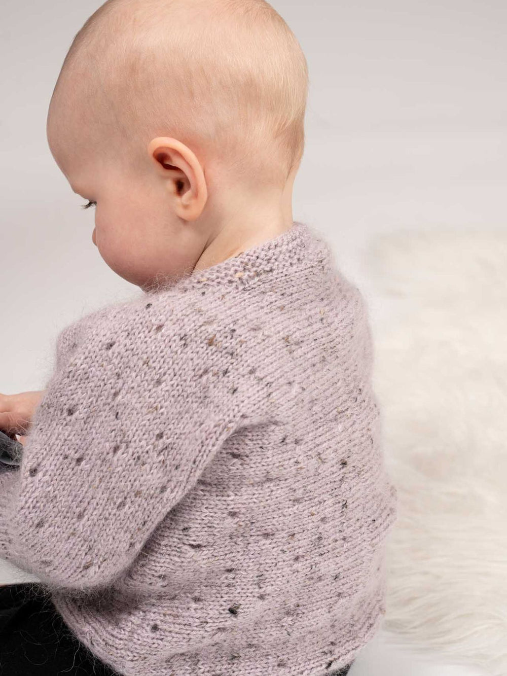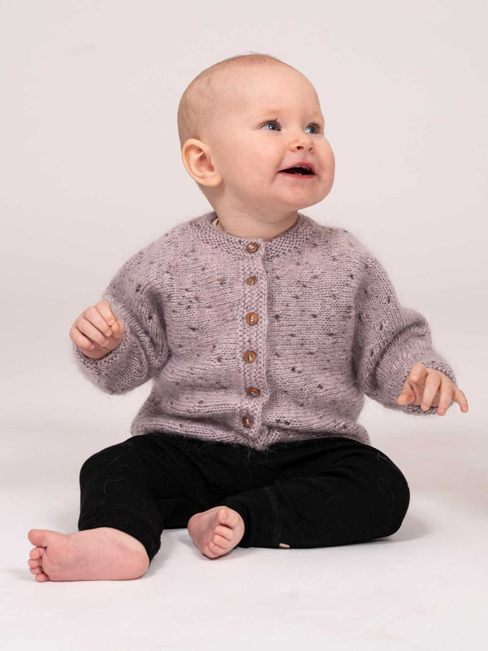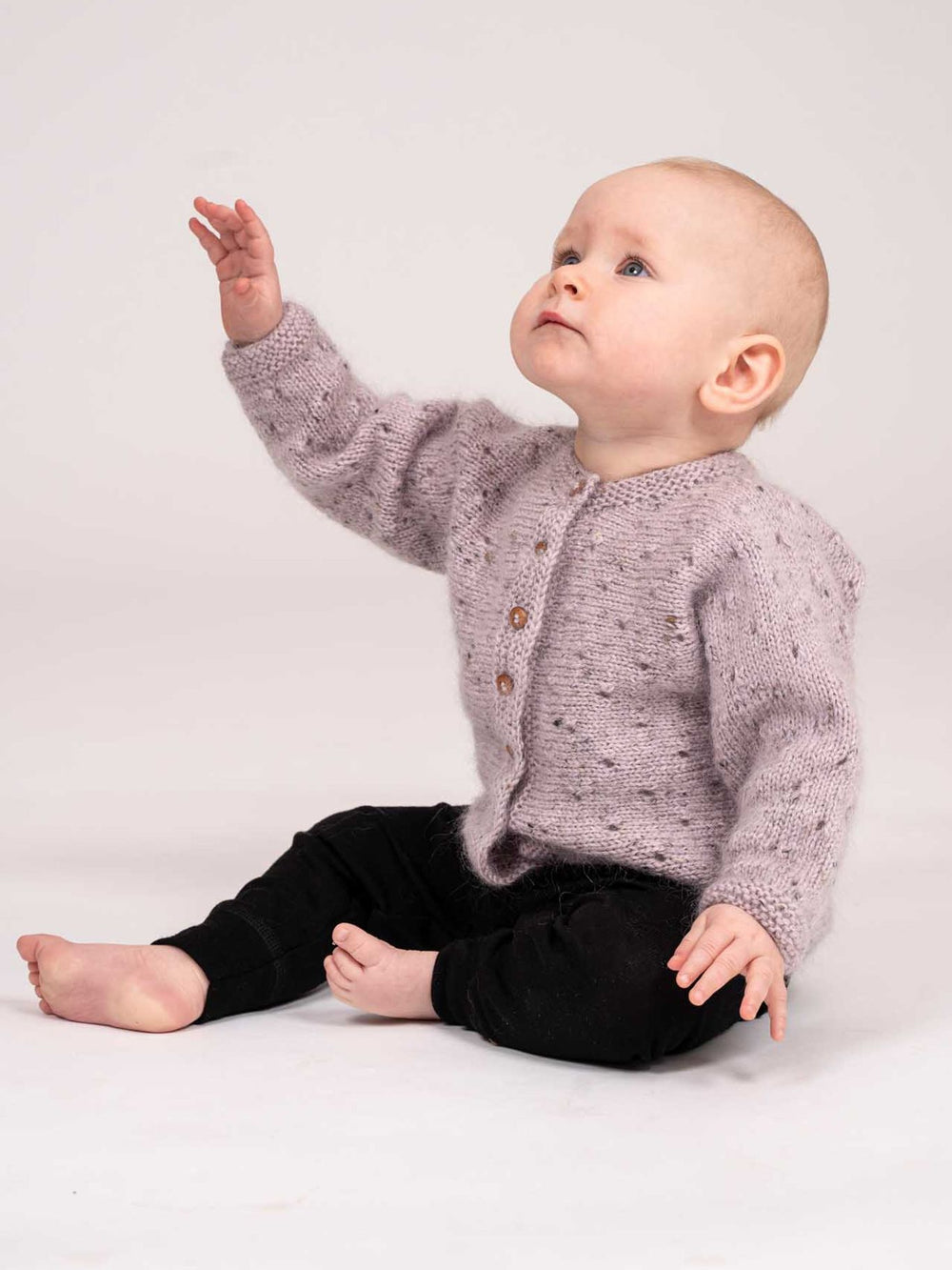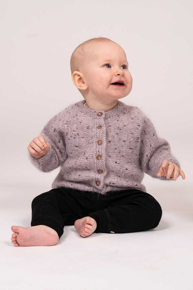 Stoppenålen cardigan strikkes i dobbeltråd i én tråd Mayflower Easy Care Tweed og én tråd Mayflower Super Kid Silk, og du skal kun bruge 2 nøgler af hver kvalitet i alle opskriftens størrelser. Kombinationen af det uldne tweedgarn og det bløde, vamsede mohairgarn giver cardiganen en skøn struktur, som føles skøn. Cardiganen er lun og vil holde den lille varm i de kolde måneder – hvad enten det er inde i huset, i barnevognen, eller når I skal afsted på tur.