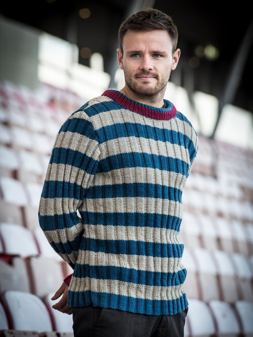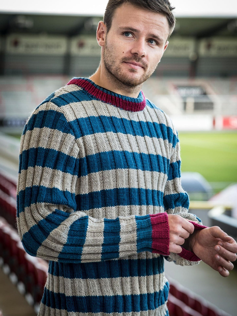 Dejlig herresweater i bred rib og med striber i sand og petrol. Hals- og ærmekanten har fået kant i en rød kontrastfarve.