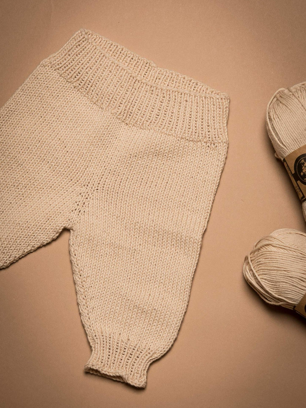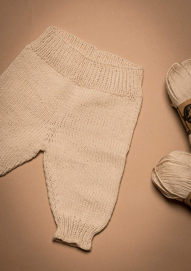 Bløde og glatstrikkede babybukser, som strikkes fra livet og ned. Rundt om livet og nederst på bukserne er der strikket ribkant.
