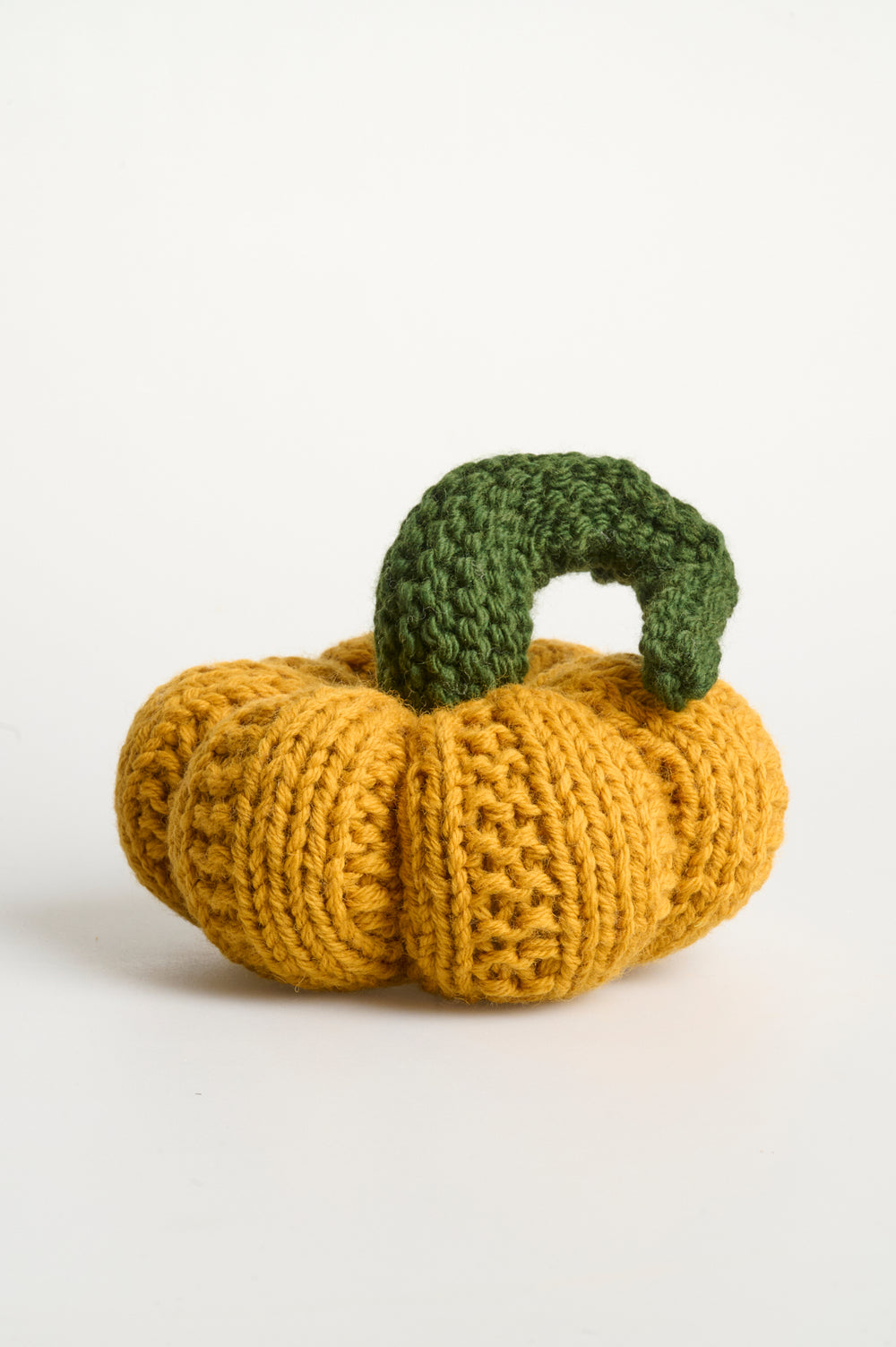 Fine, strikkede græskar, som kan pynte i efterårssæsonen og til halloween. Hvert græskar strikkes nedefra og op og monteres med en stilk.