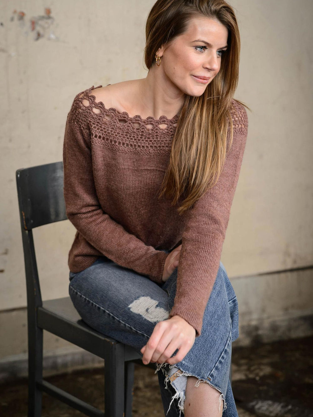 Det hæklede bærestykke er blusens primære detalje, og bærestykket er særdeles smukt med sit blondeudseende, hvilket gør blusen mere sommerlig. Af samme grund er resten af blusen lavet i retstrik, så bærestykket bliver yderligere fremhævet.