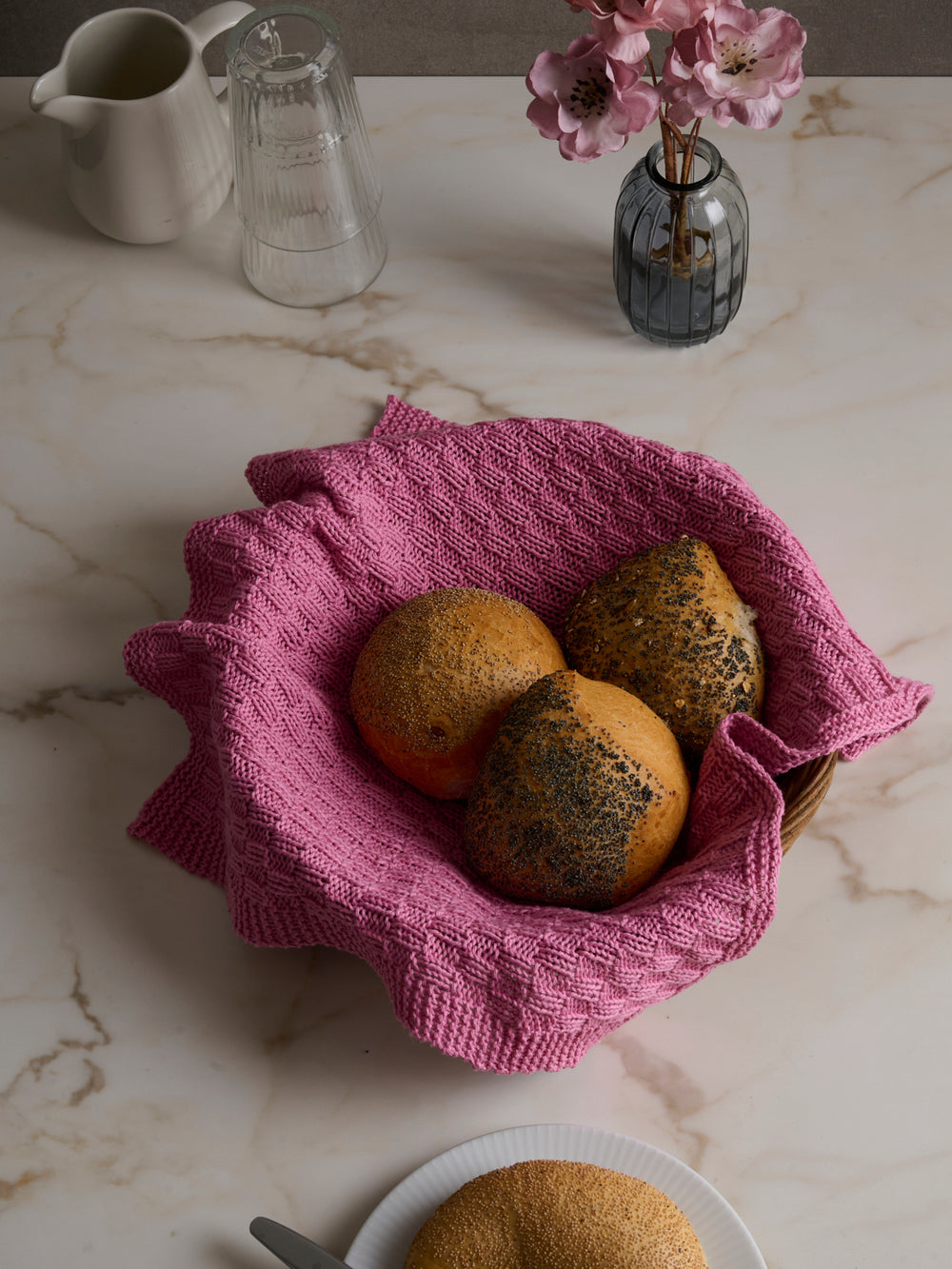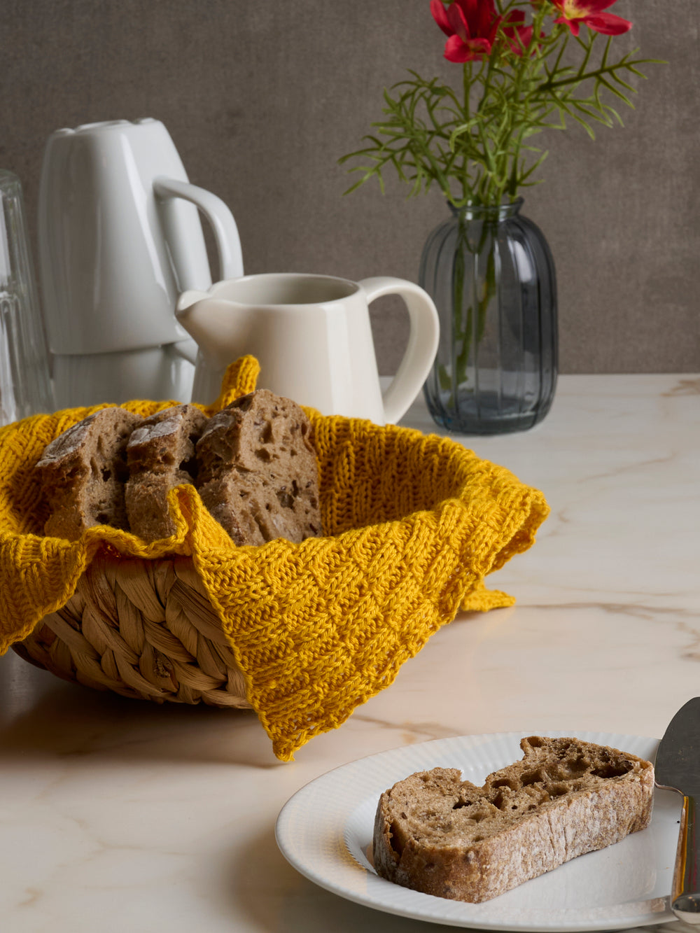 Brødservietten strikkes i det GOTS-certificerede bomuldsgarn Mayflower Alexandria, som er en lækker, økologisk version af Cotton 8/4.