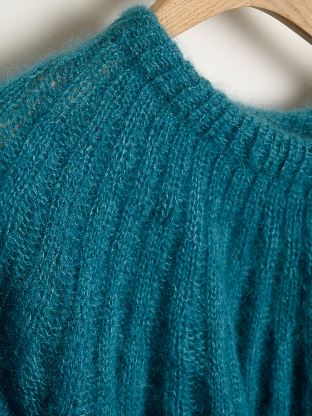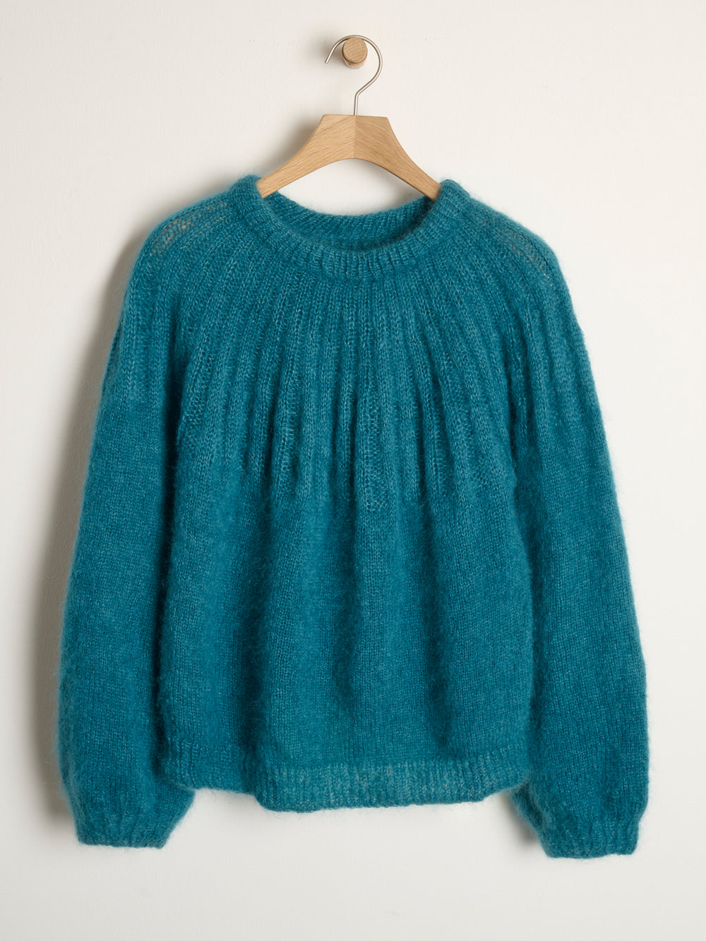 Sunday sweater - Mohair Edition fra PetiteKnit er strikket oppefra og ned med et flot strukturmønster i bærestykket.