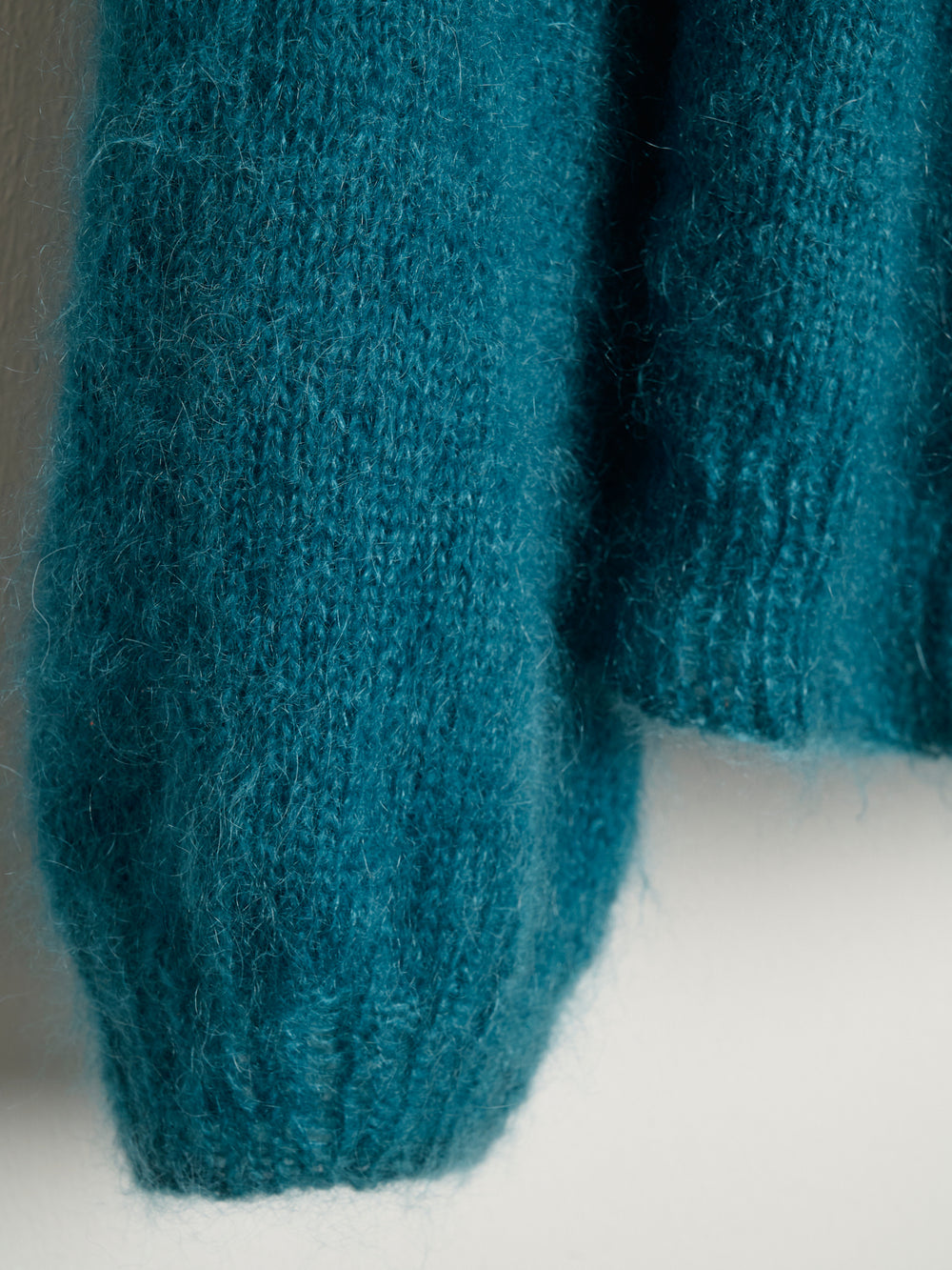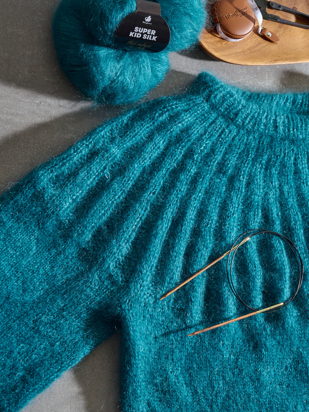Sweateren er strikket med to tråde igennem hele arbejdet, Mayflower Super Kid Silk, hvilket giver et virkelig lækkert resultat. Som alternativ til mohairgarnet Super Kid Silk kan du også bruge alpakablandingen Mayflower Elba eller Mayflower Premium Cassandra, som er spundet på bl.a. silke og alpaka.