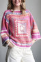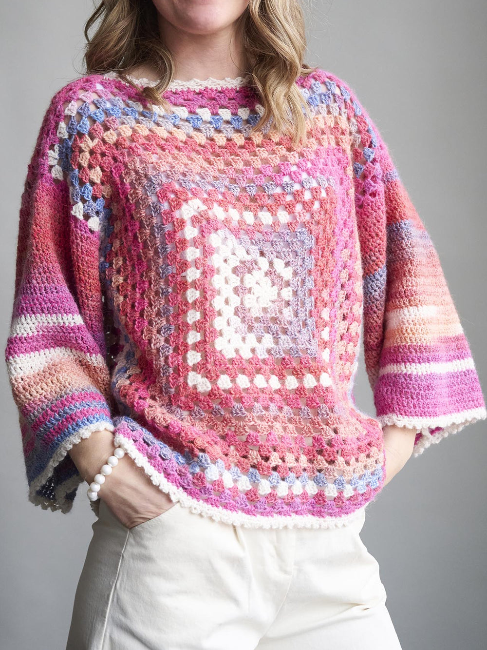 En hæklet sweater, der tager oldemorfirkanterne til nye dimensioner. Denne trøje består nemlig af to hæklede firkanter, som til gengæld er meget store. Ryggen og forstykket begynder med en magisk ring og bliver til to store firkanter, der hækles sammen i siderne og skuldrene. Ud fra ærmegabet hækles ærmerne i stangmasker, hvilket giver en god kontrast til oldemorforkanterne på ryg og forstykke. Arbejdet afsluttes med en smuk picotkant på ærmer, hals og nederst på blusen.