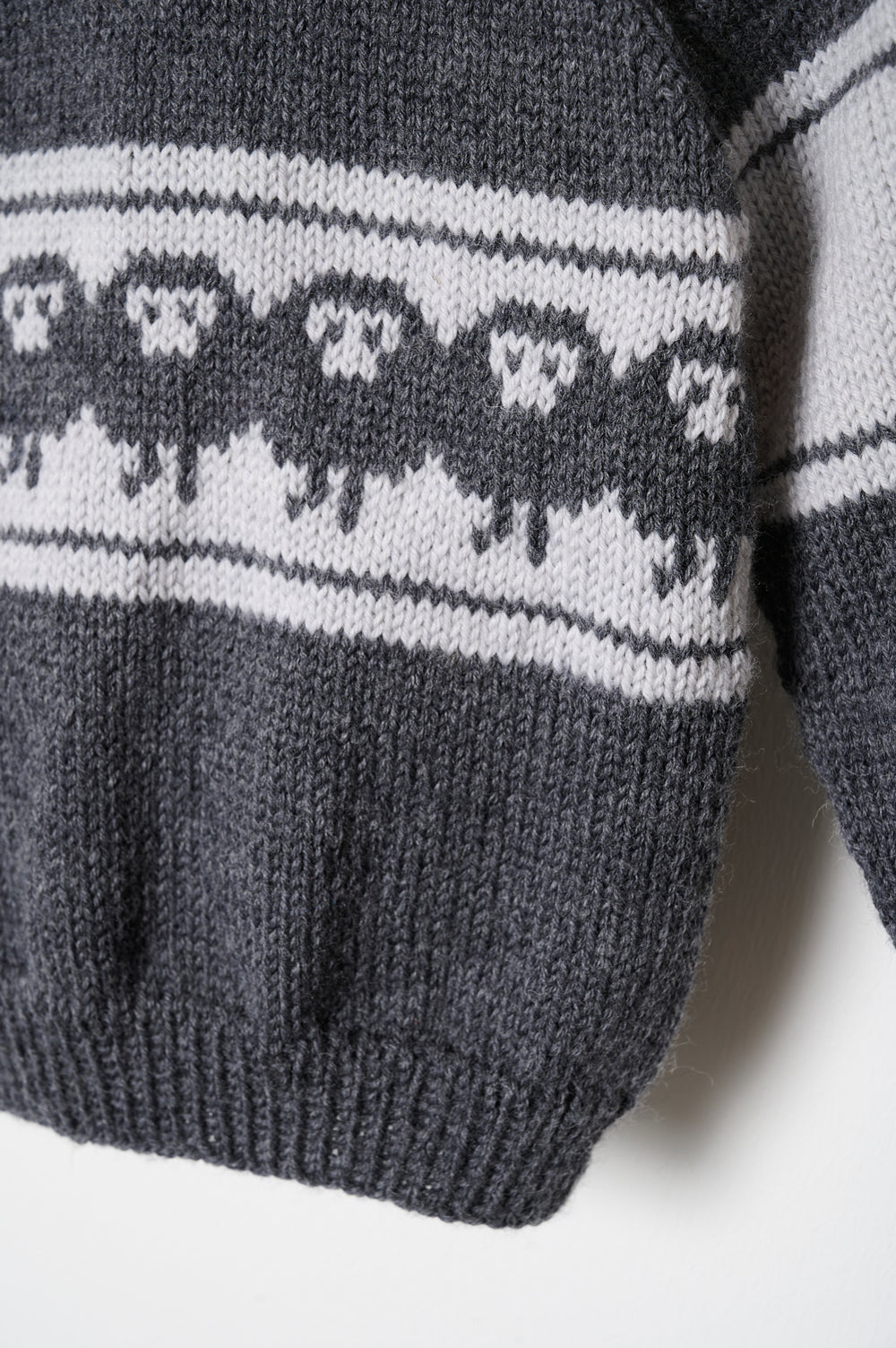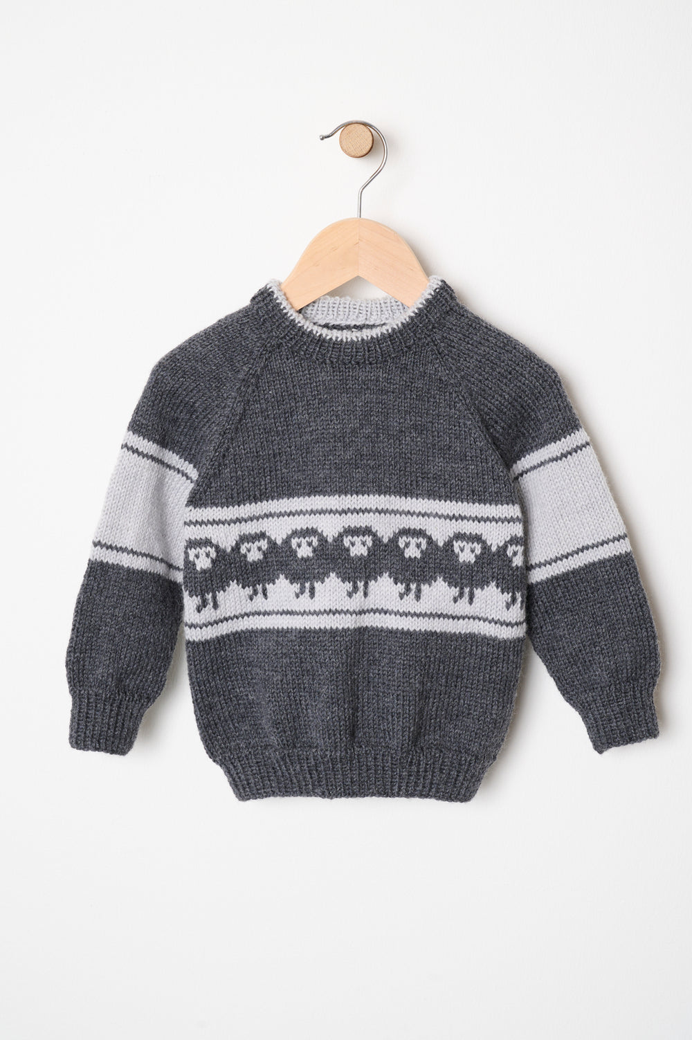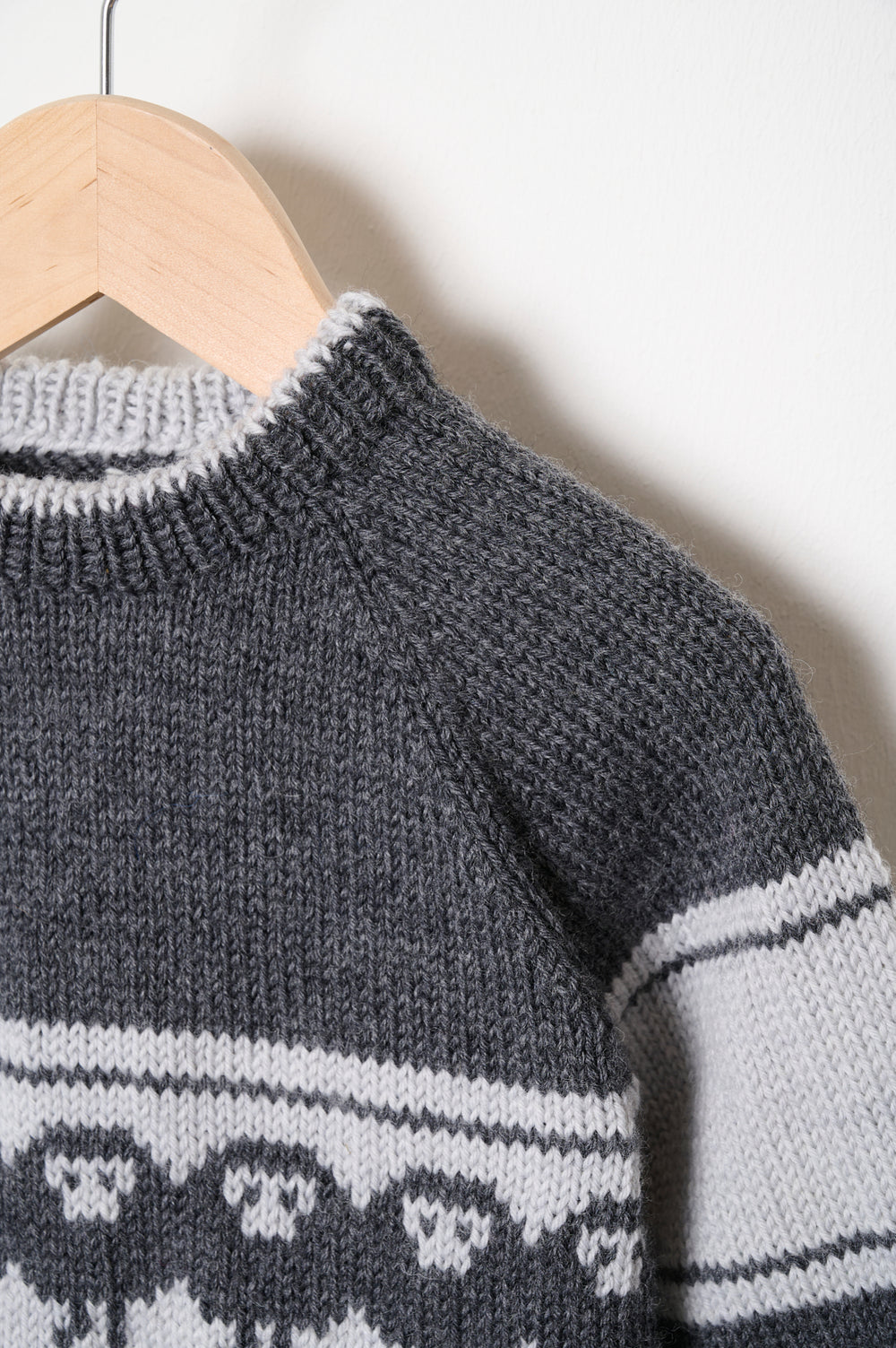 Sød børnesweater, som har mønsterbort med får på kroppen. Sweateren strikkes i glatstrik nedefra og op.