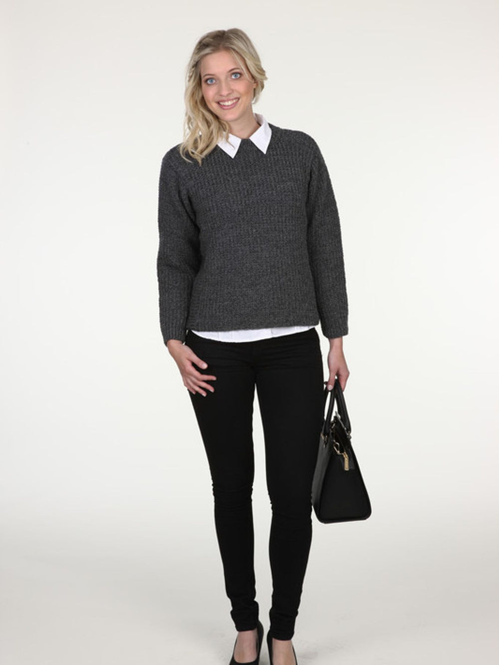 Flot fyldig sweater i perlerib, som strikkes i dobbeltgarn. Perleribben opstår ved at strikke ret på retsiden og skiftevis én ret og én vrang på vrangsiden.