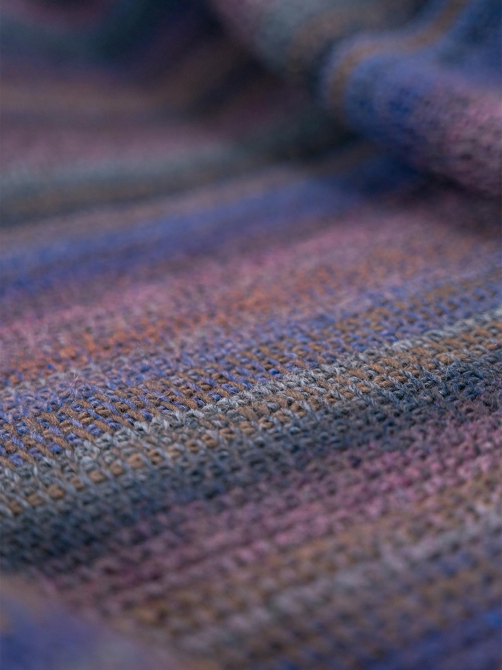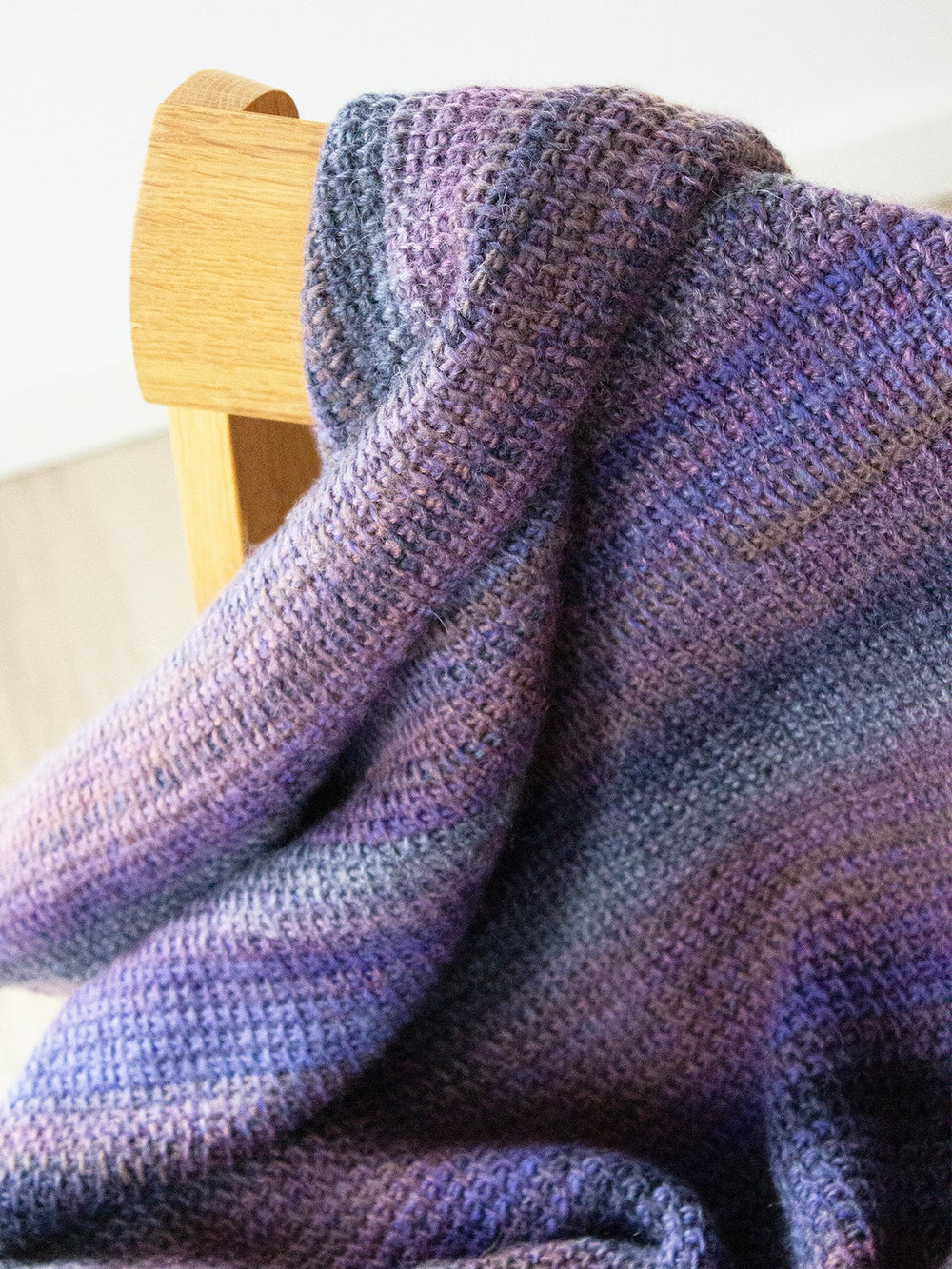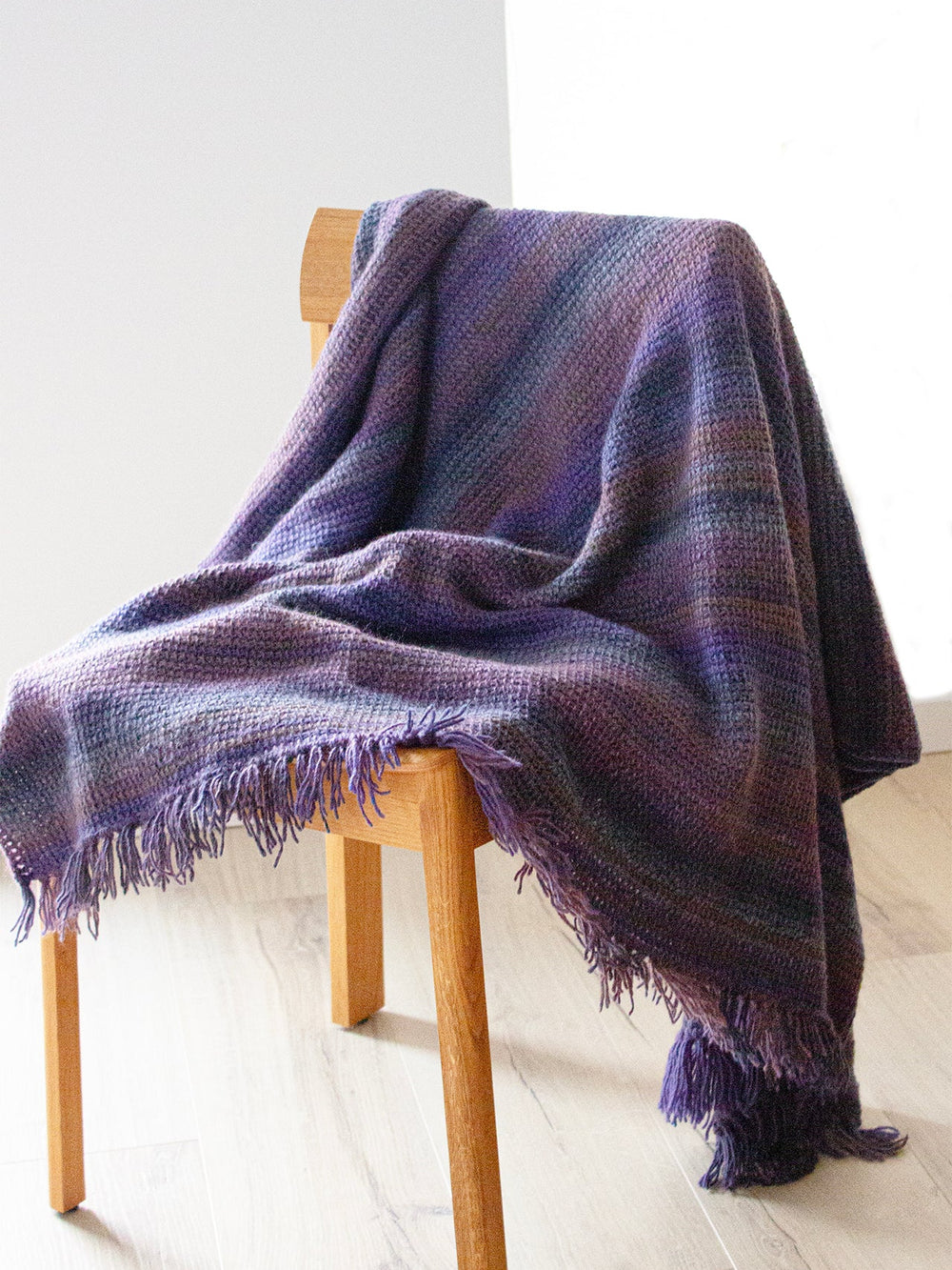 Tæppet er lavet i tunesisk hækling, som er en kombination af strik og hækling med en hakkenål eller lang hæklenål, der giver et smukt look med en vævet struktur. Det bløde og uldne garn Mayflower Taormina har løbende farveskift i nuancer, der passer godt sammen og giver et helt særligt udtryk. Garnet er en blød og slidstærk uldblanding spundet på bl.a. alpakafibre. Plaiden skal vaskes i hånden med uldvaskemiddel.