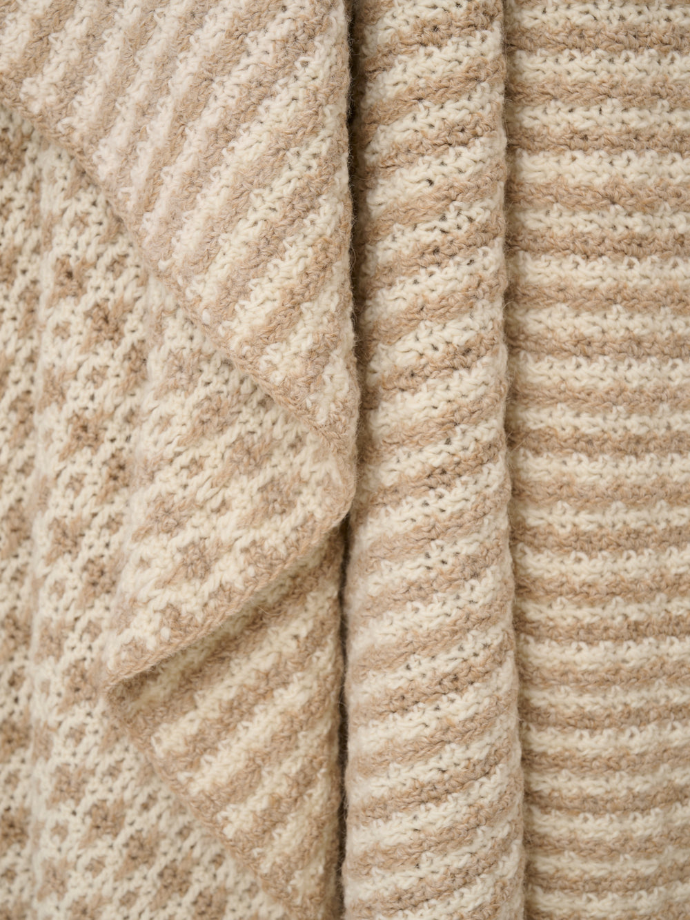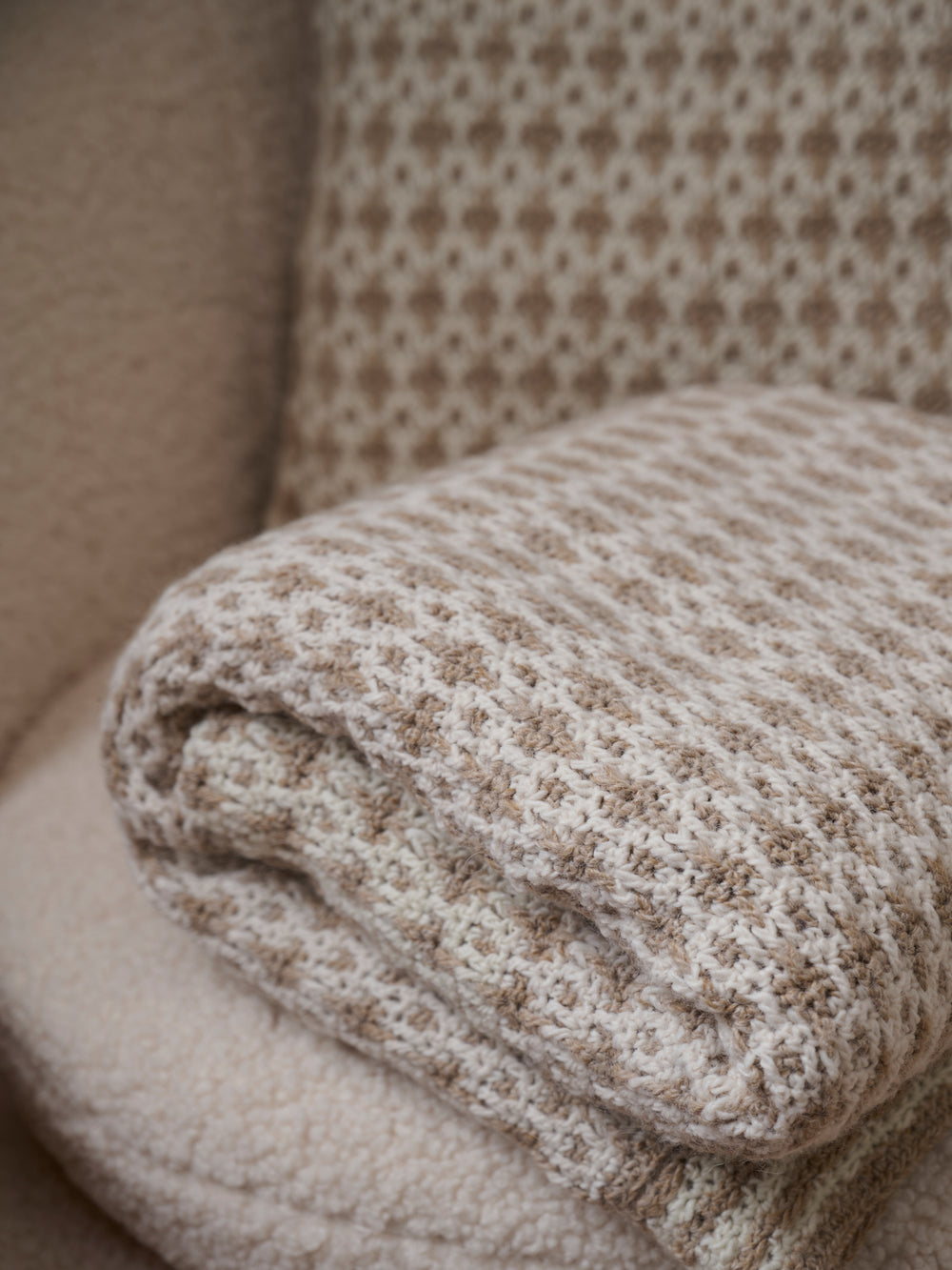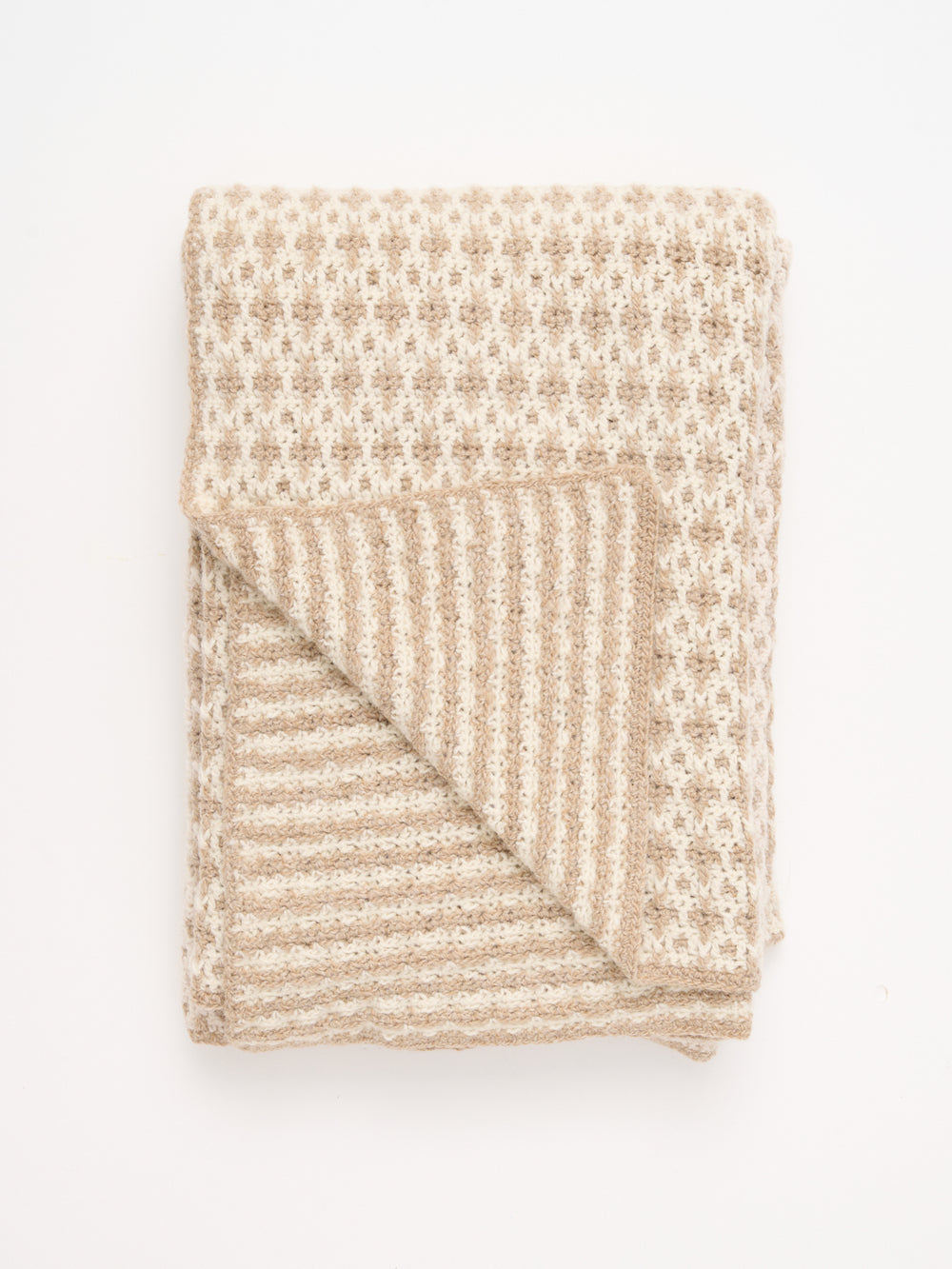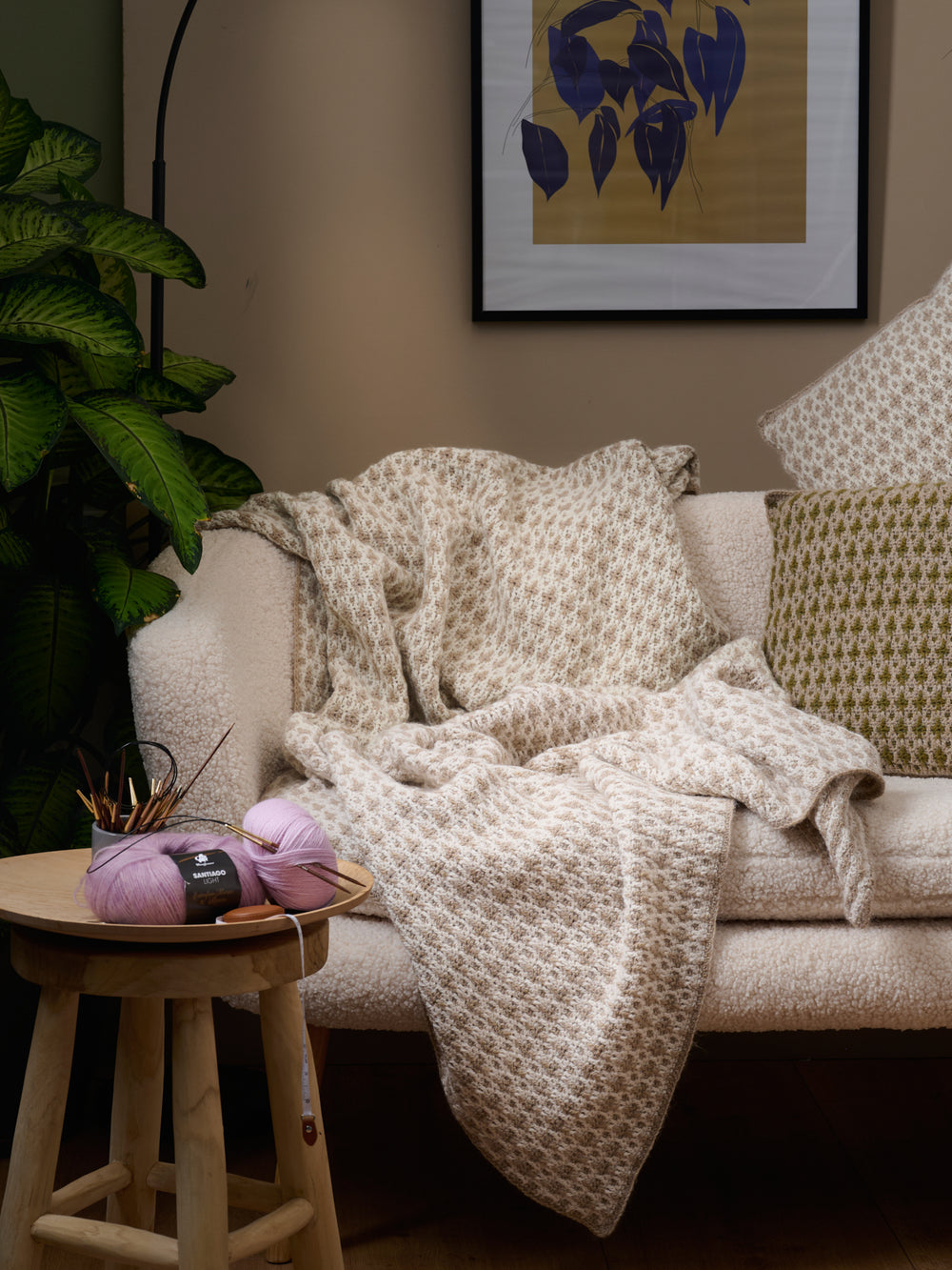 Plaiden hækles med den bløde alpakablanding Mayflower Taormina Shade, og det færdige tæppe måler ca. 120 x 170 cm.