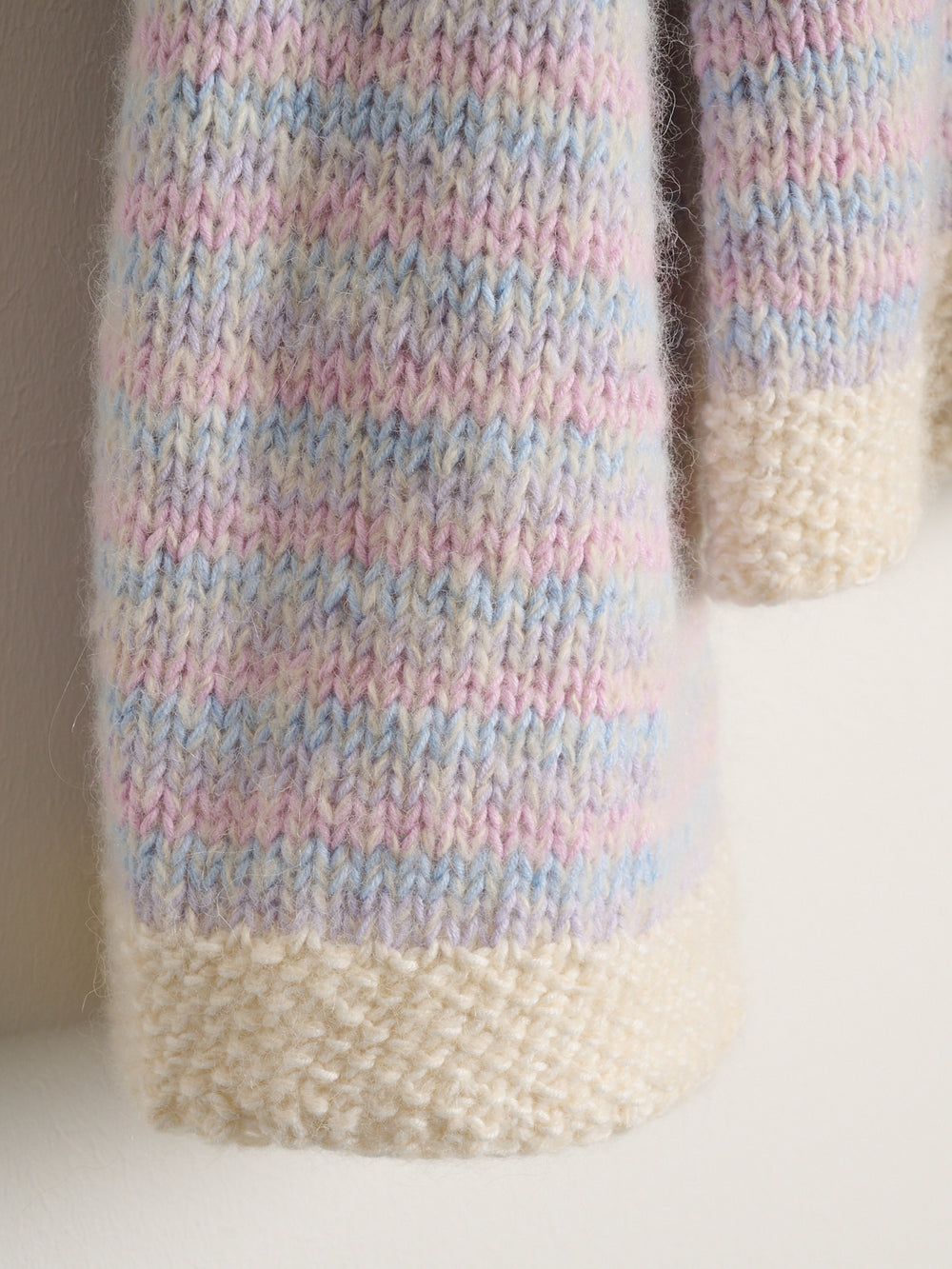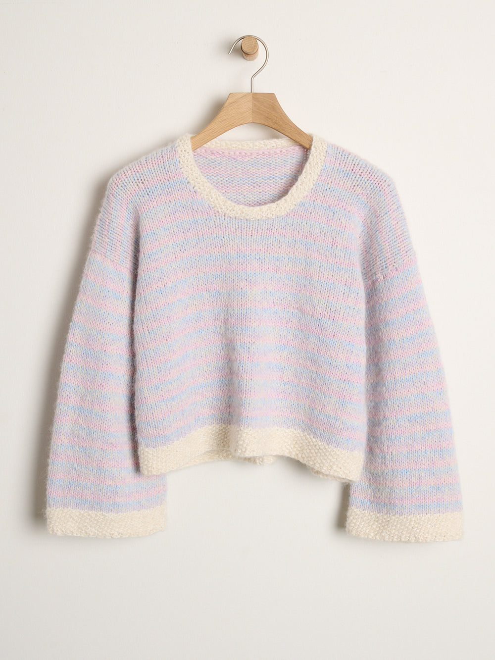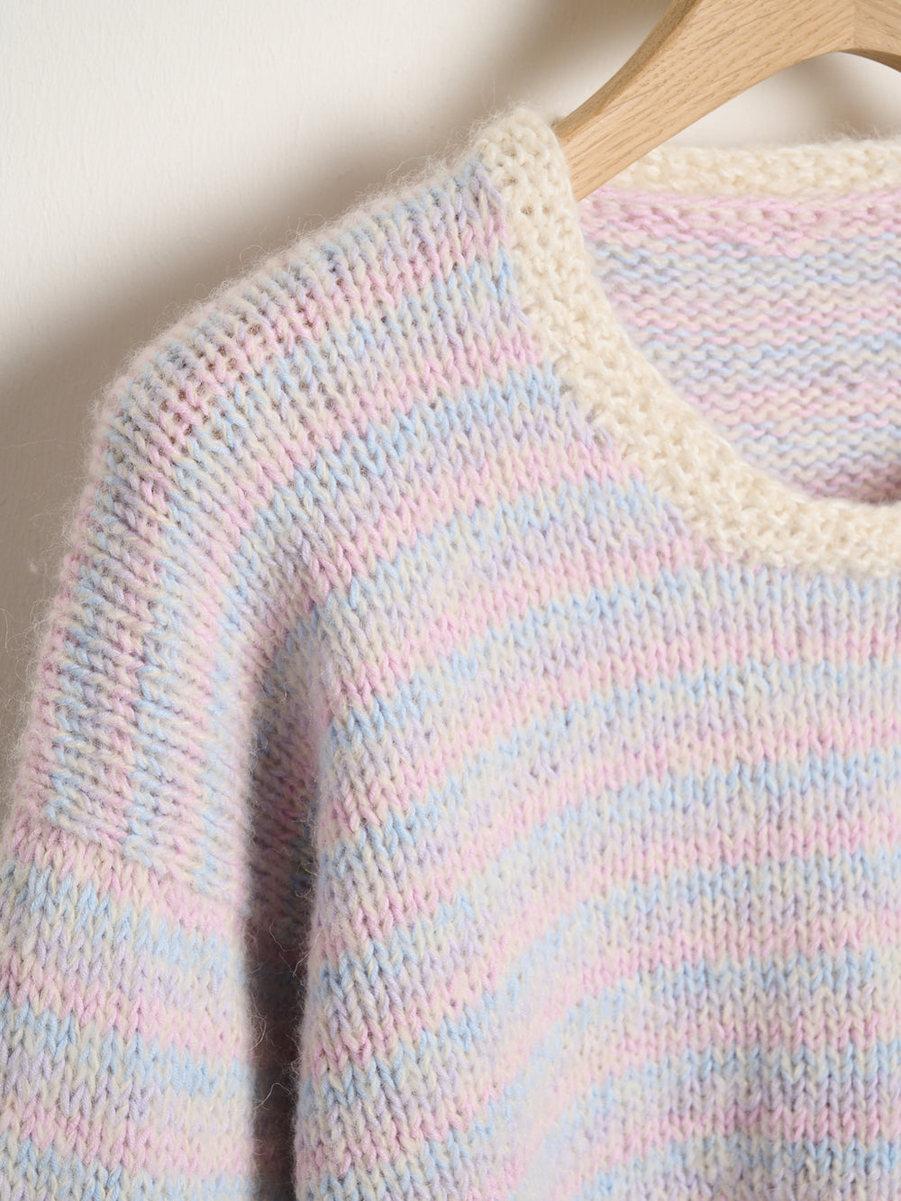 Thora sweater er et blødt og stribet design, som strikkes med 2 tråde: 1 tråd Mayflower Premium Valentina + 1 tråd Mayflower Alliance. Igennem hele arbejdet skifter du løbende farven i Alliance, hvilket giver det flotte, stribede udtryk. Sweateren har kanter i perlestrik som en fin detalje.