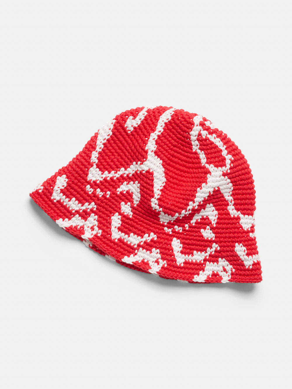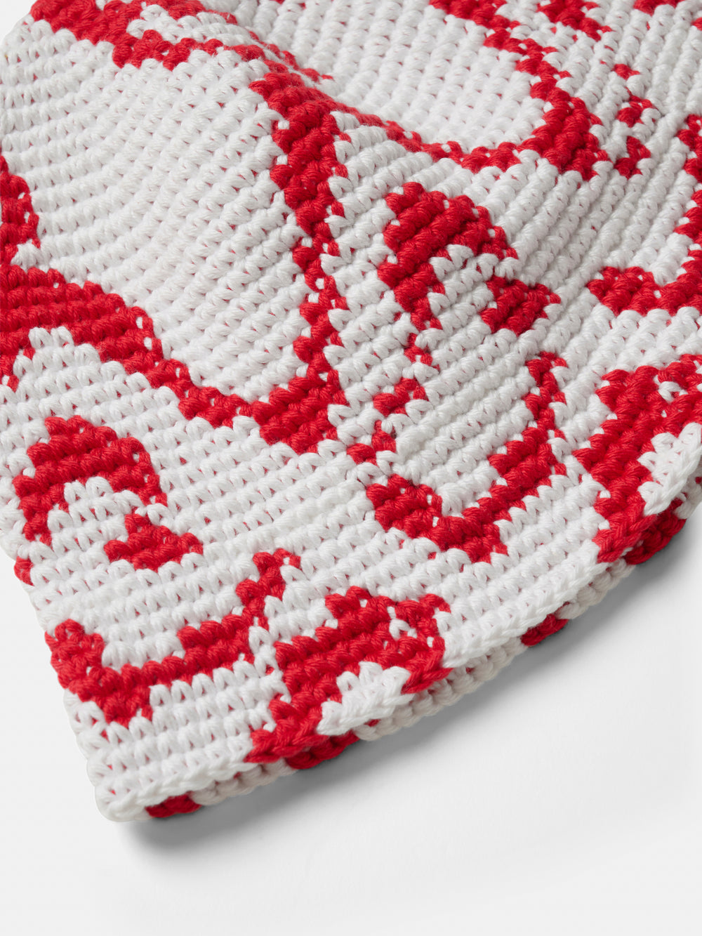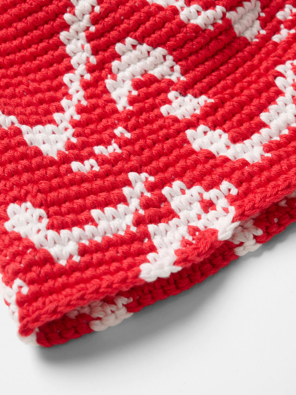Den røde sommerhat er hæklet i farverne 025 og 001.