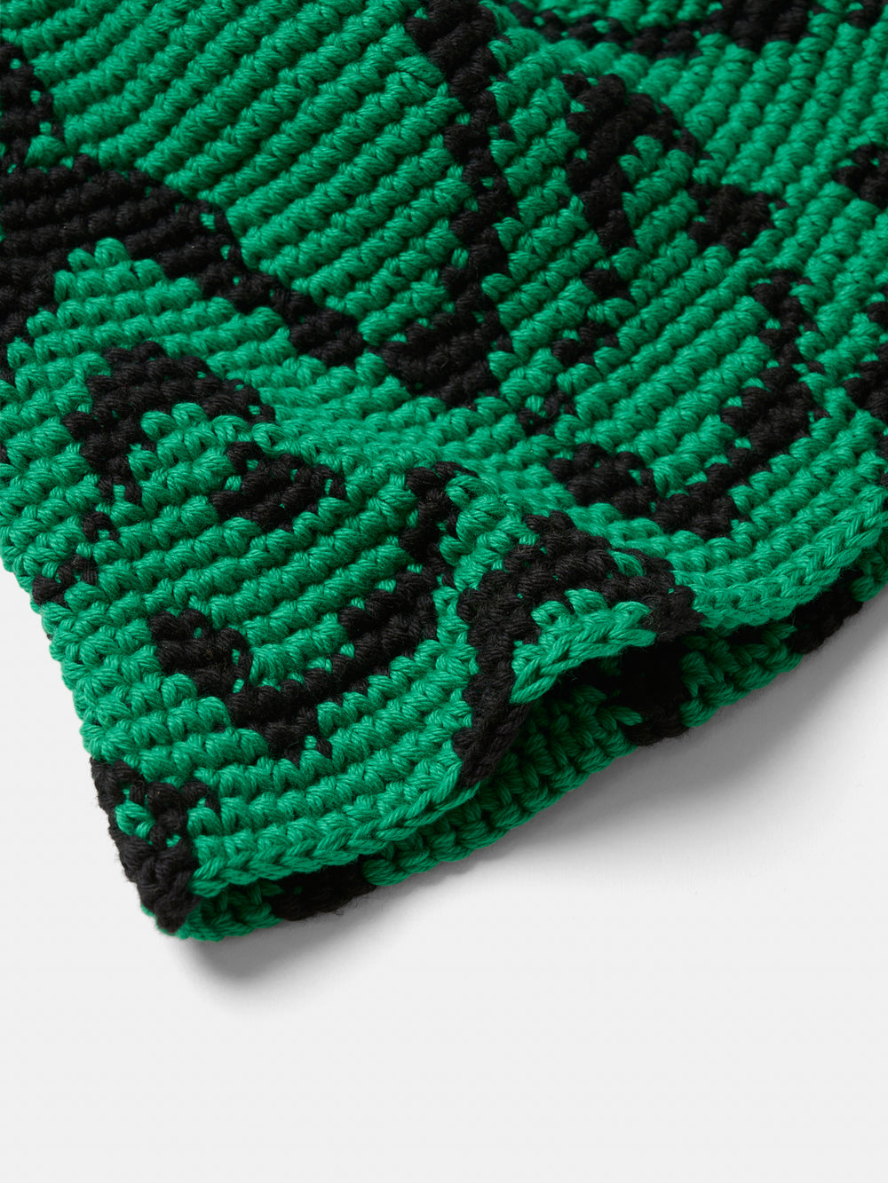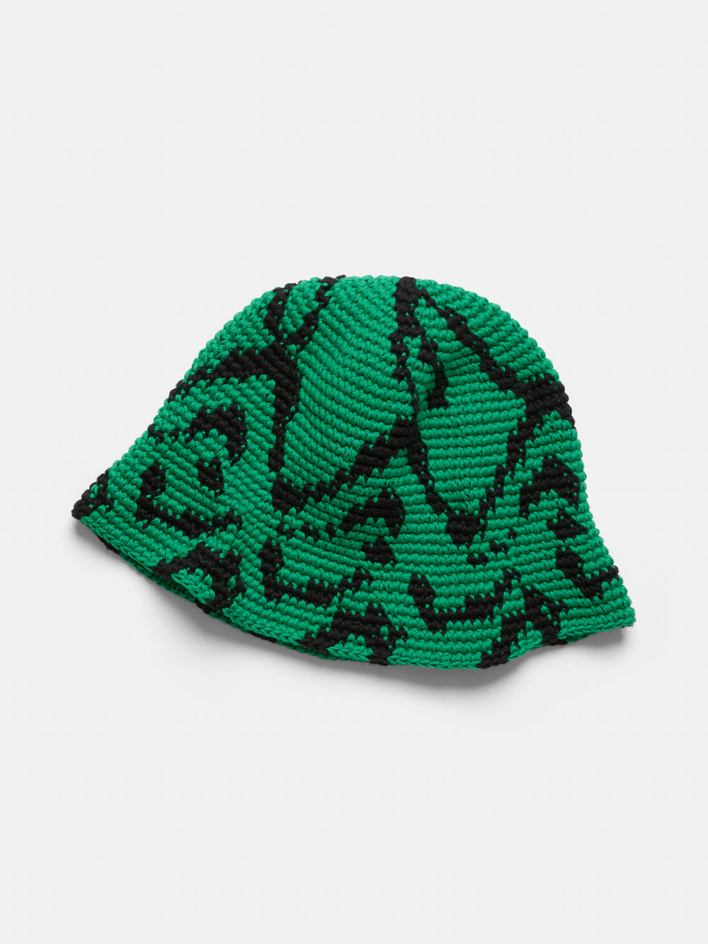 Den grønne sommerhat er hæklet i farverne 017 og 008.