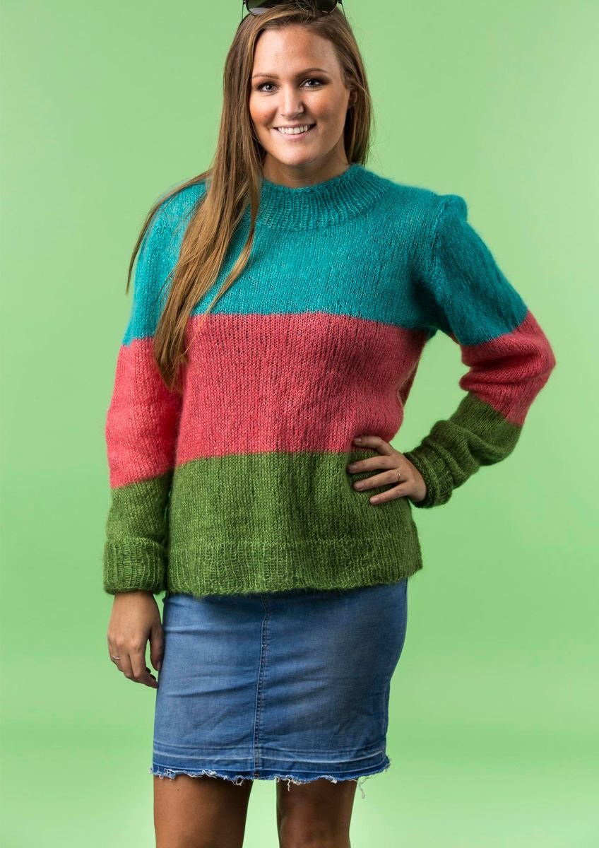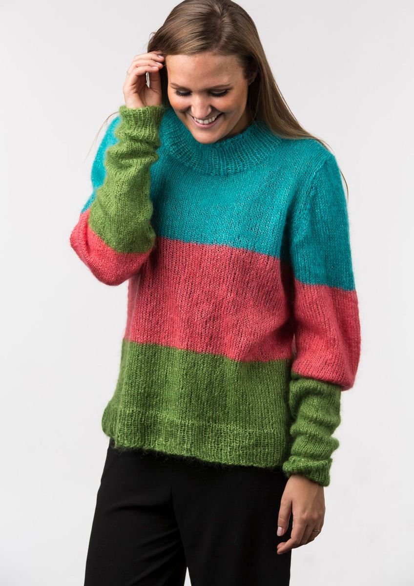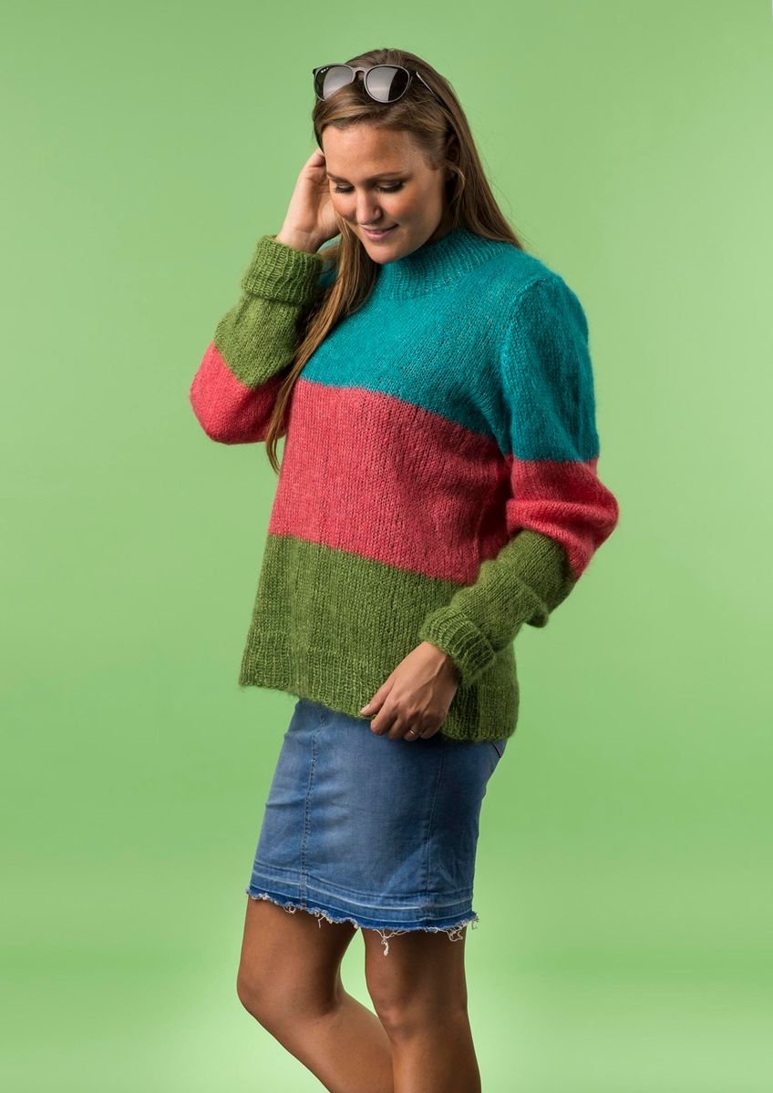 Denne strikkede sweater skiller sig ud fra mængden med sine friske farver, som virkelig springer i øjnene. Sweateren er lavet med tre lange farveskift, så farveeffekten ikke bliver for voldsom. Det gør den til en flot og stilfuld sweater, som har sin helt egen personlighed.