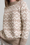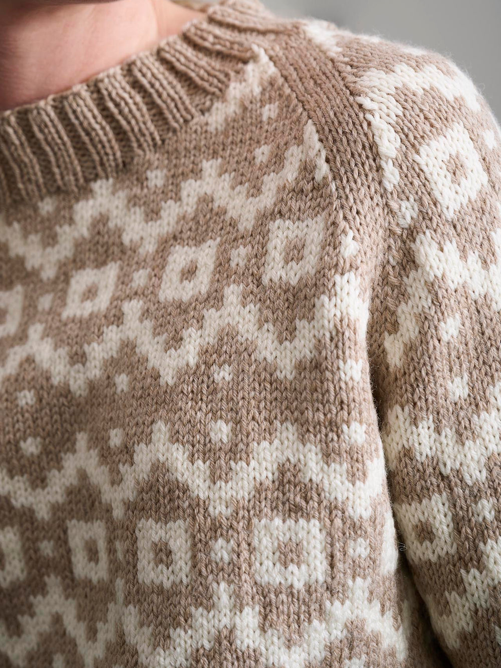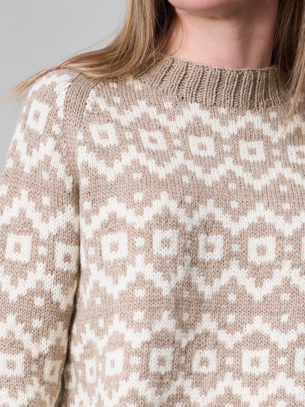 Trille sweateren har et gennemgående mønster på både krop og ærmer, som strikkes i kontrastfarve. Sweateren strikkes nedefra og op på pind 3,5 mm, og mønsteret strikkes efter diagram.