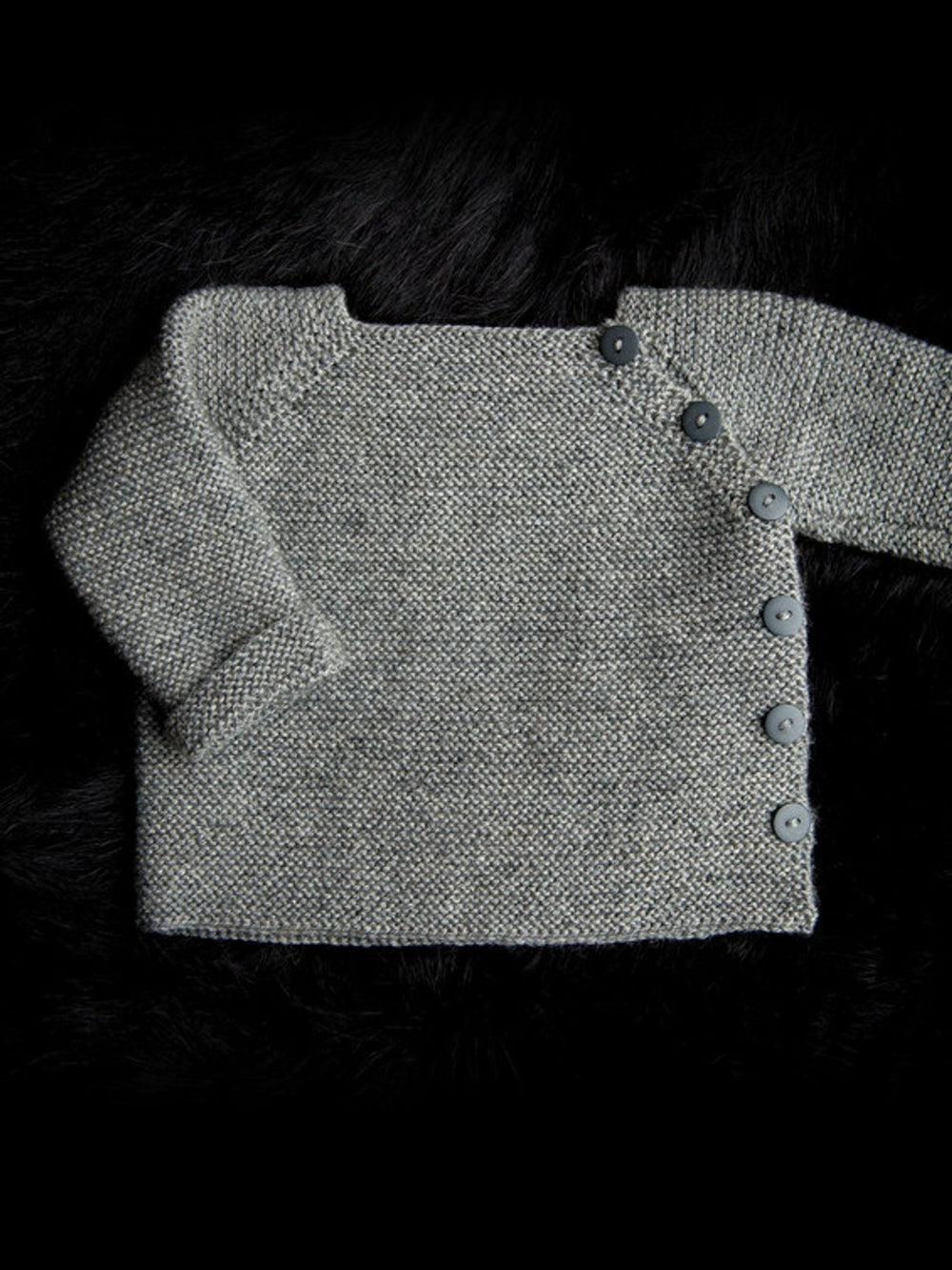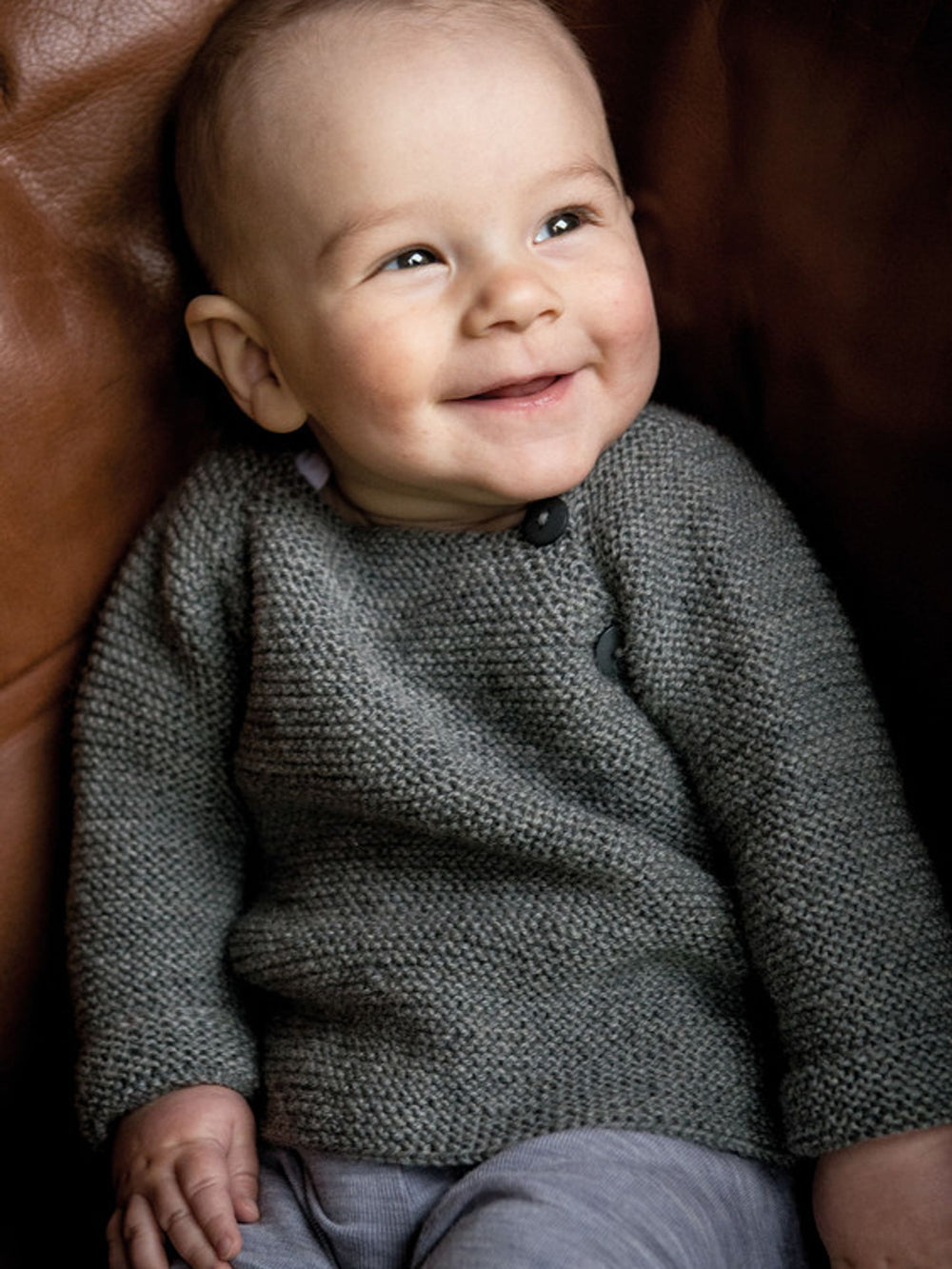Begyndervenlig babytrøje med sidelukning, hvilket gør den meget praktisk, både når den skal af og på. Trøjen har en dejlig struktur, som gør den både behagelig og lun at have på.