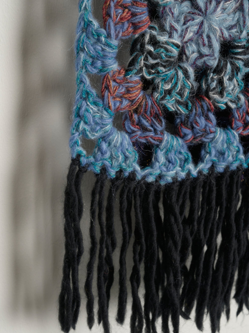 Tversted tørklædet har også en god og vamset fylde, da det hækles med fire tråde af varierende tykkelse. Der bruges nemlig også flere forskellige garnkvaliteter, hvilket også har en stor betydning for farvespillet i det endelige resultat, da det bliver et flot miks af både fibre og nuancer.