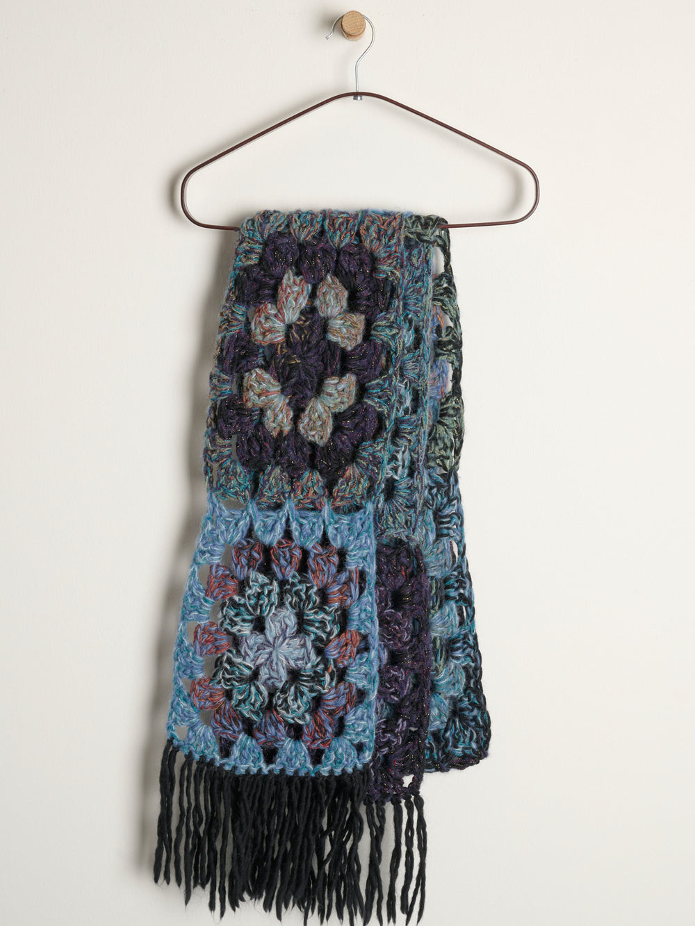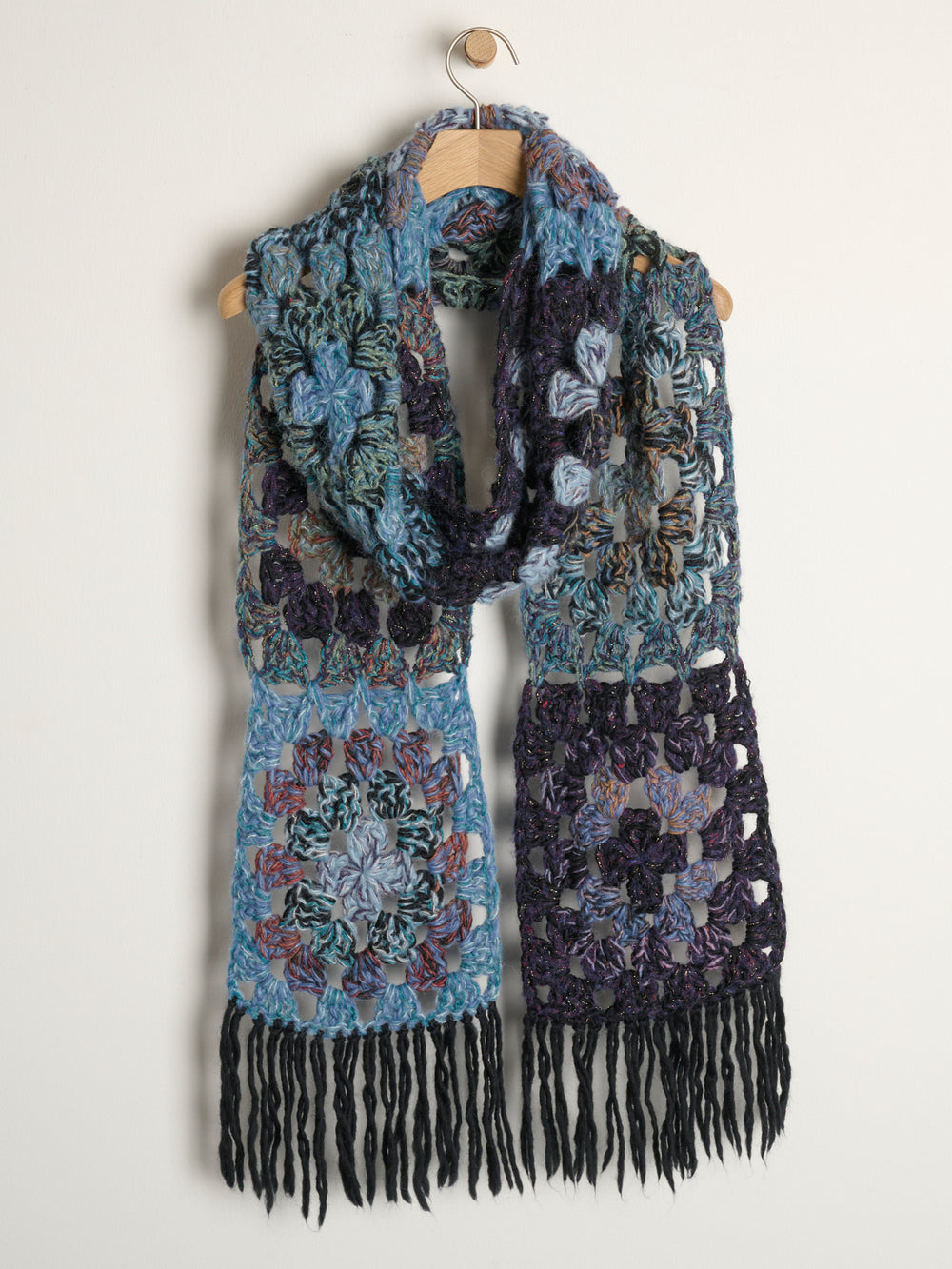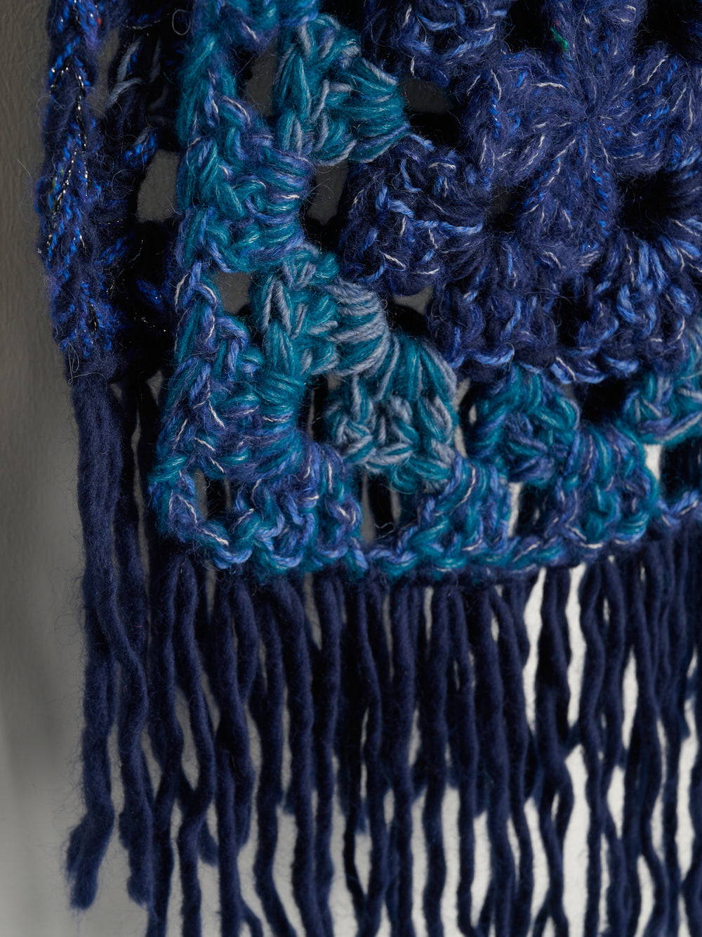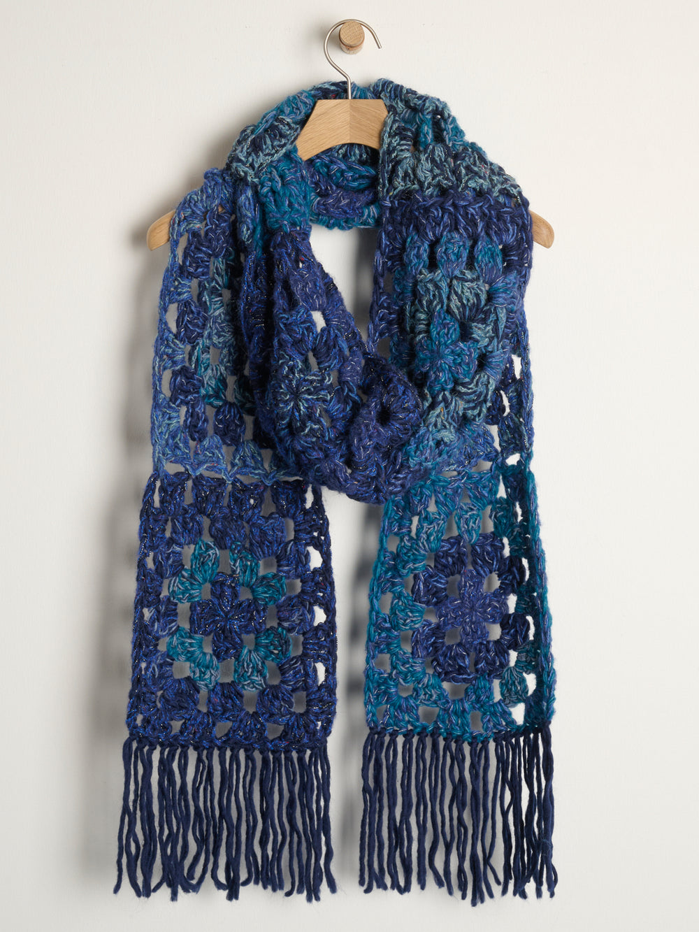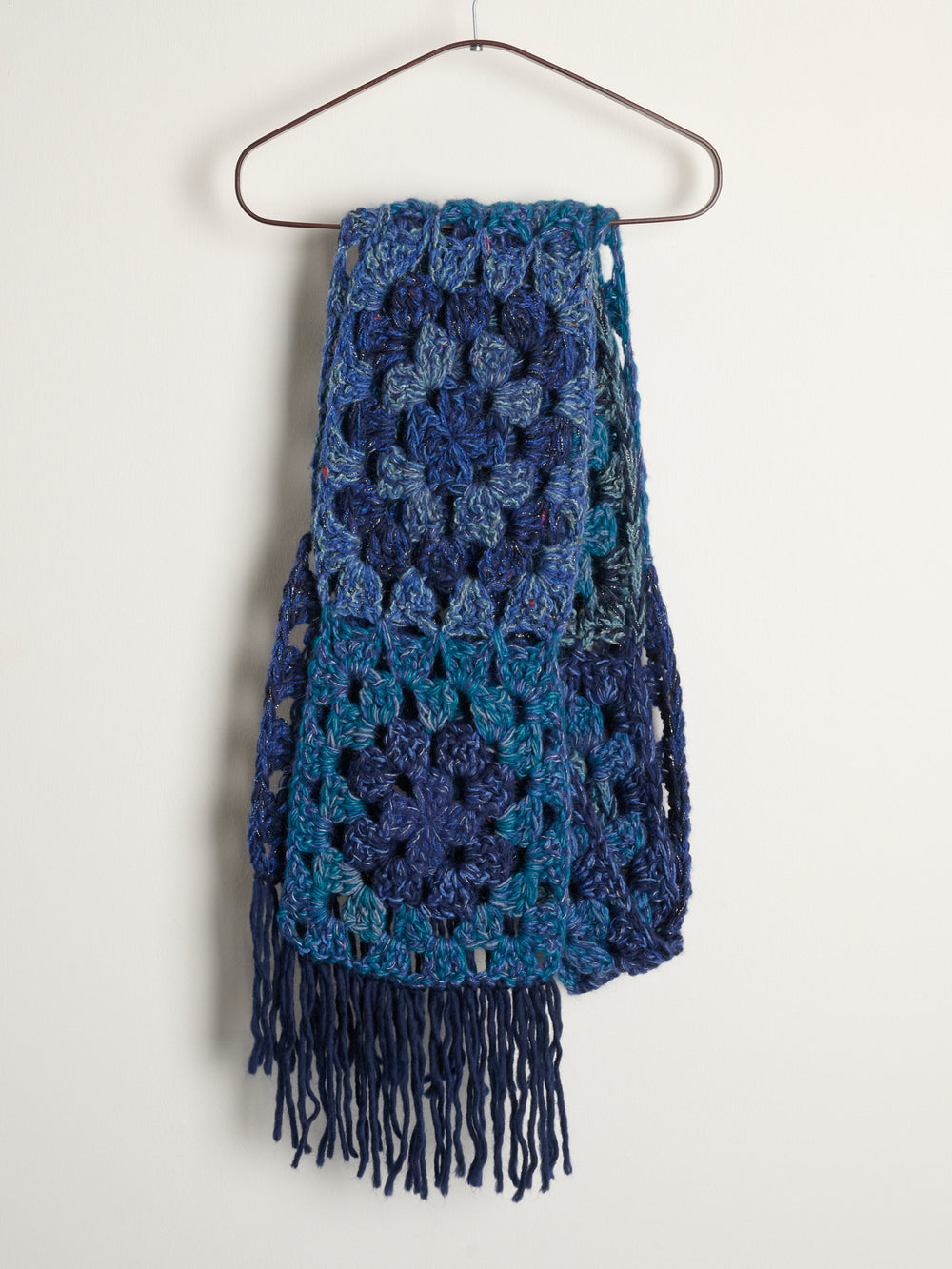 OBS: I den blå version af tørklædet er der brugt følgende farver: Taormina, fv. 23 (1 ngl.), Molly Fine, fv. 23 (2 ngl.), Casablanca Lux, fv. 13 og 15 (1 ngl.), Glitter, fv. 3 (2 ngl.), Santiago Light, fv. 13 (1 ngl.), Premium Valentina, fv. 6 (1 ngl.), Premiun Athena, fv. 8 (1 ngl.), Premiun Cassandra, fv. 13 (1 ngl.)